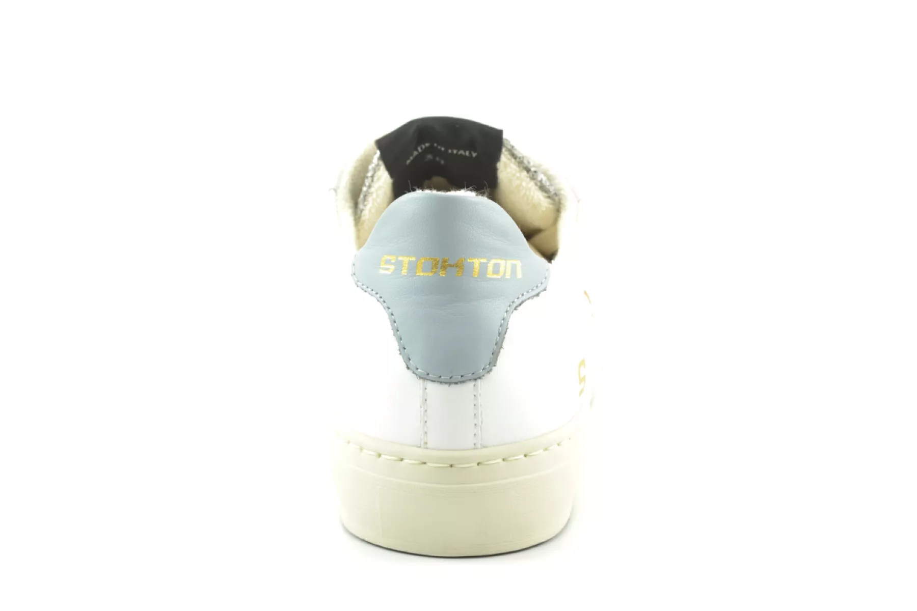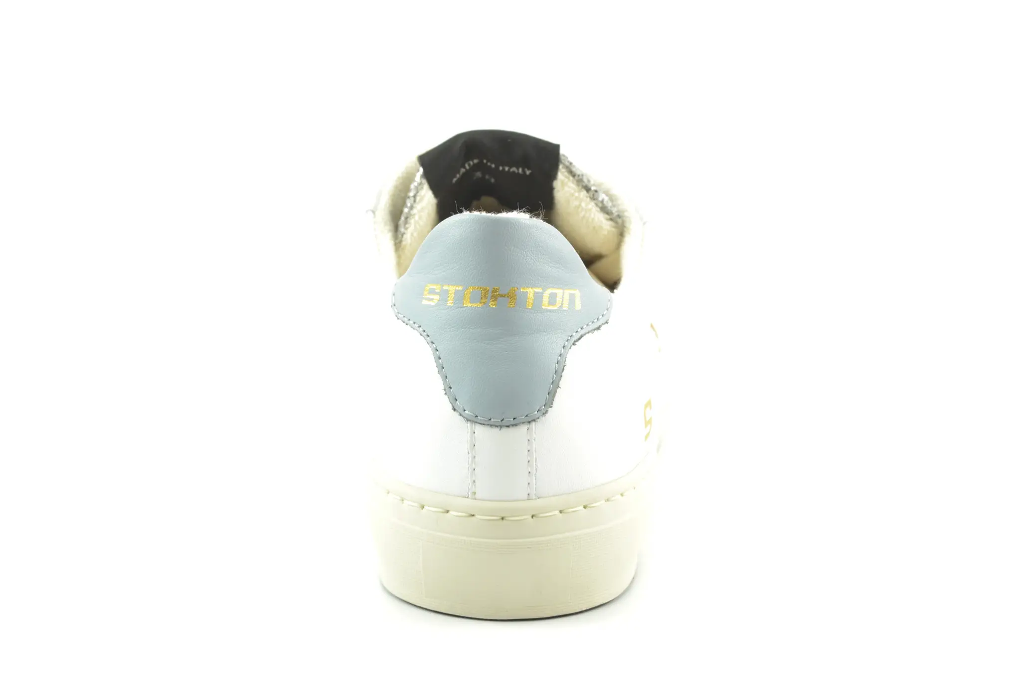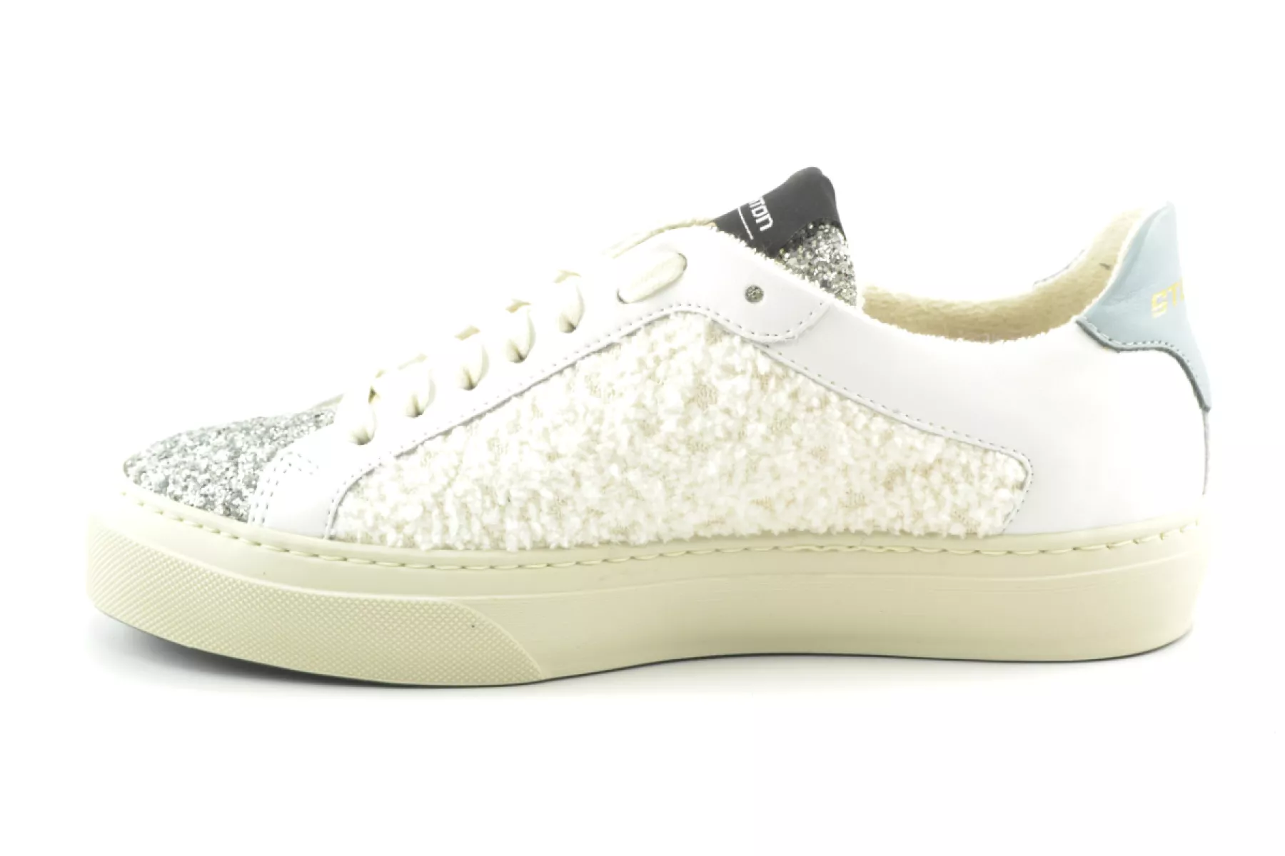 Het Italiaanse merk Stokton maakt gebruik van luxe materialen. Deze mooie luxe damessneaker is daar een voorbeeld van. Deze sneaker met kuipzool van het Italiaanse merk Stokton heeft een bruin suede detail op de zijkant en zilverkleurige glitters op de tong en neus. De sneaker is afgewerkt met een logo op de tong en hiel. Deze sneaker valt groot uit. Twijfel je over de maat? Neem dan een maat kleiner.