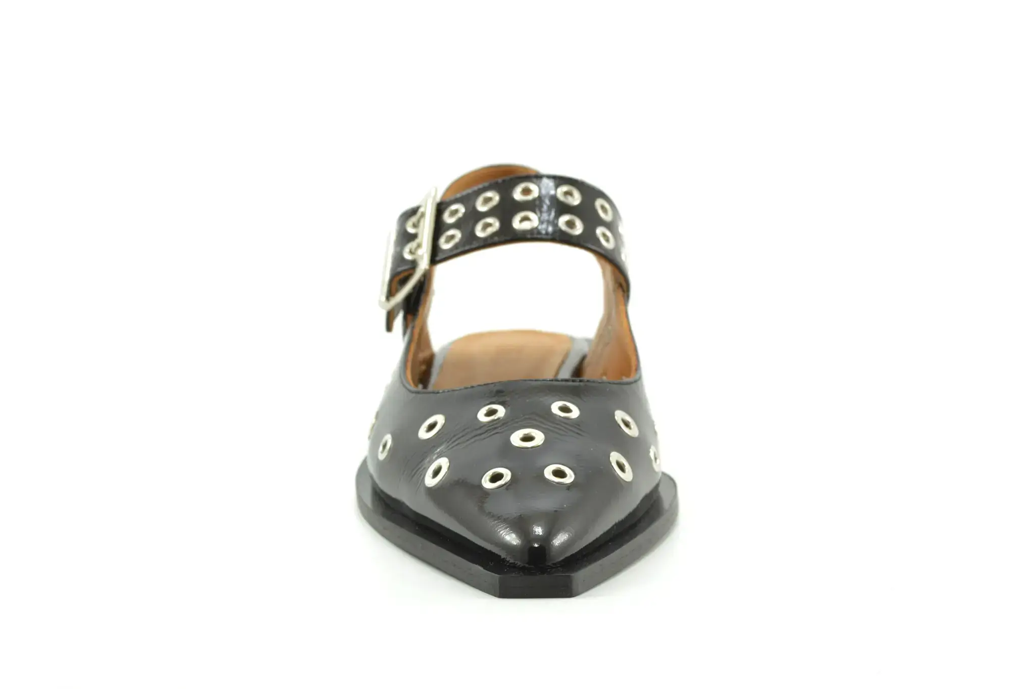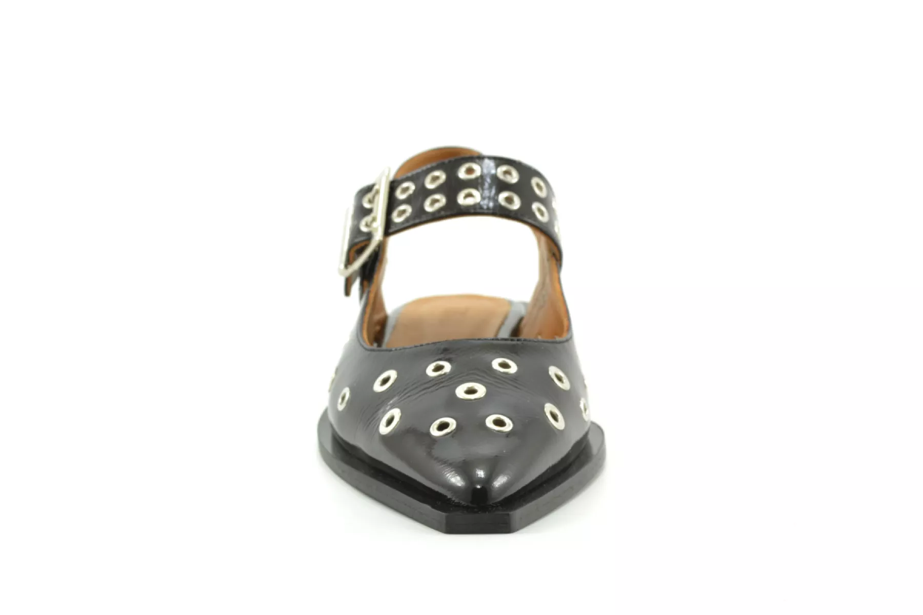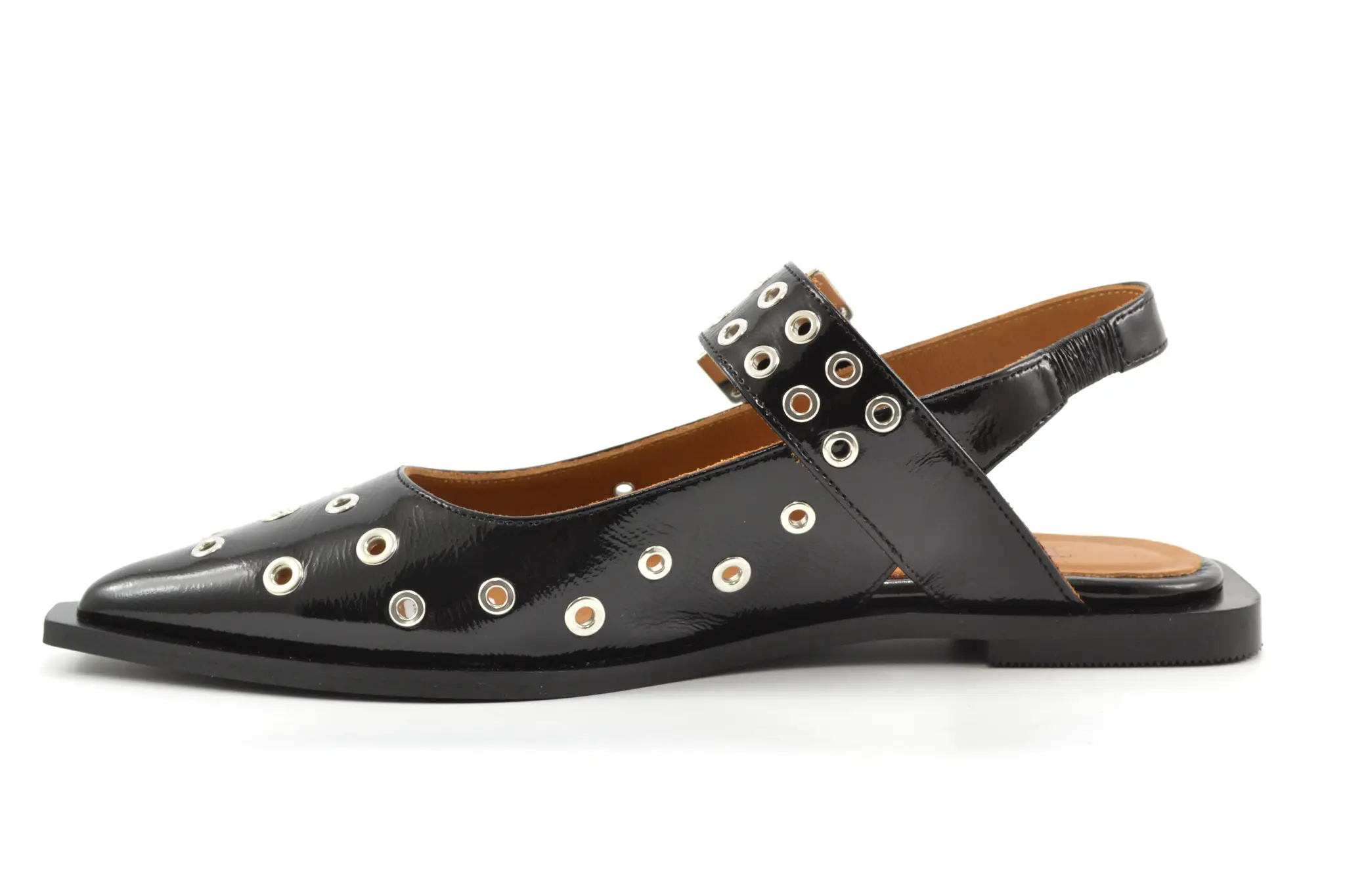 als je op zoek bent naar een krachtige en vrouwelijke look, heb je je ballerina’s van het Spaanse merk Toral gevonden… Deze zwarte lak ballerina’s hebben een zilverkleurige details, spitse leest en een slingback. En dat maakt deze mooie schoenen super trendy. Make a statement!