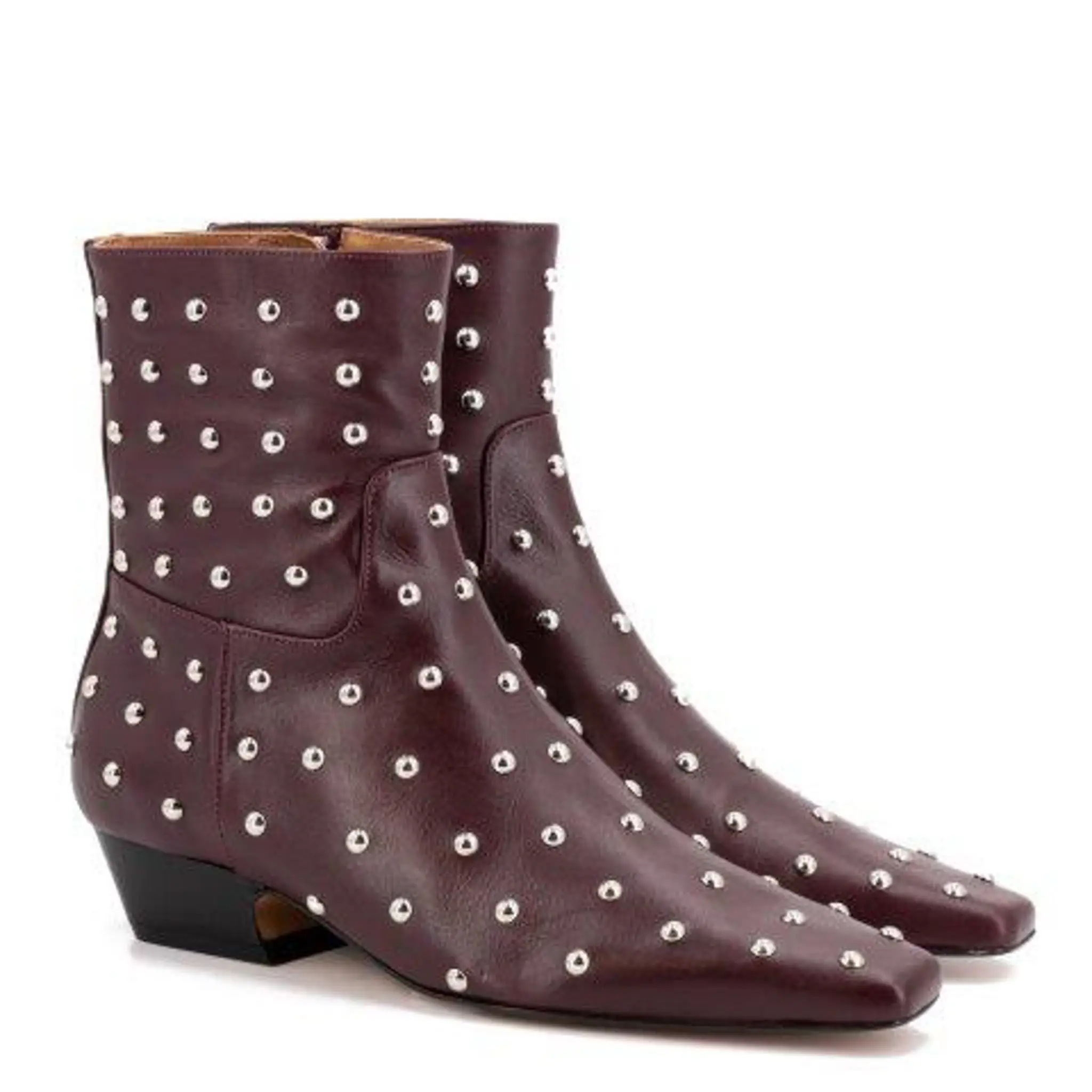 als je op zoek bent naar een krachtige en vrouwelijke look, heb je je laarsjes van het Spaanse merk Toral gevonden… Deze bordo leren enkellaarsjes hebben een iets langere leest met carré neus en zijn bezet met zilverkleurige studs en dat maakt deze laarsjes super trendy. Make a statement!