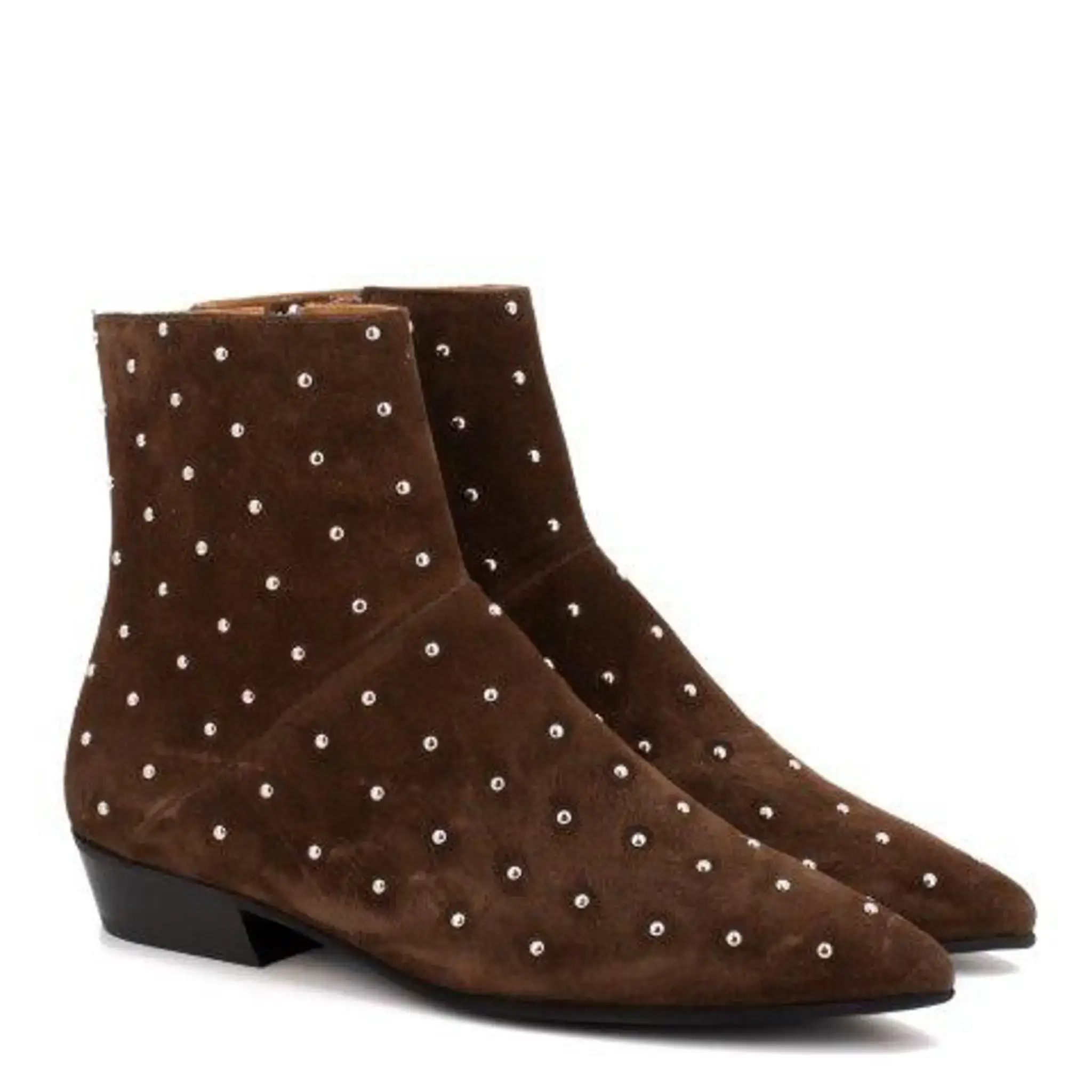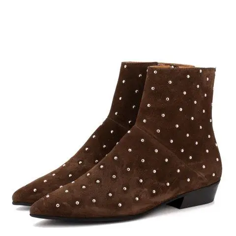 als je op zoek bent naar een krachtige en vrouwelijke look, heb je je laarsjes van het Spaanse merk Toral gevonden… Deze bruine enkellaarsjes hebben een spitse leest en zijn bezet met zilverkleurige studs en dat maakt deze laarsjes super trendy. Make a statement!