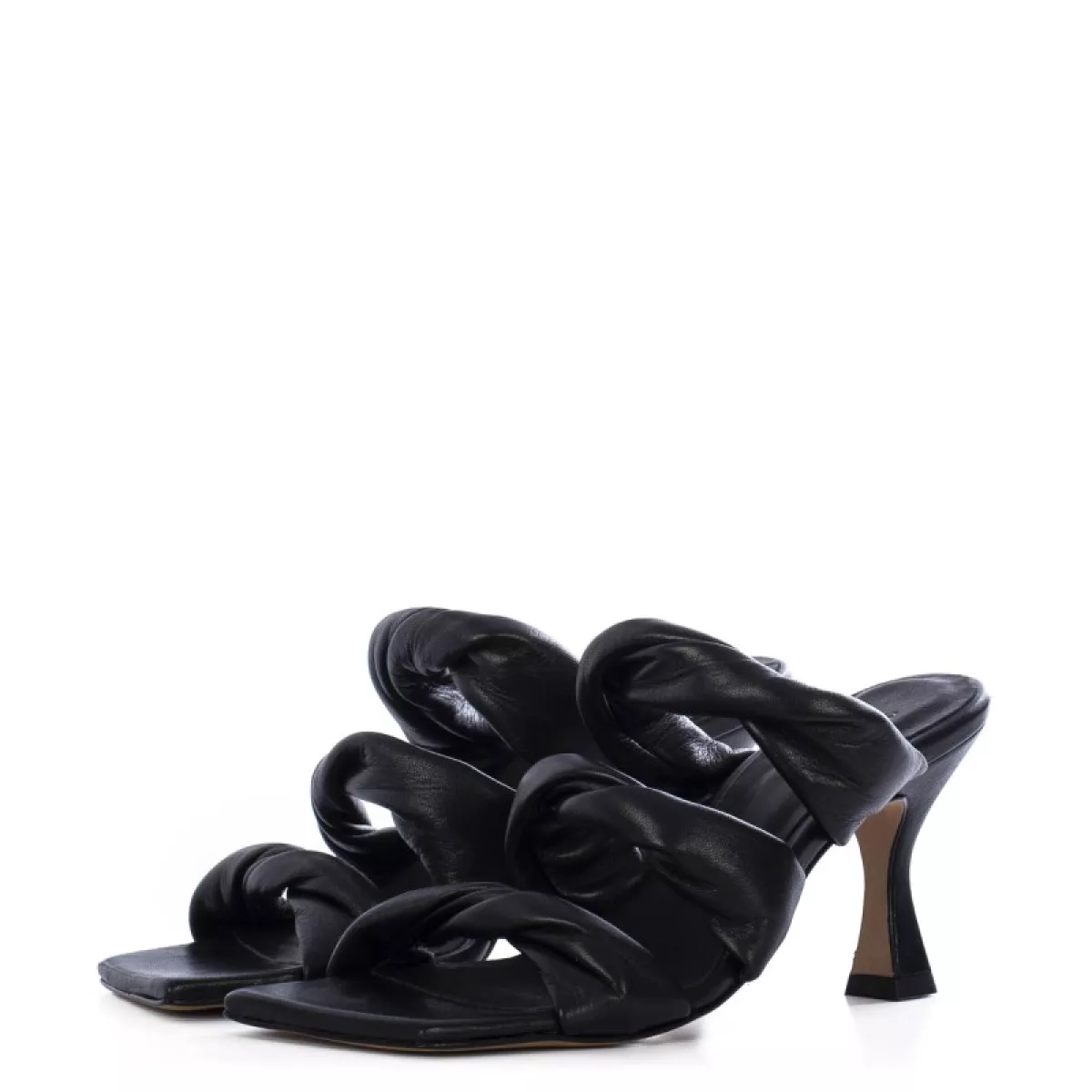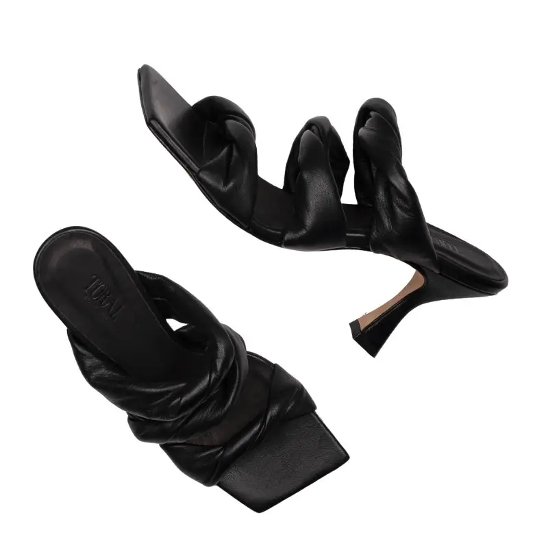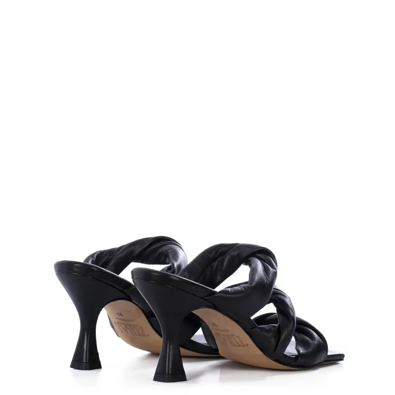 details: als je op zoek bent naar een krachtige en vrouwelijke look, heb je je sandalen gevonden… Deze zwarte slipper op hak heeft 3 gedraaide (twisted) banden en een carré neus en dat maakt deze slipper super trendy.