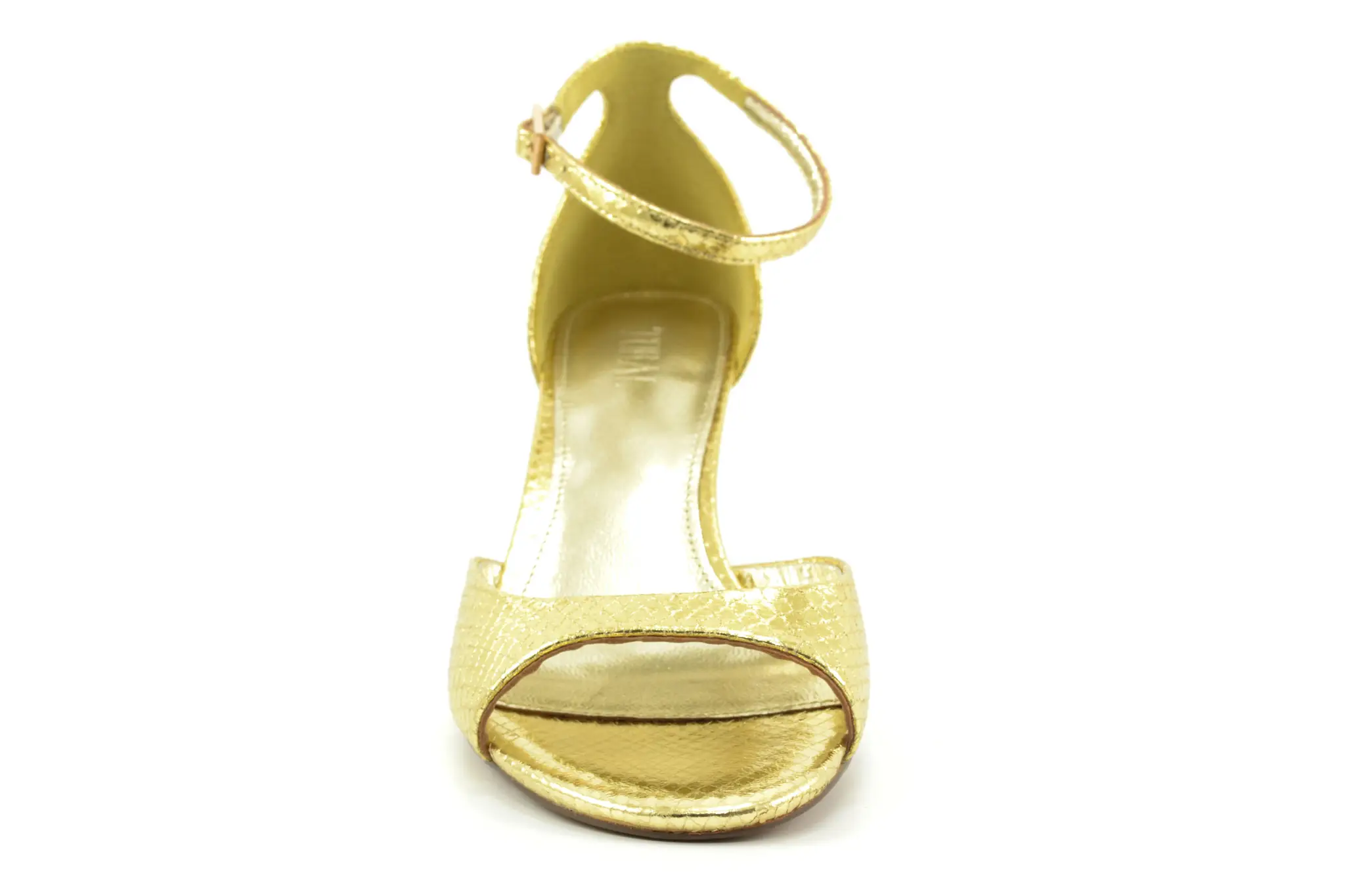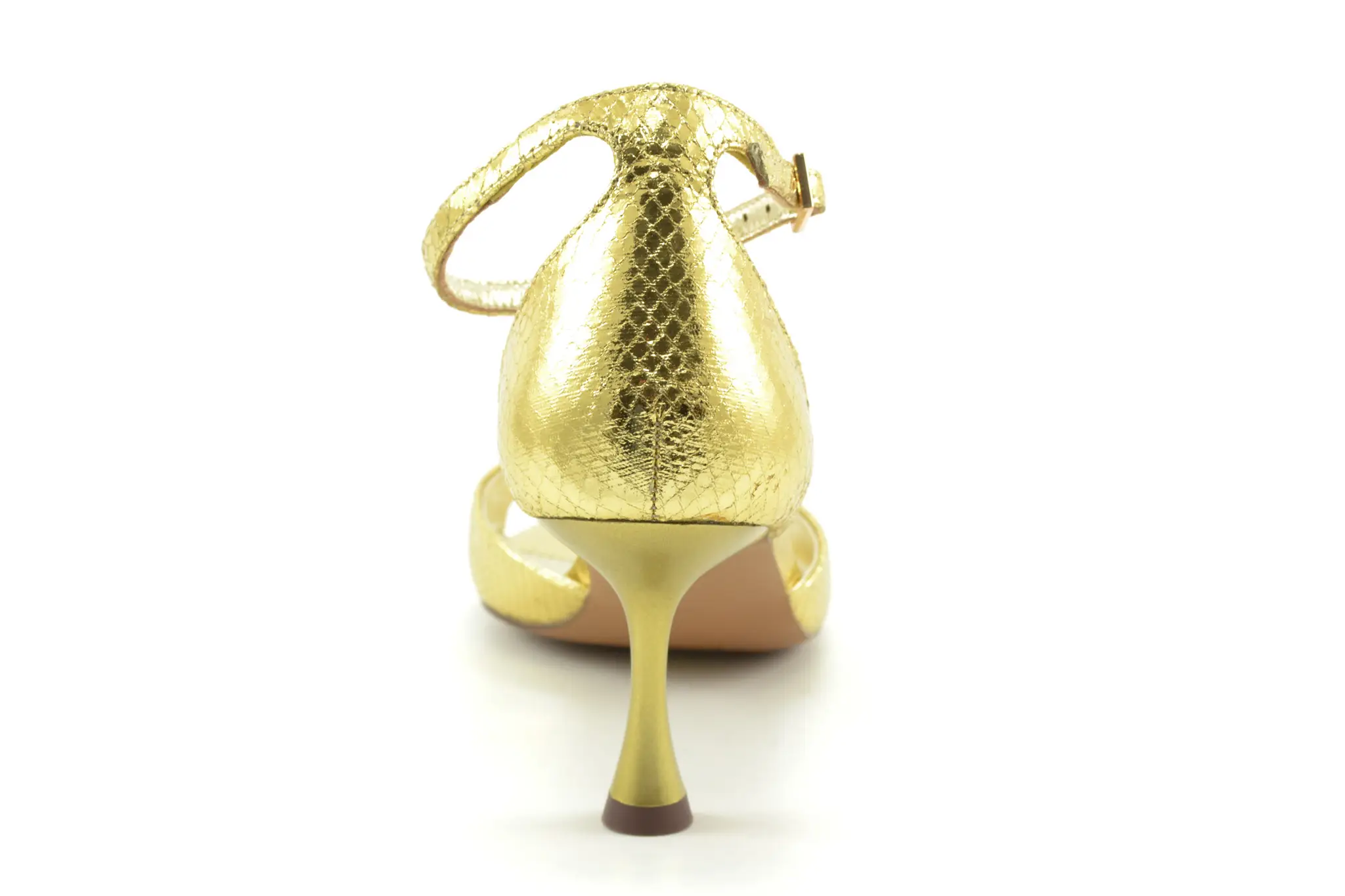 als je op zoek bent naar een krachtige en vrouwelijke look, heb je je feestelijke schoenen van het Spaanse merk Toral gevonden… Deze goud leren pumps met open teen hebben een lizzard-print en dat maakt deze mooie schoenen super trendy. Make a statement!