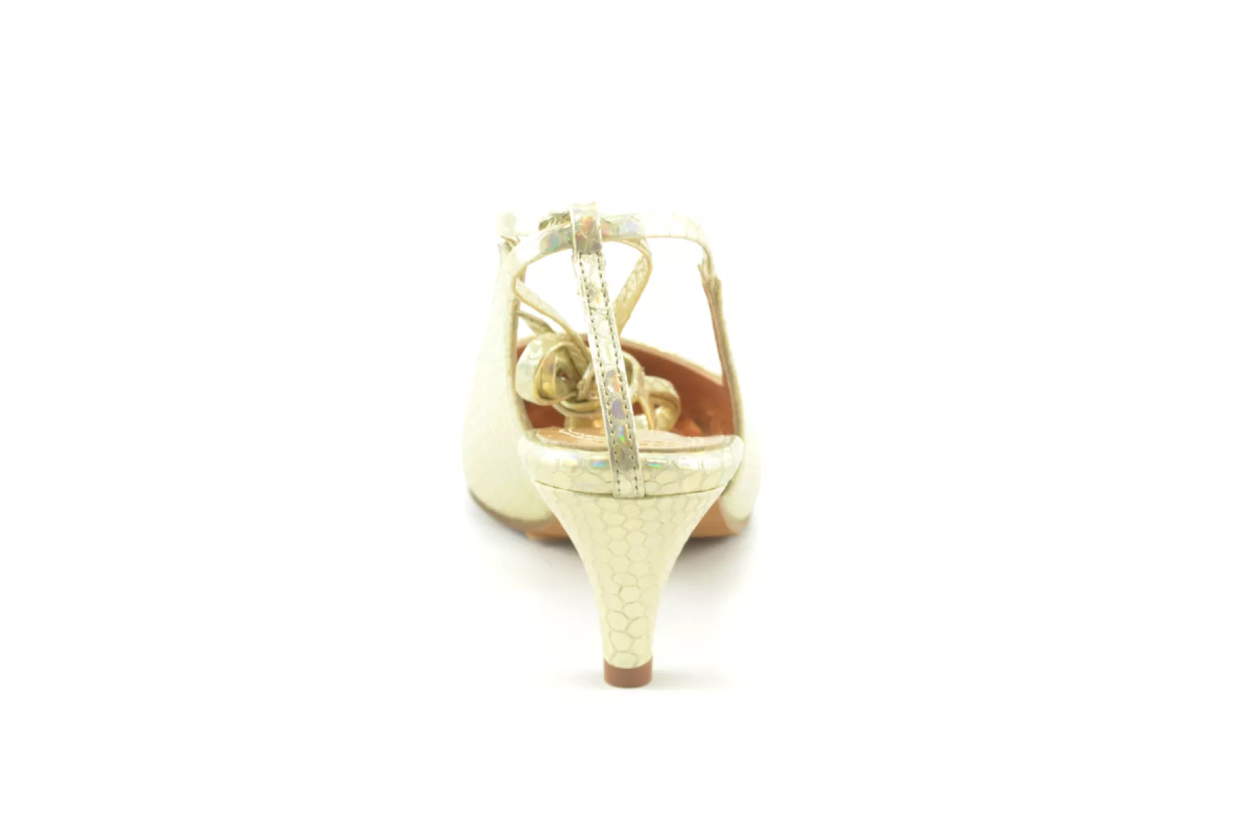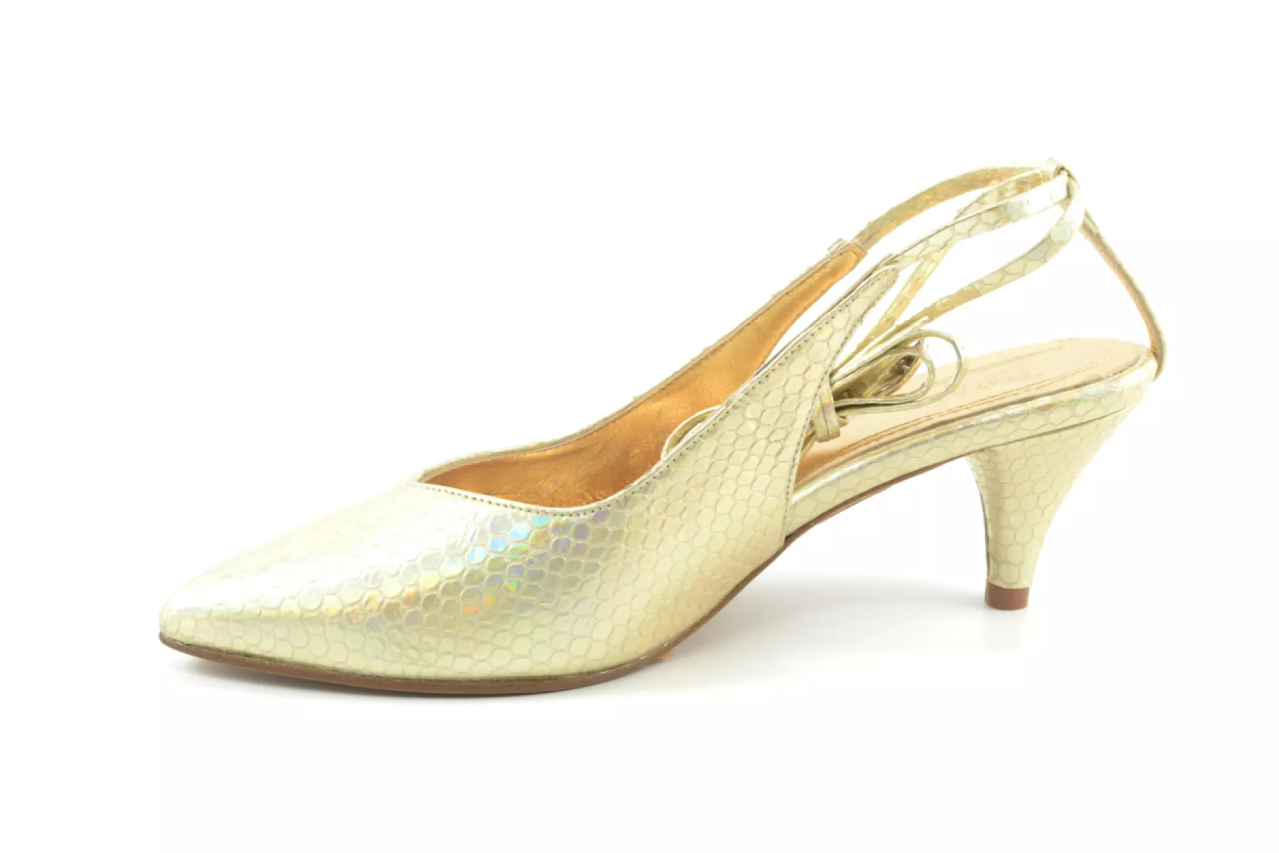 details: een mooie goudkleurige pump met een hakje. De wikkel om de enkel maakt deze pump helemaal af. Combineer deze schoen bij elke zomerse outfit en geef je outfit een vrouwelijke moderne twist.