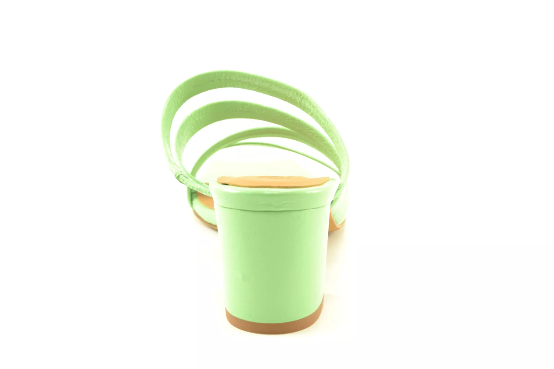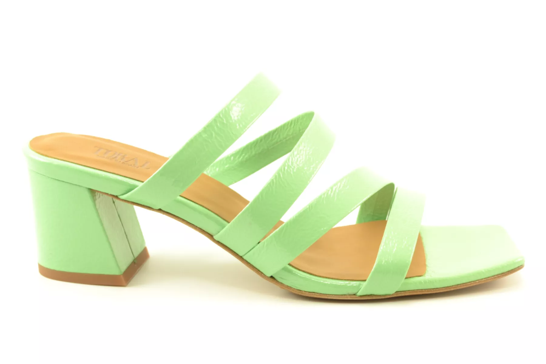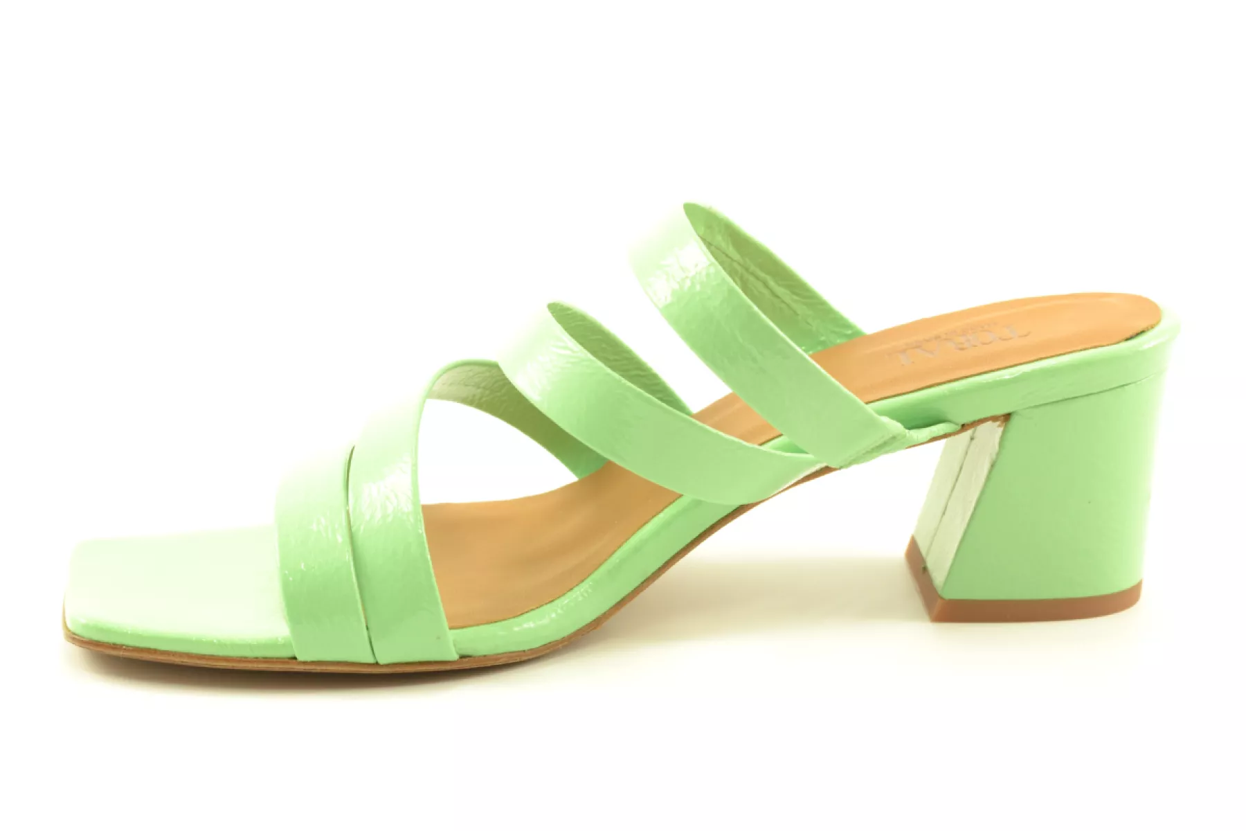 details: het Spaanse merk Toral weet wat er in de mode is! Deze zomerse luxe groene slipper met een vrouwelijke hak, carré neus en bandjes op de wreef heeft alles in huis om jou zomeroutfit te laten stralen.