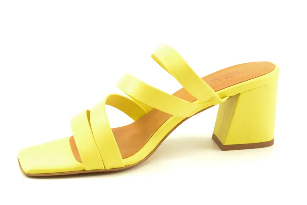 details: het Spaanse merk Toral weet wat er in de mode is! Deze zomerse luxe gele slipper met een vrouwelijke hak, carré neus en bandjes op de wreef heeft alles in huis om jou zomeroutfit te laten stralen.