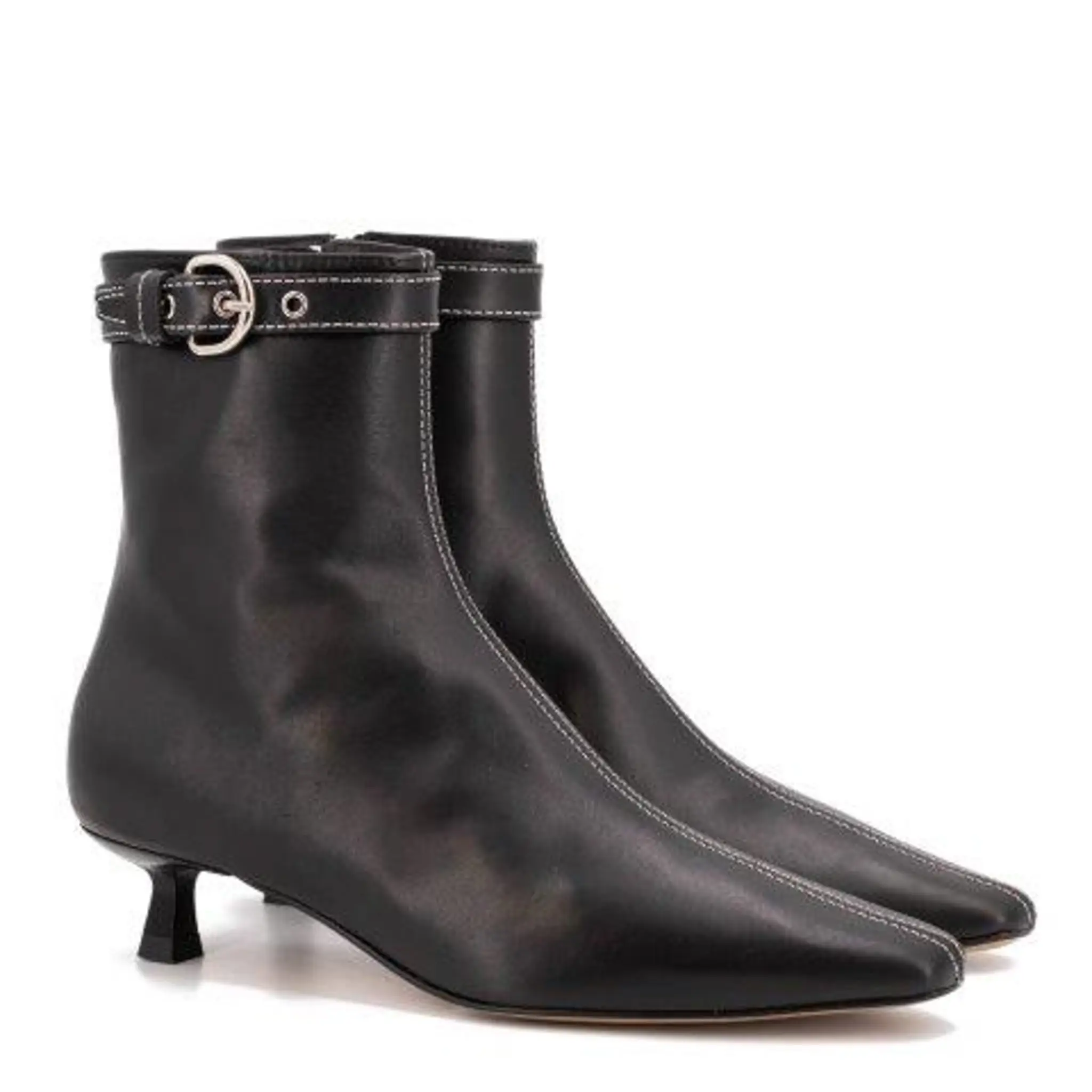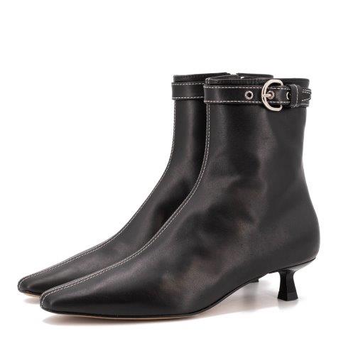 als je op zoek bent naar een krachtige en vrouwelijke look, heb je je laarsjes van het Spaanse merk Toral gevonden… Deze zwarte leren enkellaarsjes hebben een carré neus en witte sierstiksels. Rond de enkel een riempje met zilverkleurige gesp.. en dat maakt deze laarsjes super trendy. Make a statement!