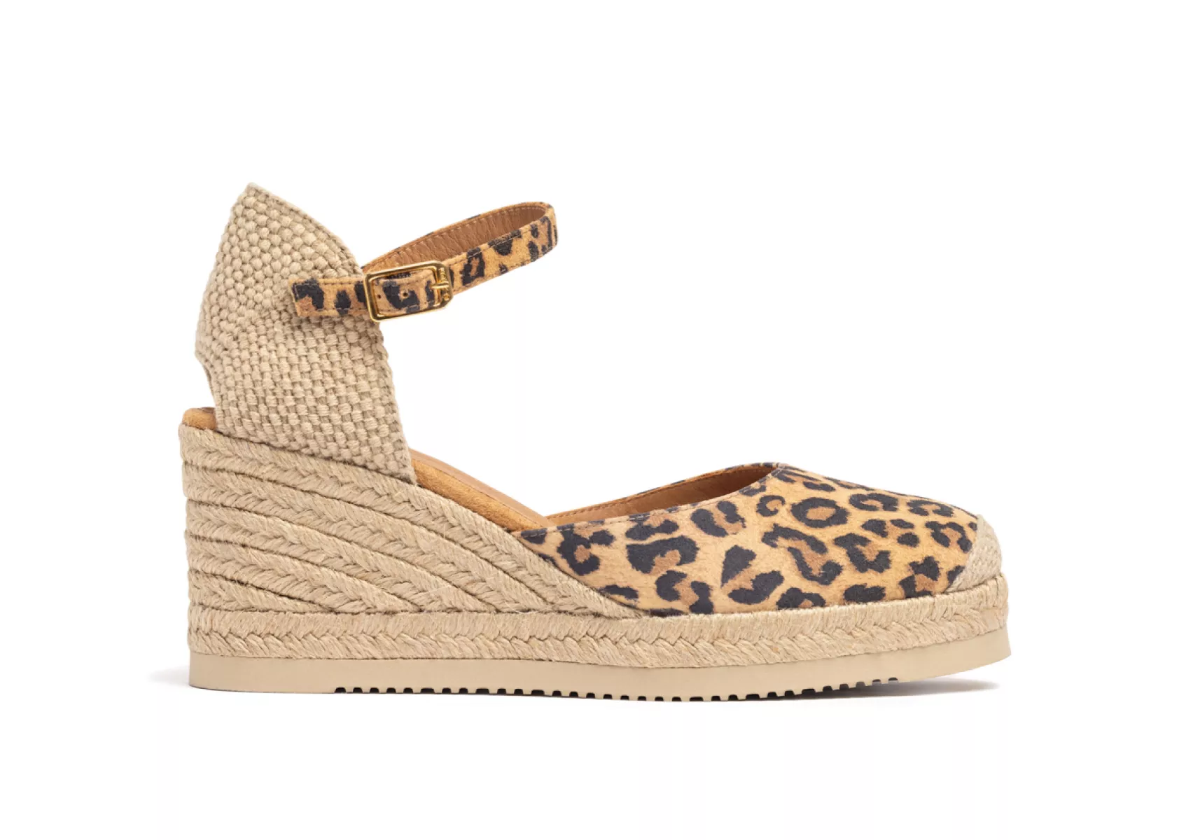 Espadrilles met ronde neus gemaakt van geprint leer. Raffia hielstuk en verstelbaar met metalen gesp. 2cm plateau en 7,5cm hoge sleehak bekleed met jute. Zool in EVA, lichter en flexibeler dan ooit dankzij Unisa’s Superlight- technologie. Ons CACERES-model is uitgegroeid tot een echte Unisa-klassieker.