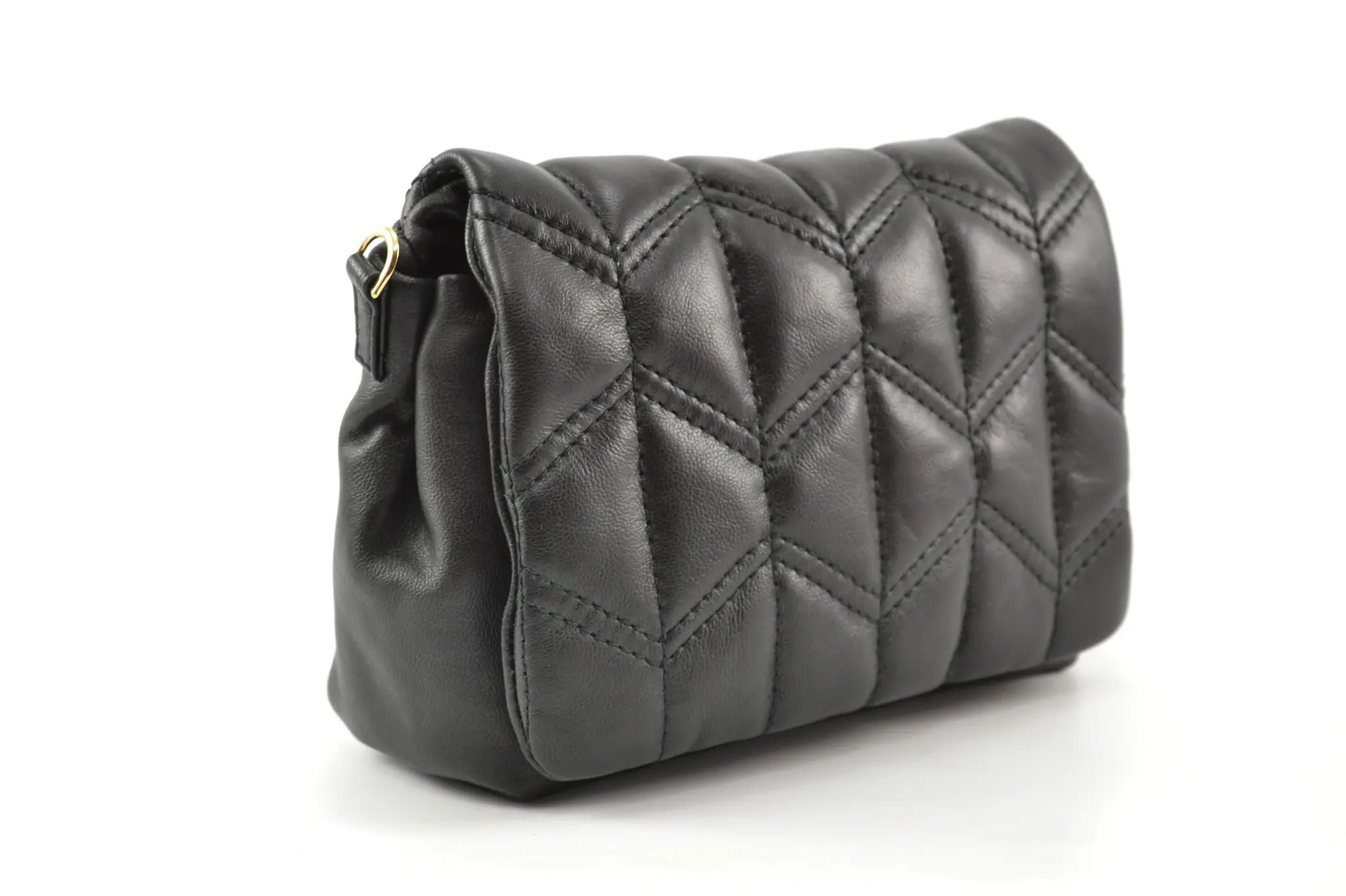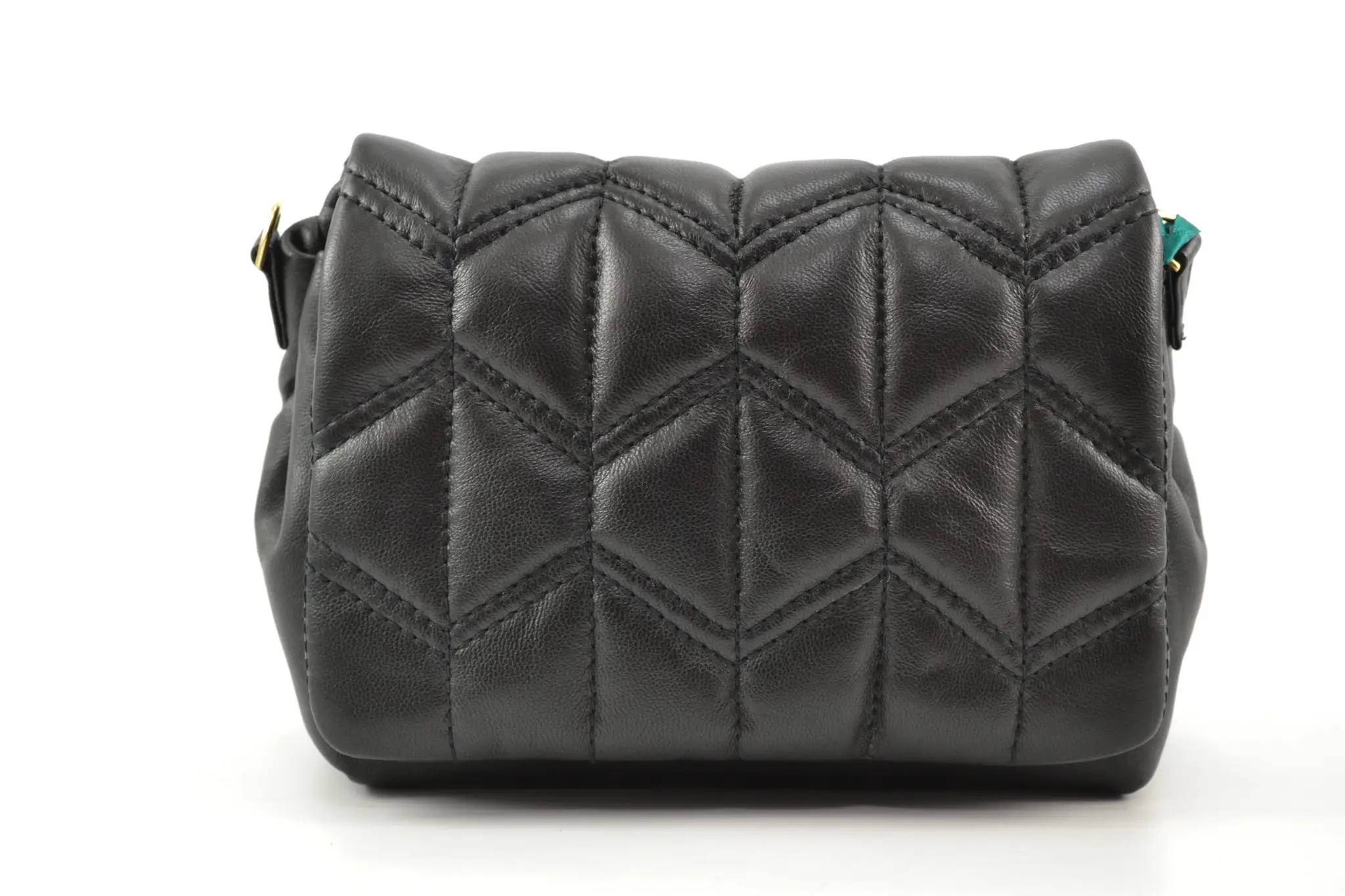 Kleine handtas gemaakt van leer. Bijpassend stikseldetail met geometrisch effect. Magneetsluiting. Binnenvak met ritssluiting en afneembare goudkleurige ketting binnenin. Afmetinge: 15 cm X 19 cm X 7 cm