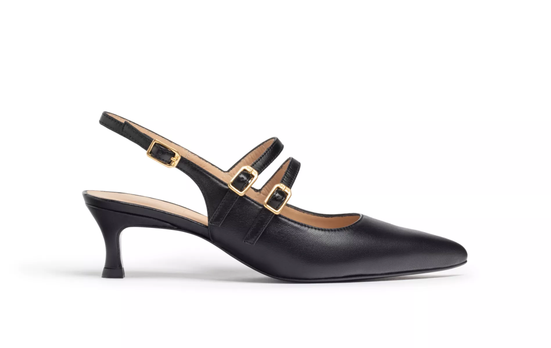 Slingbacks met spitse neus gemaakt van leer. 5 cm hoge hak bekleed met bijpassend leer en leren zool. Dubbele banddetail met gespen op de wreef.