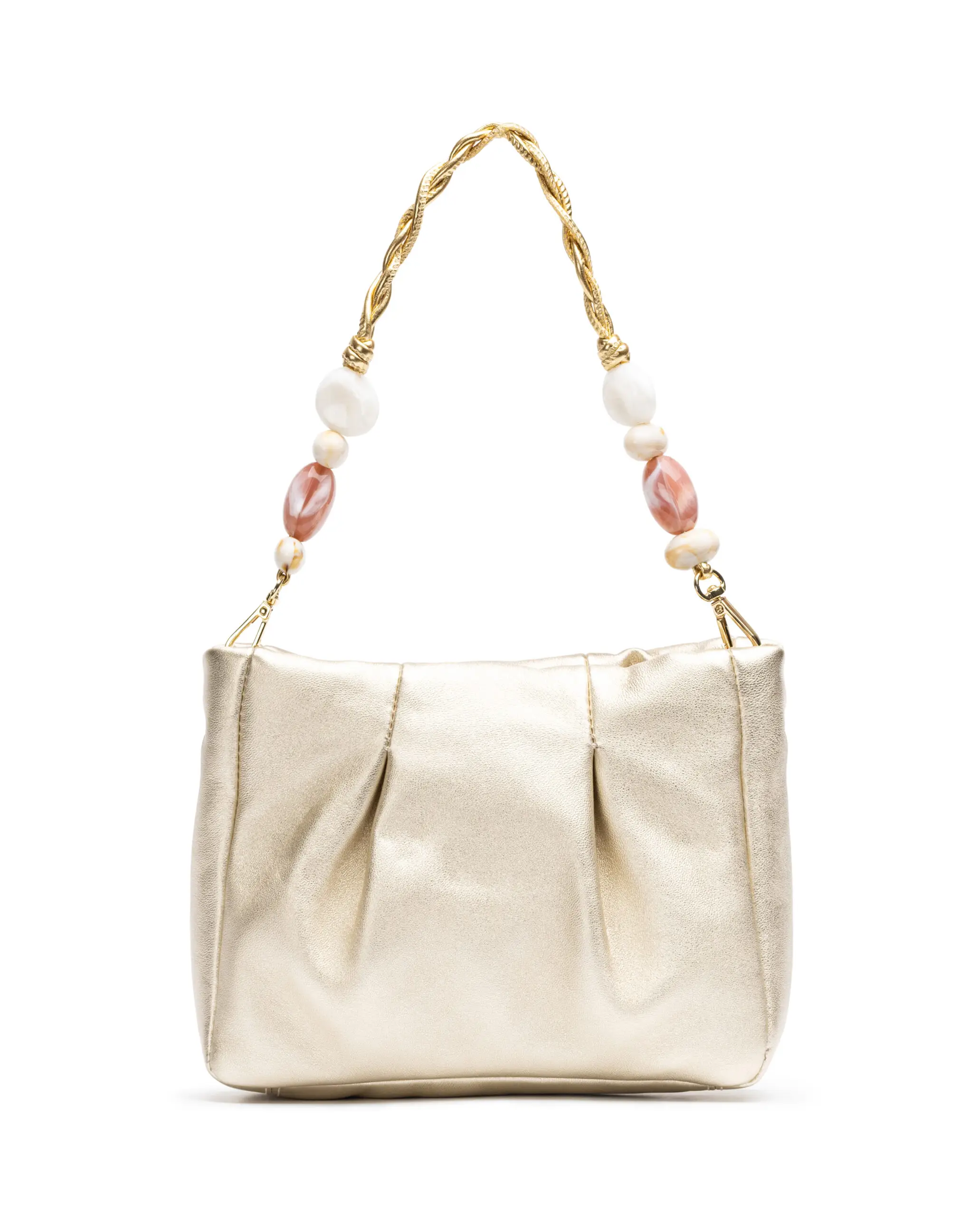 Sandalen met vierkante neus gemaakt van metallic leer. Bollendecoratie op de wreef en verstelbaar met metalen gesp. Comfortabele hak van 3,5 cm bekleed met bijpassend raffia. Leren zolen. Sandalen met een uitgesproken mediterrane uitstraling.