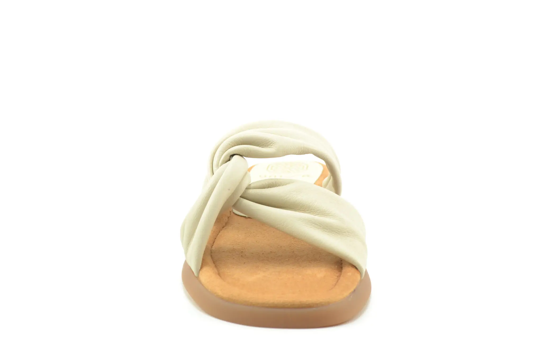 Platte slippers met vierkante neus gemaakt van leer. Brede op de wreef gekruiste banden. Extra voering in de hele voetzool voor jouw comfort. Lichte, flexibele, rubberen antislipzool.