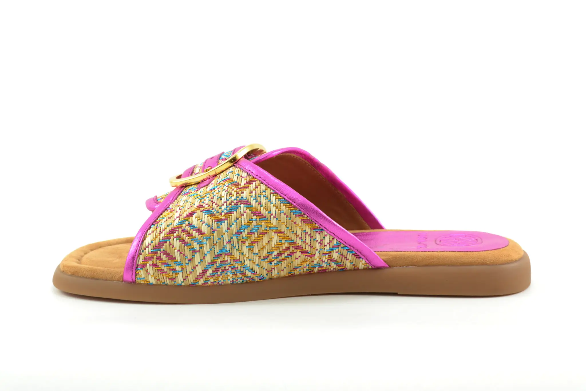 CRAY_YU Platte sandalen met vierkante neus gemaakt van raffia. Contrasterende boord aan de wreefband met gouden gesp als versiering. Lichte, flexibele en antislip rubberen zolen. De perfecte sandalen voor deze zomer.