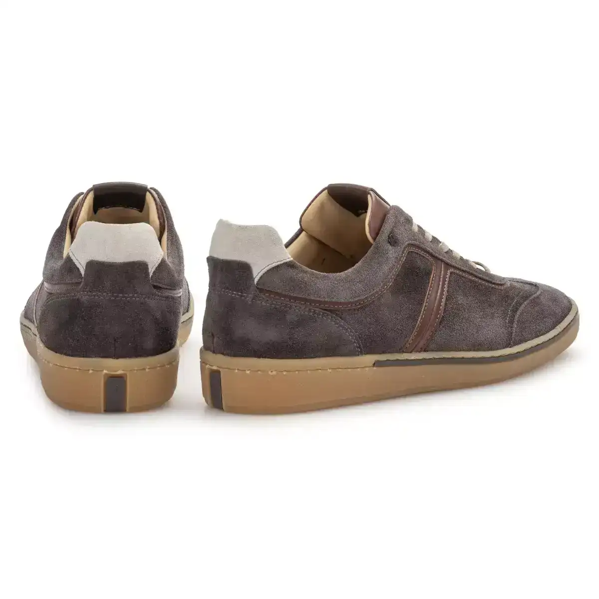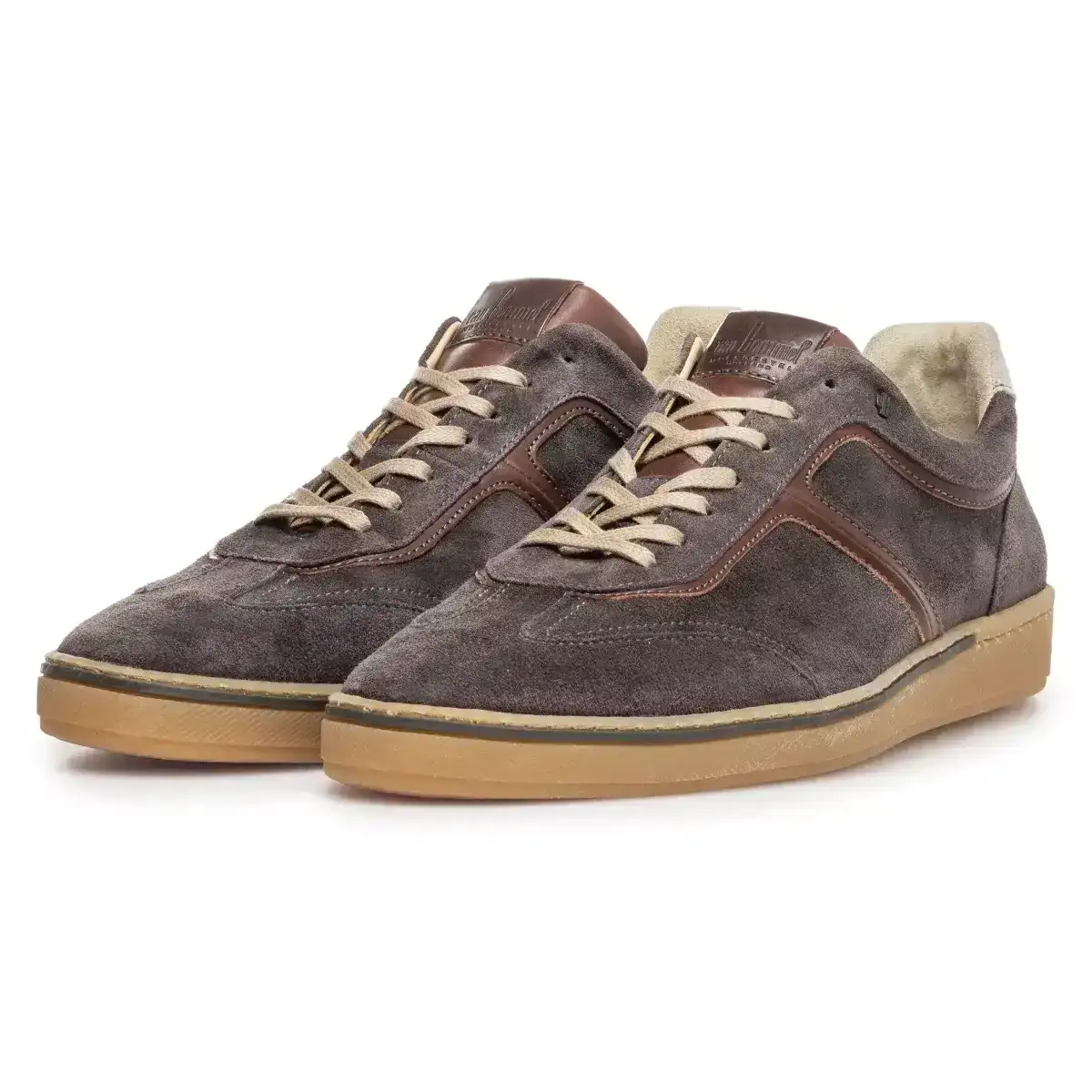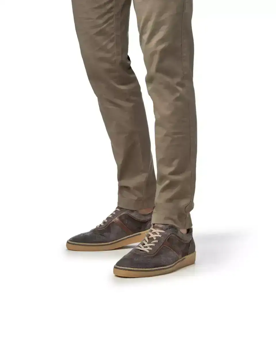 Deze stijlvolle casual schoen onderscheidt zich door zijn eenvoud. Het meest karakteristieke aan de schoen is het dunne strookje leer dat ingelegd is in de zijwand van de slijtvaste TPU zool. Het model is ingetogen sportief, de detaillering is klassiek. Bovenaan de rijgsluiting is het klassieke koperkleurig VB logootje in het suède geslagen. De schoen is gevoerd met eersteklas kalfsvoering en ingelegd met een comfortabel voetbed dat volledig uitneembaar is. Deze variant is uitgevoerd in klassiek donkergrijs suède dat gelooid is in Santa Croce SullArno in Pisa, Italië.