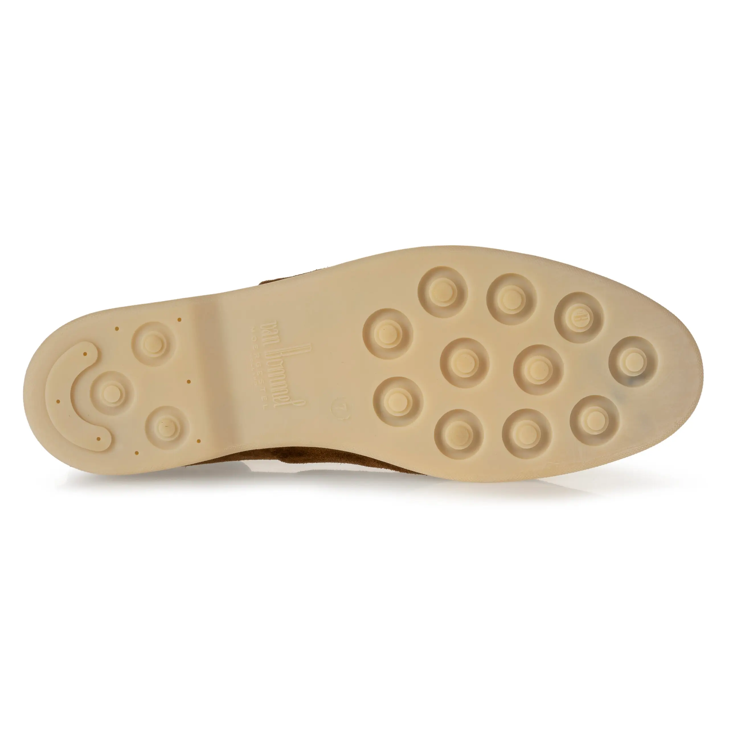 Dit is een casual schoen op een melkwitte rubberzool. Het binnenwerk van de schoen is uitgevoerd met hoogwaardig kalfslederen voering. De voet wordt in deze schoen ondersteund door een comfortabel, volledig uitneembaar voetbed. Bovenaan de derby klep is het klassieke, koperkleurige, VB logootje in het suède geslagen. Deze variant is uitgevoerd in cognac suède dat gelooid is in het dorpje Santa Croce Sull’arno midden in de regio Toscane.