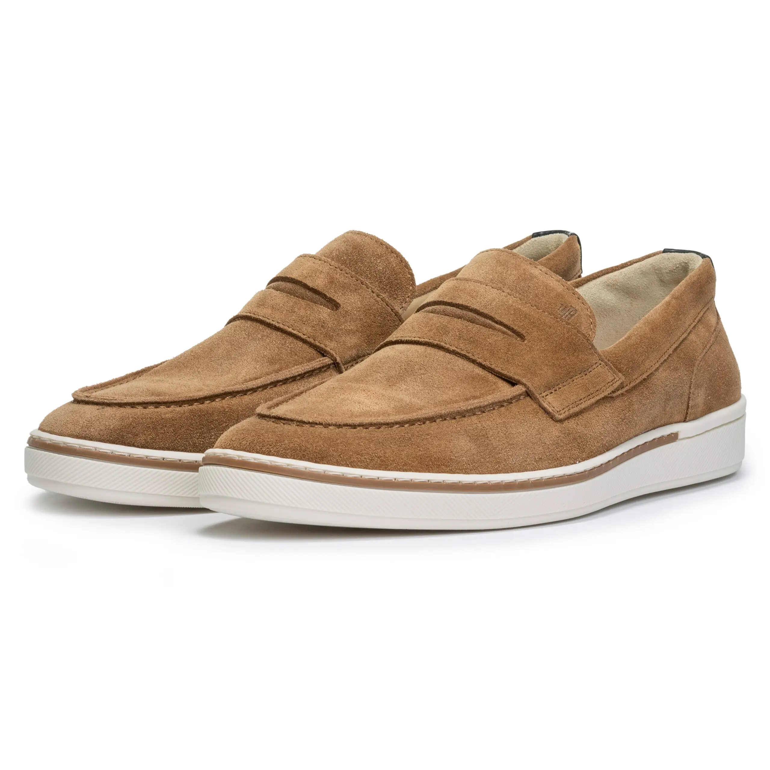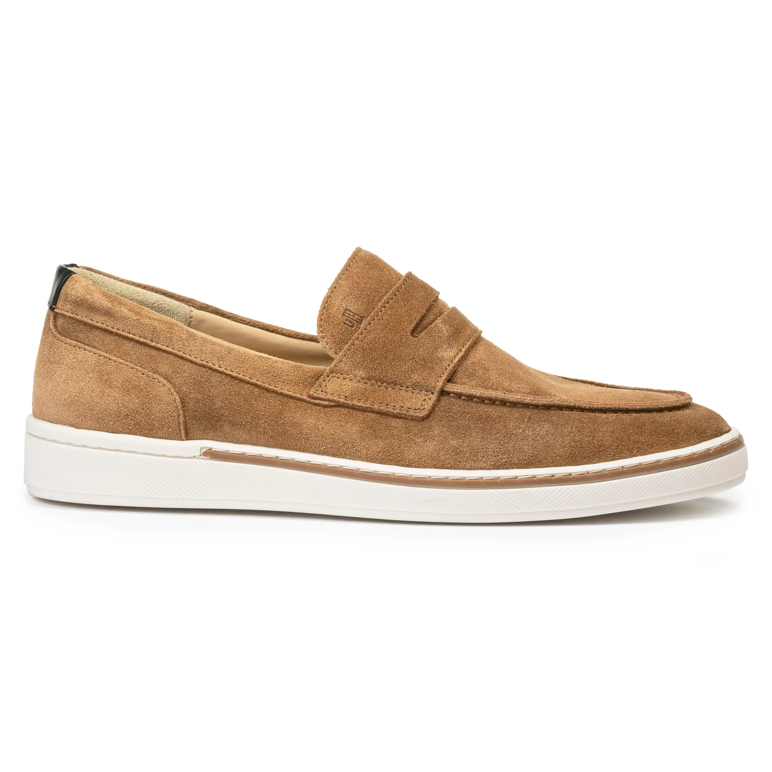 Deze stijlvolle casual loafer onderscheidt zich door zijn eenvoud. Het meest karakteristieke aan de schoen is het dunne strookje leer dat ingelegd is in de zijwand van de slijtvaste TPU zool. Het model is ingetogen sportief, de detaillering is klassiek. De schoen is gevoerd met eersteklas kalfsvoering en ingelegd met een comfortabel voetbed dat volledig uitneembaar is. Deze variant is uitgevoerd in klassiek lichtbruin suède dat gelooid is in Santa Croce Sull’Arno in Pisa, Italië.