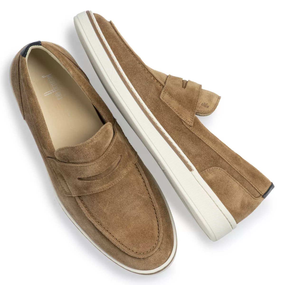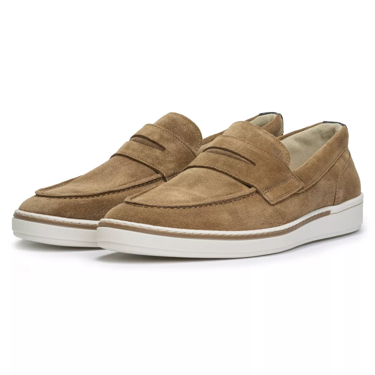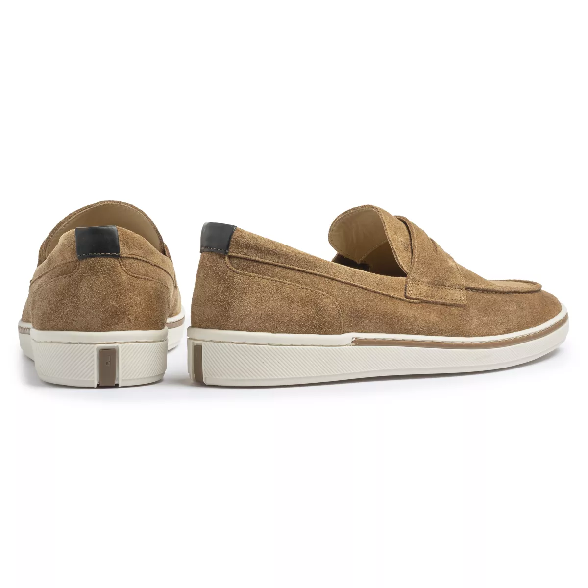 Deze stijlvolle casual loafer onderscheidt zich door zijn eenvoud. Het meest karakteristieke aan de schoen is het dunne strookje leer dat ingelegd is in de zijwand van de slijtvaste TPU zool. Het model is ingetogen sportief, de detaillering is klassiek. De schoen is gevoerd met eersteklas kalfsvoering en ingelegd met een comfortabel voetbed dat volledig uitneembaar is. Deze variant is uitgevoerd in klassiek lichtbruin suède dat gelooid is in Santa Croce SullArno in Pisa, Italië.