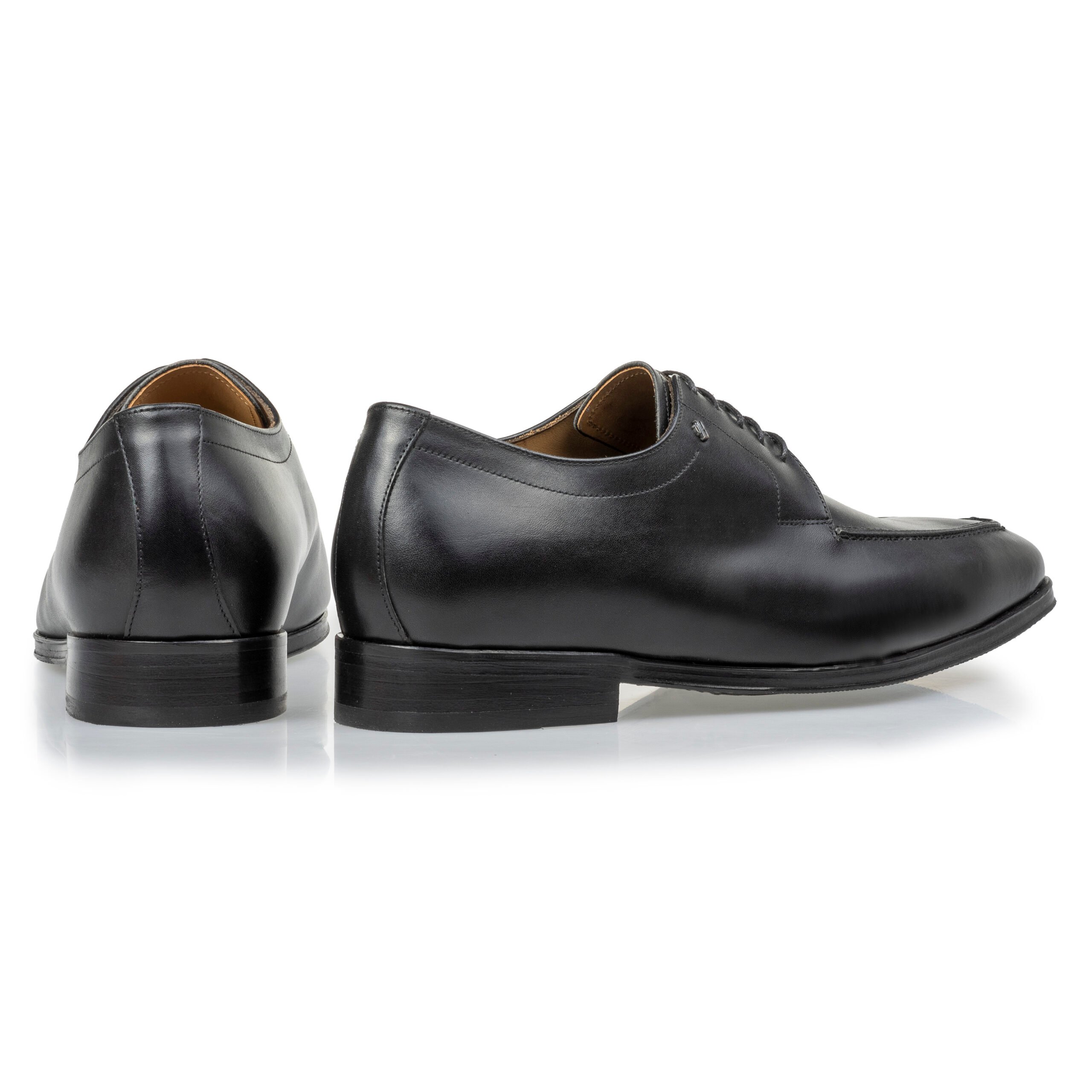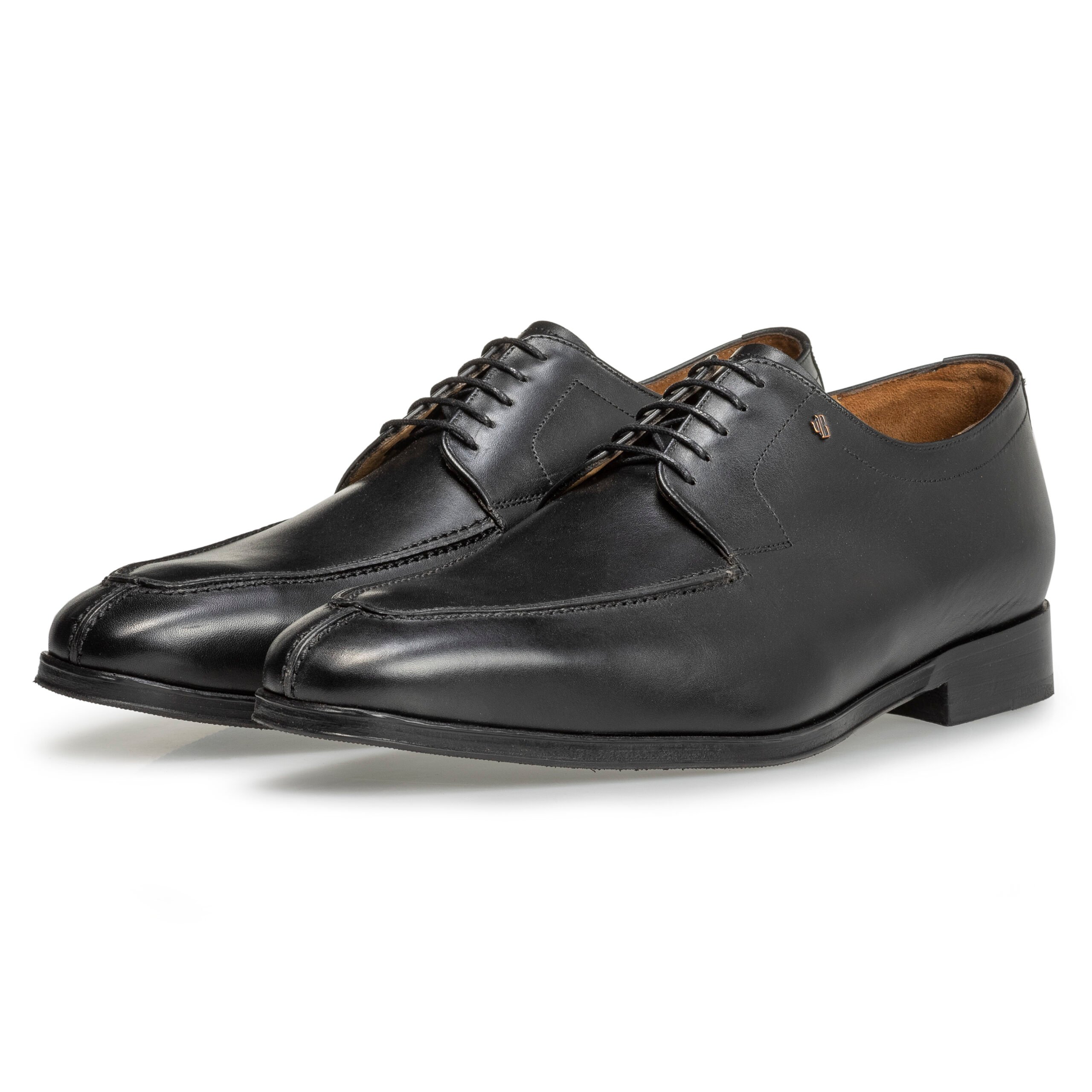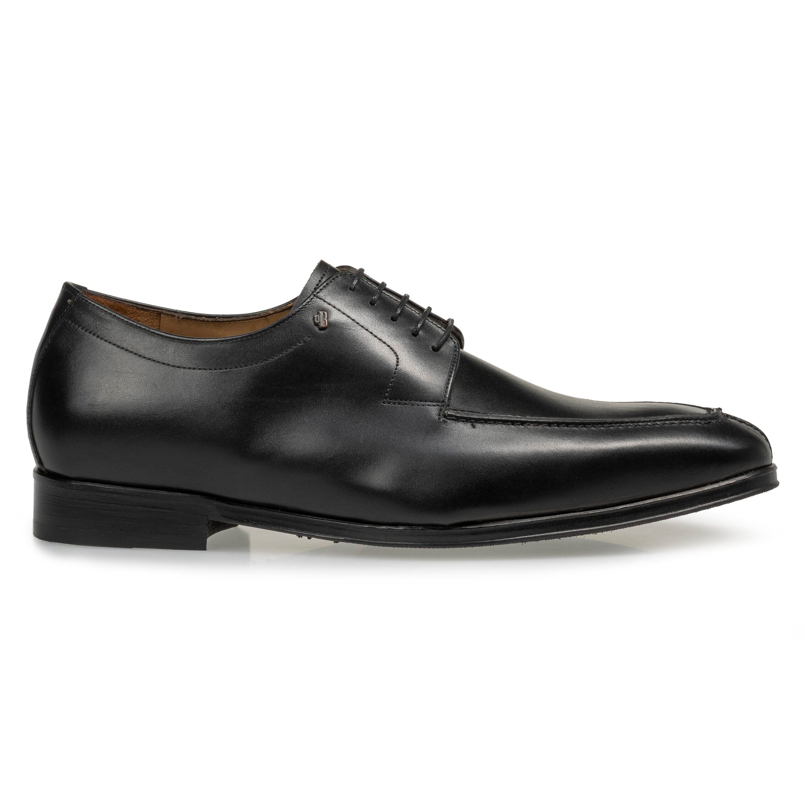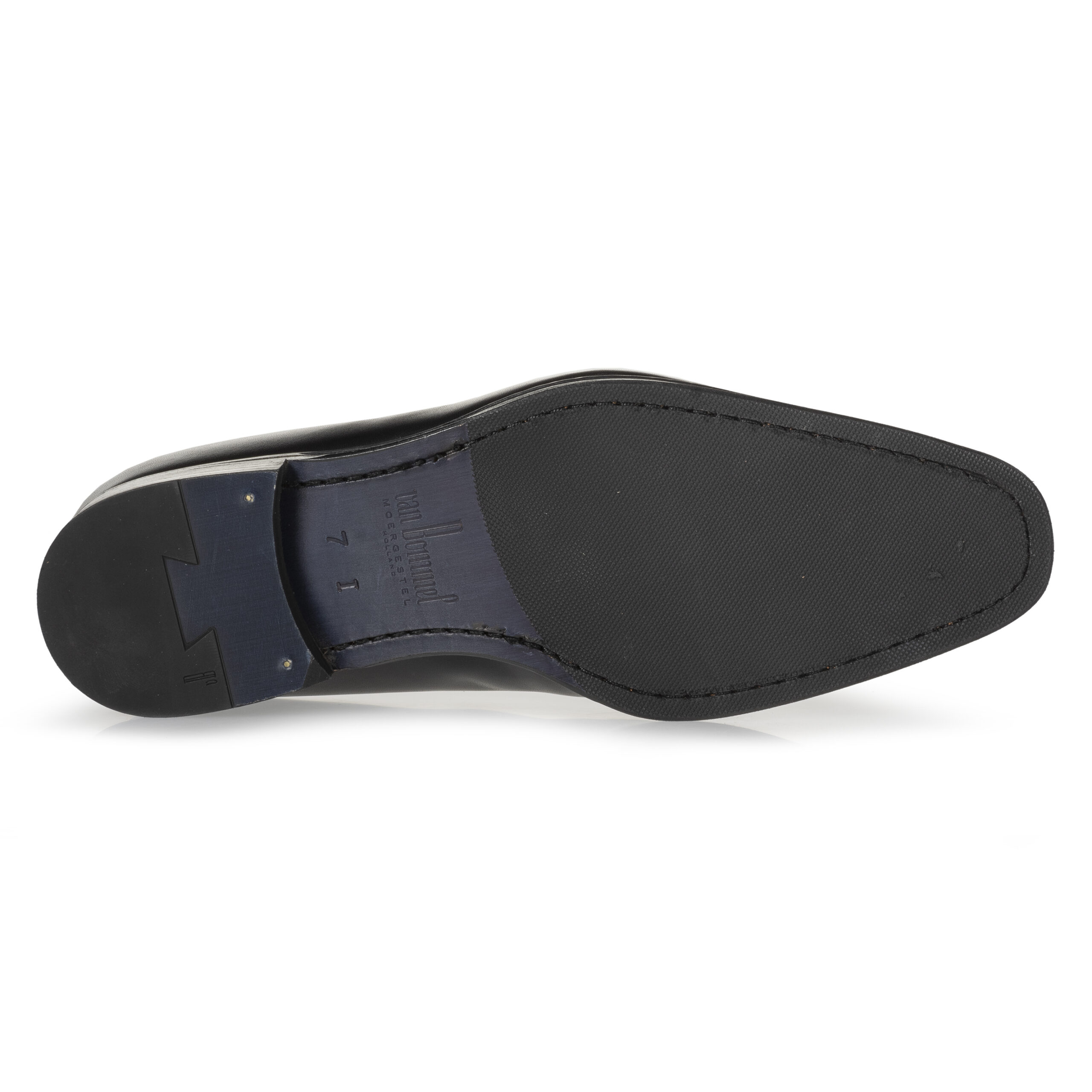 Deze derbyschoen met Franse spiegel is onderdeel van de klassieke Van Bommel collectie. Dit is een extra breed model. De leest heeft een I wijdte en is uitgerust met een uitneembaar voetbed. De schoen is gemaakt volgens de Blake maakwijze. In de zijkant van de zoolrand zijn ter decoratie twee zeer fijne haarkantjes gefreesd. Het bovenwerk is gemaakt van eerste zwart kalfsleer, afkomstig van een looierij uit Montorso vicentino, Vicenze, Italië. Bij het bovenste vetergaatje is aan de buitenzijde van de schoen het decennia oude koperen VB’tje in het leer geslagen. De voering is gemaakt van kwalitatief hoogwaardig kalfsleer.