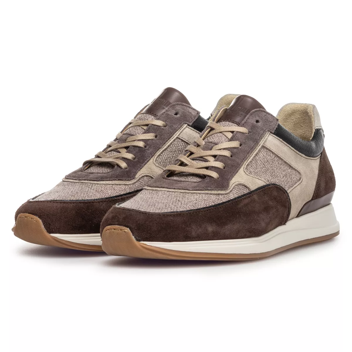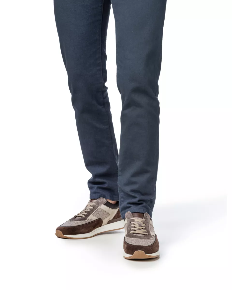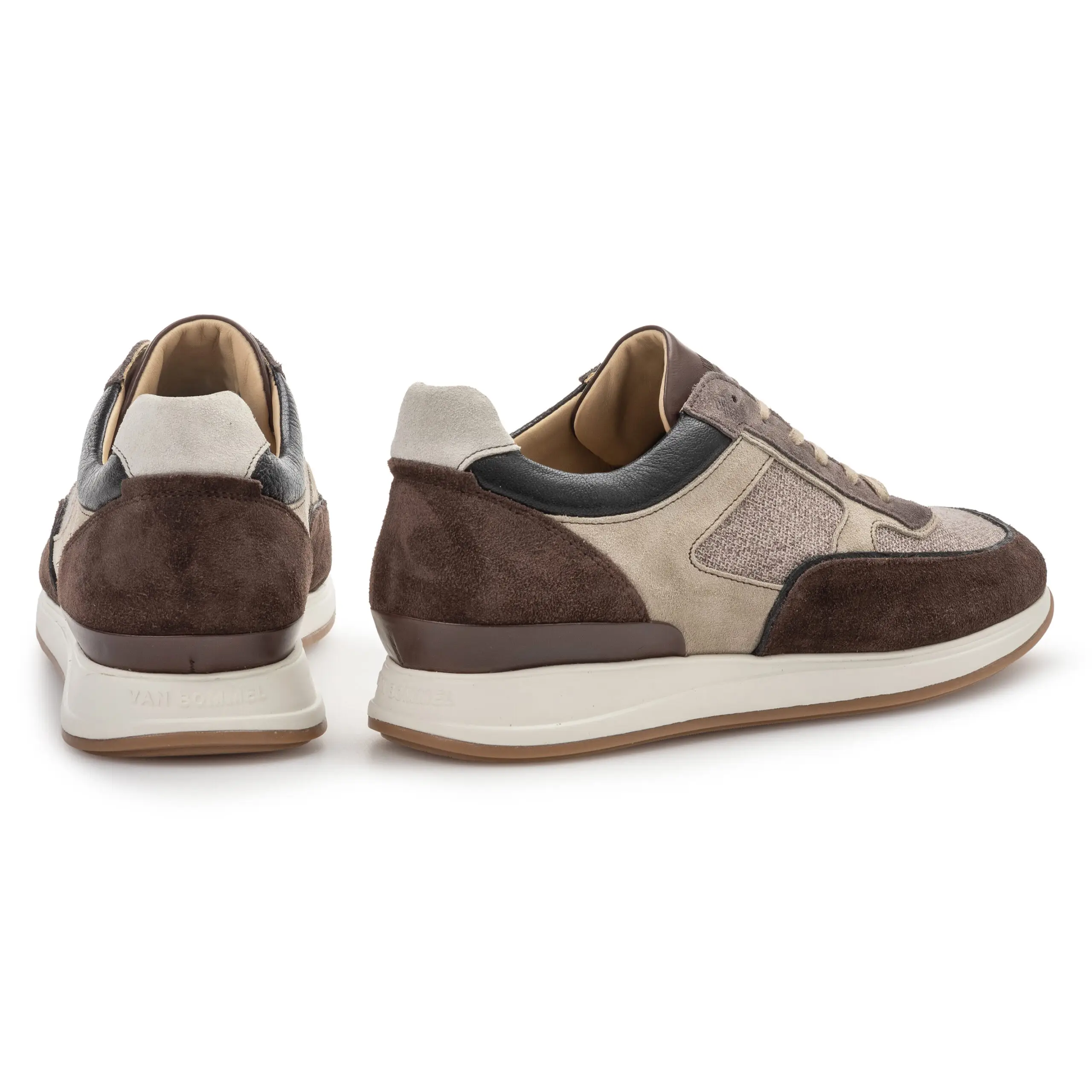 Deze klassieke sneaker is zowel stijlvol als sportief. De subtiele combinatie van taupe en bruin suède en textiel geeft deze schoen een ontspannen uitstraling, perfect voor casual momenten met een vleugje nonchalance. Achter bij de hiel is tegen de zoolrand, met een aangespannen stiksel, een lederen cup voorzien. Dit hielcupdeel is gemaakt van fijn kalfsleer met een zijdeglans en warme patinering. De sneaker is gevoerd met topkwaliteit kalfsleer. Het voetbed is uitneembaar en kan eventueel vervangen worden door een eigen voetbed of steunzool. De schoen is gemaakt op een comfortabele leest met een G1/2 wijdte. Dit maakt de schoen ook geschikt voor de net iets bredere voet.