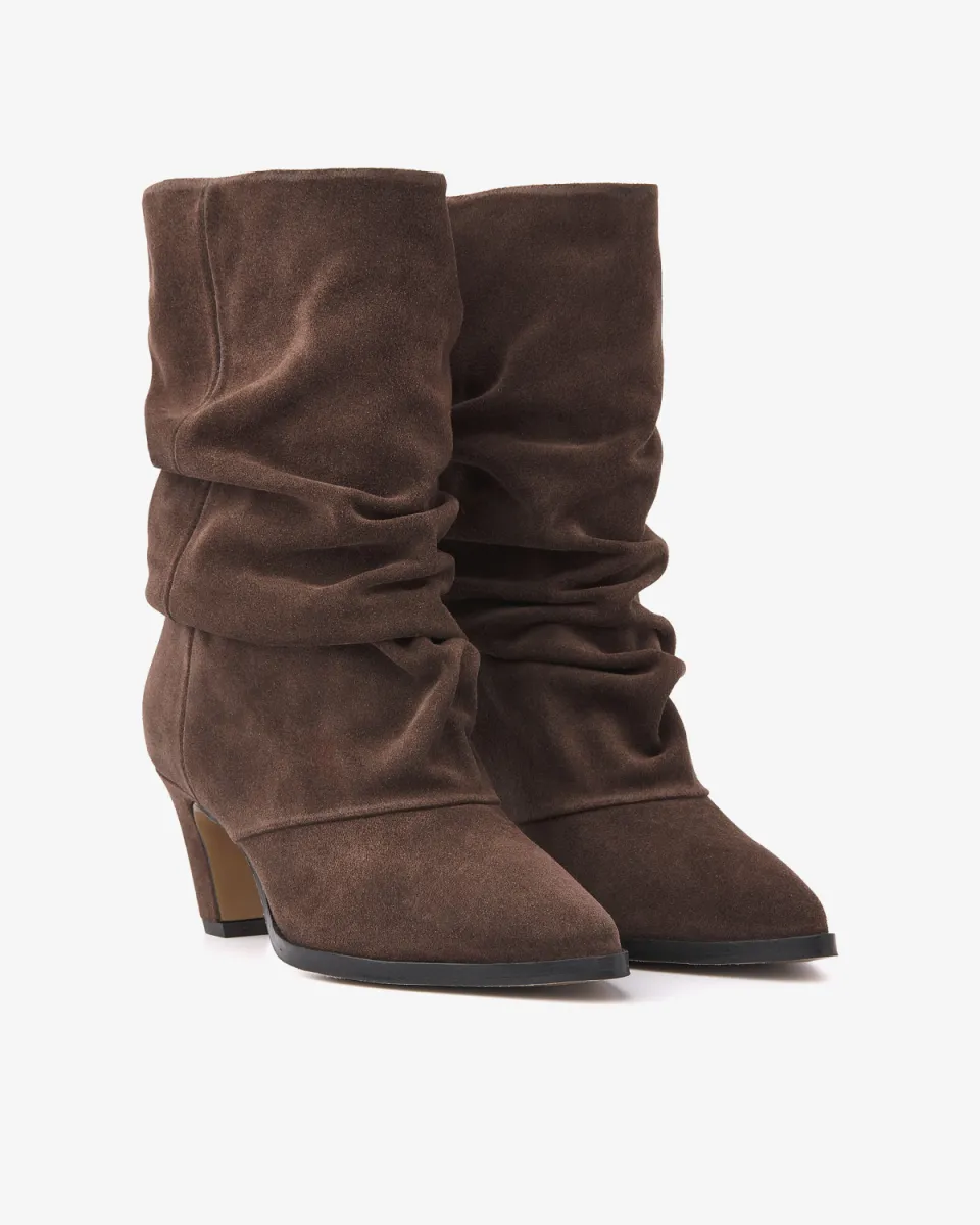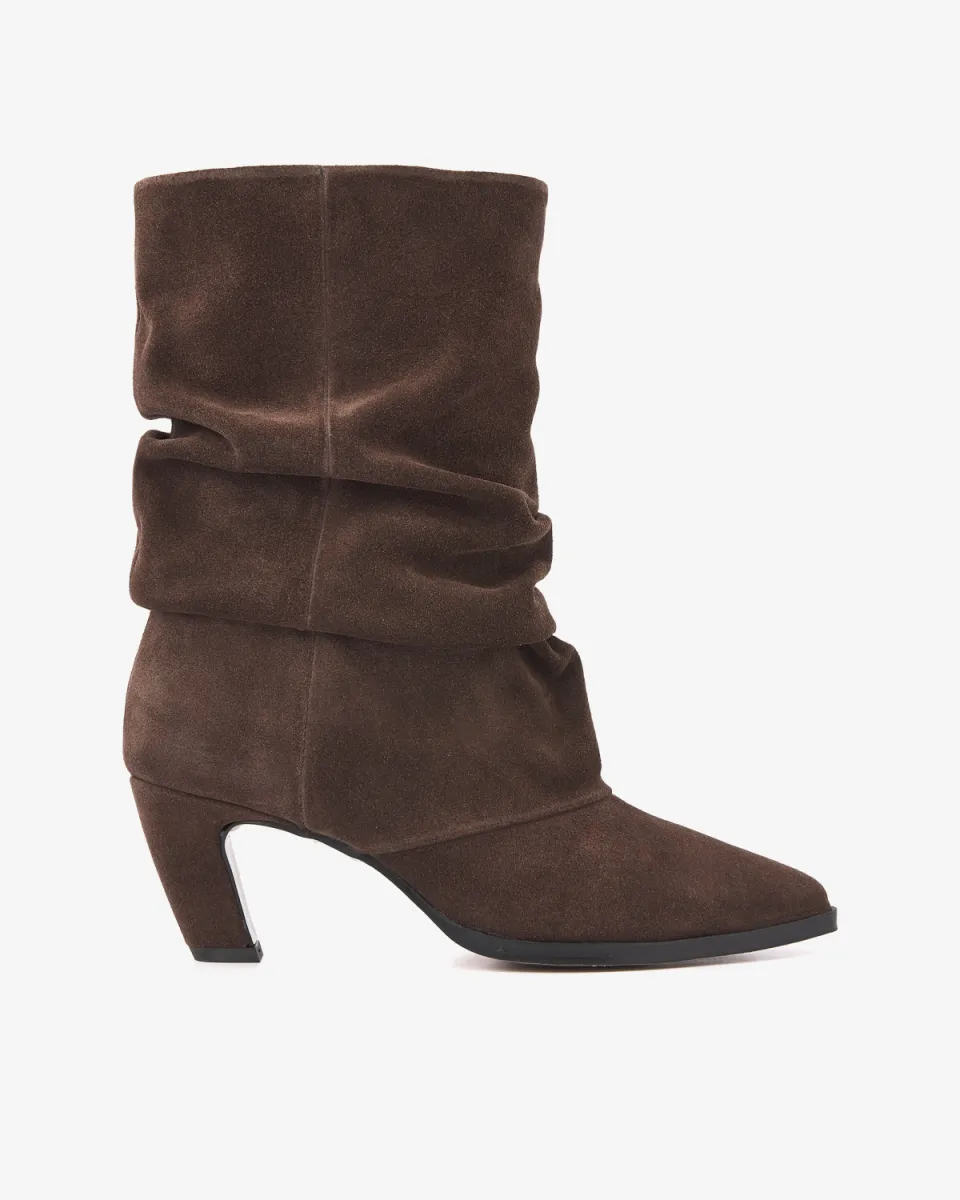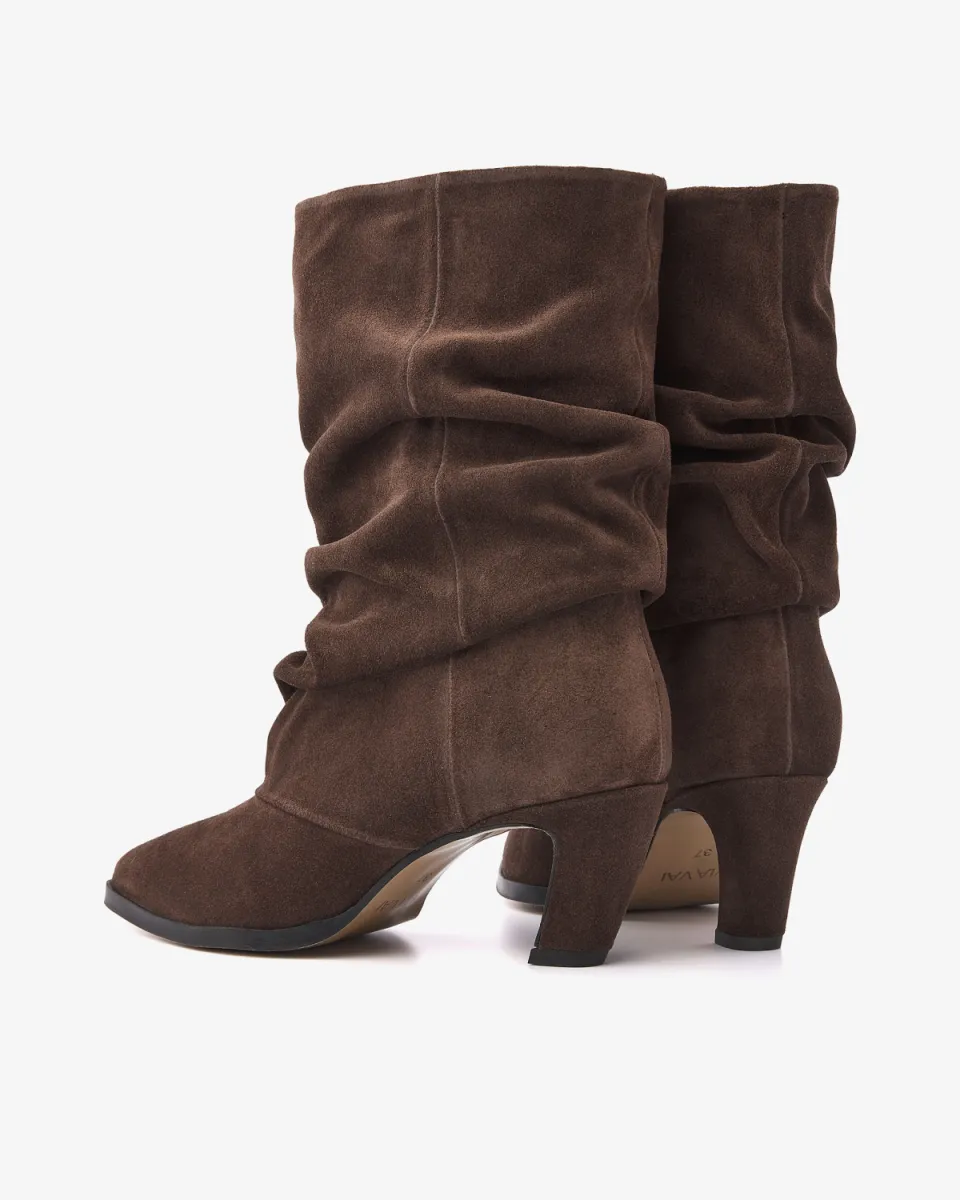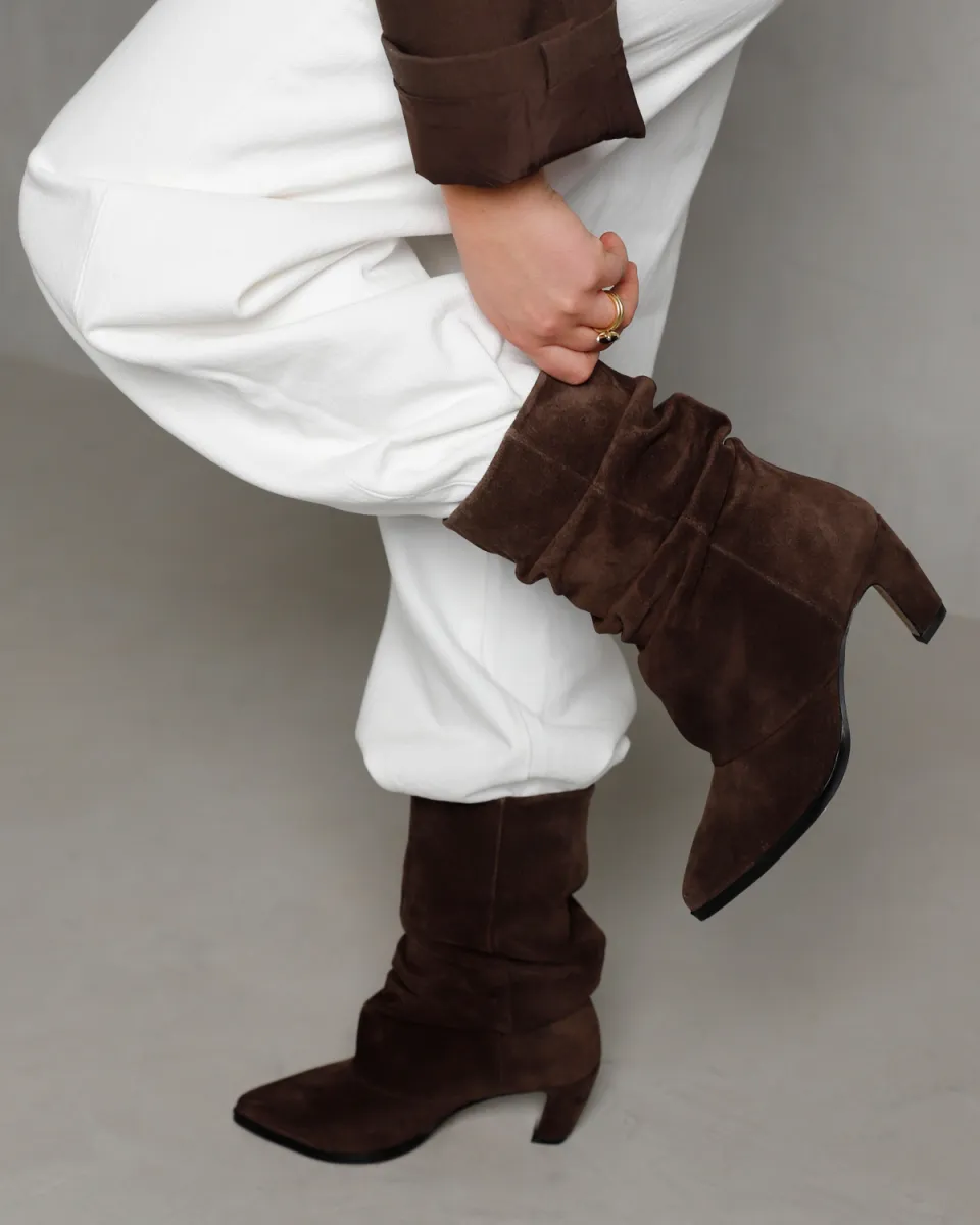 Elisa Palmer is dé definitie van nonchalante klasse. De suède khaki laarzen hebben een tube schacht met een subtiel afzakeffect. De schacht is breed genoeg om er zo in te stappen, waardoor de laars geen rits nodig heeft aan de binnenkant. Dat zorgt voor een extra clean en trendy design. De elegante bananenhak is subtiel gebogen, wat de laars extra karakter geeft. Elisa Palmer is jouw go-to boot met attitude.
