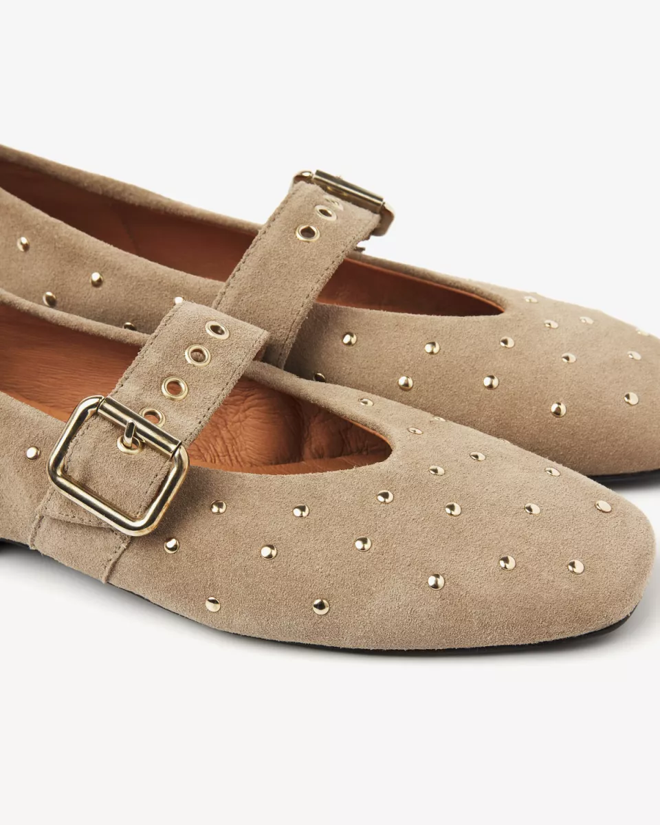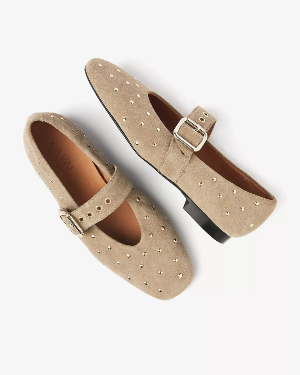 ballerinas zijn gemaakt van luxueus suède en gedecoreerd met gouden studs voor een vrouwelijke look. Het verstelbare bandje op de wreef geeft de ballerina een stoere touch. Dankzij het lage blokhakje en het foamed leren voetbed lopen de ballerinas heerlijk. De stijlvolle rechte neus maakt de look compleet.