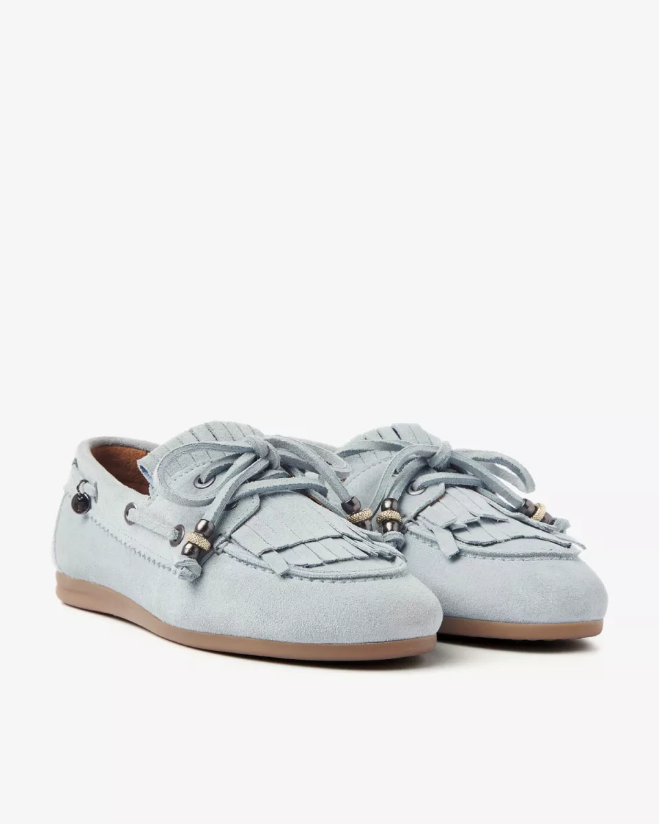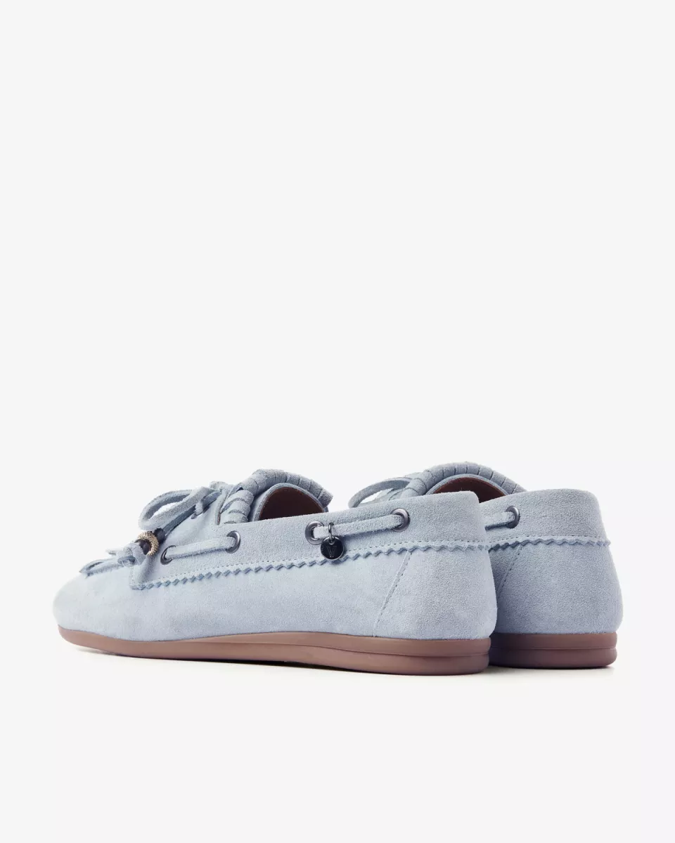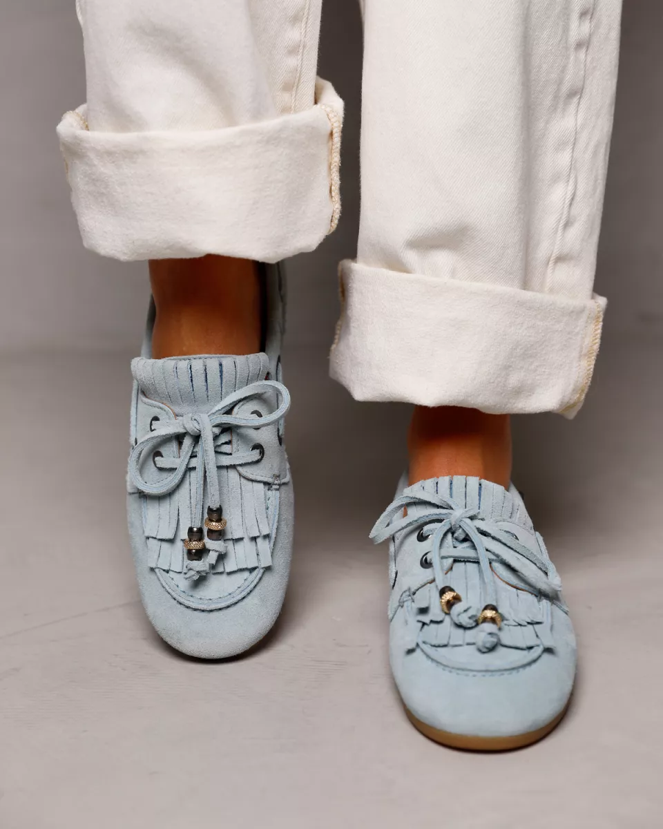 Soms wil je gewoon een dames schoen die je overal bij kunt aantrekken, maar die wel nét dat beetje extra heeft. Deze lichtblauwe mocassins zijn precies dat. June Loua heeft een klassieke mocassin-vorm met een afgeronde neus en een flexibele, lichtbruine zool gemaakt van comfortabel rubber. De opvallende veterdetails rondom de zijkant geven dat authentieke bootschoen accent, terwijl de franjes op de wreef zorgen voor een speels en nonchalant effect. En die sierlijke strik met decoratieve kraaltjes? Die maken June Loua helemaal af!