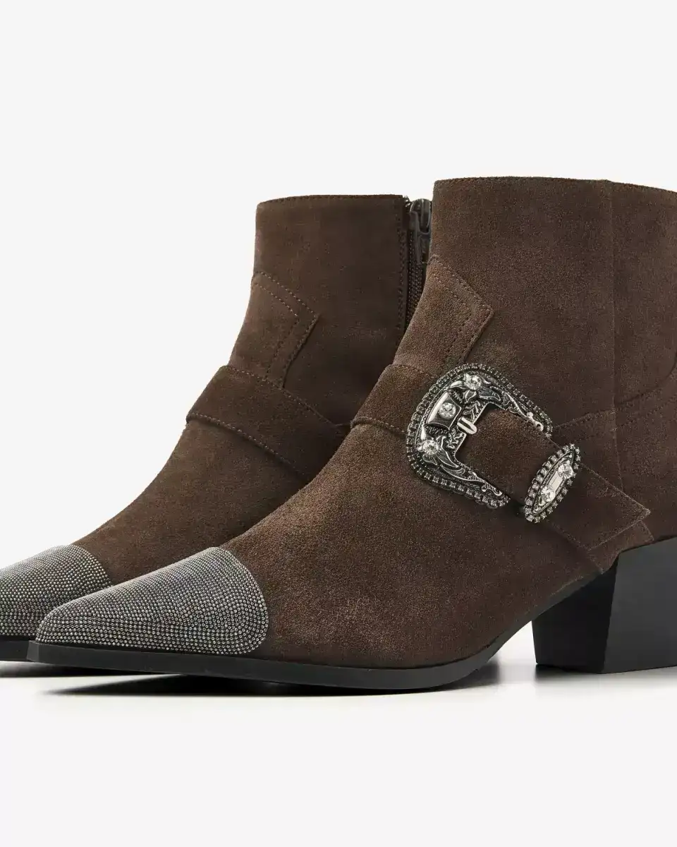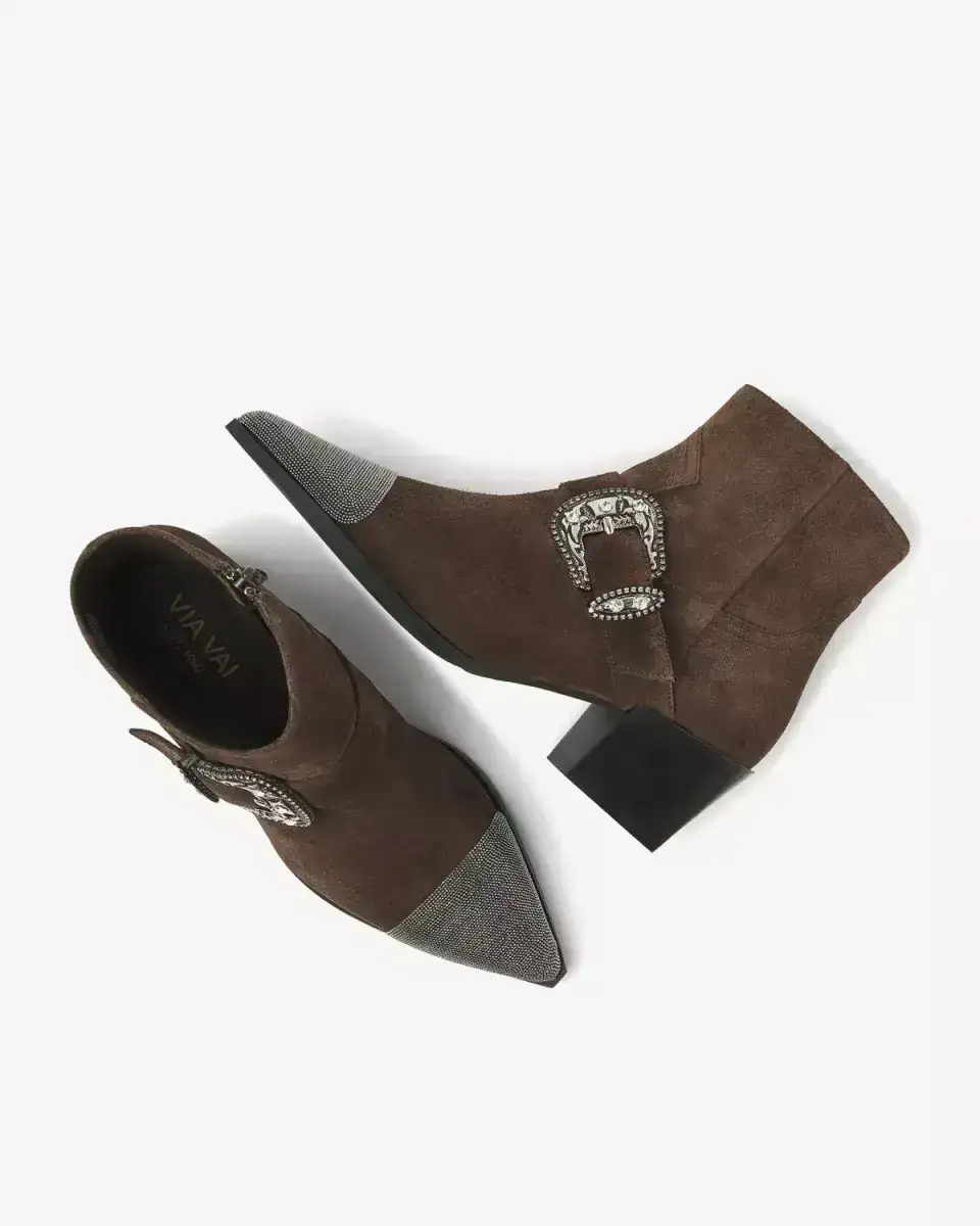 Lets talk details! Maak kennis met Kate Jemma, hét nieuwe statement laarsje voor deze winter. Kate Jemma is de perfecte mix van stoer, vrouwelijk en een tikkeltje rebels. De enkellaarsjes zijn gemaakt van hoogwaardig suède in een warme donkerbruine kleur die moeiteloos matcht met jouw garderobe. Het spitse silhouet en de zilverkleurige metallic neus geven een edgy twist, wat zorgt voor de ultieme eyecatcher look. En dat sierlijke riempje met gesp? Pure western-chic vibes!