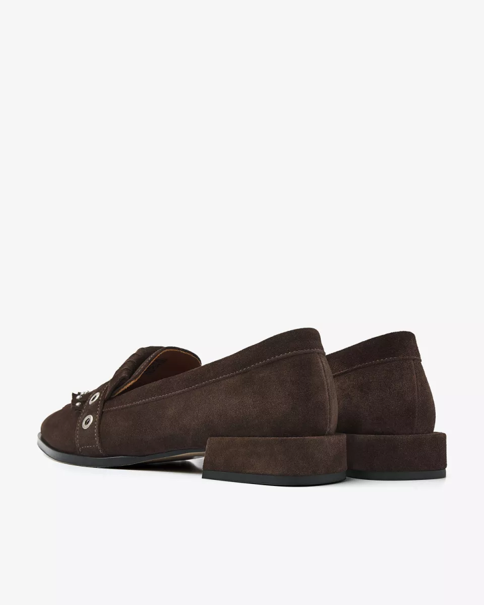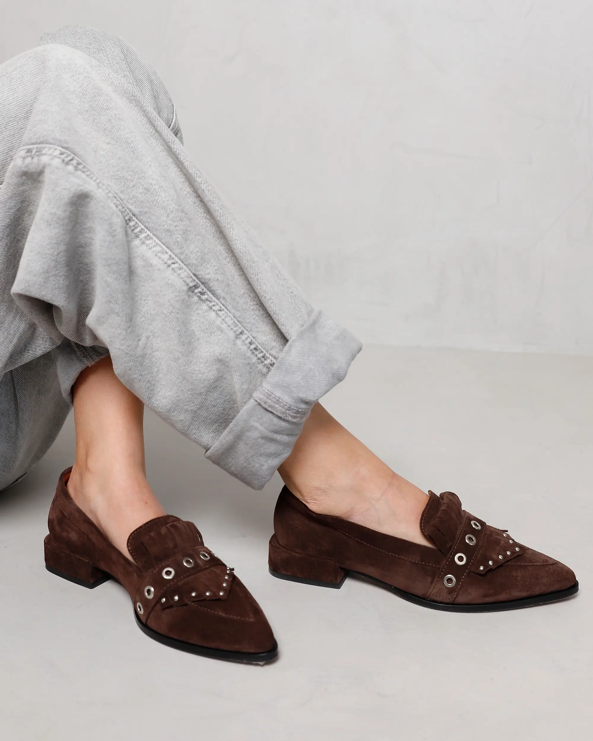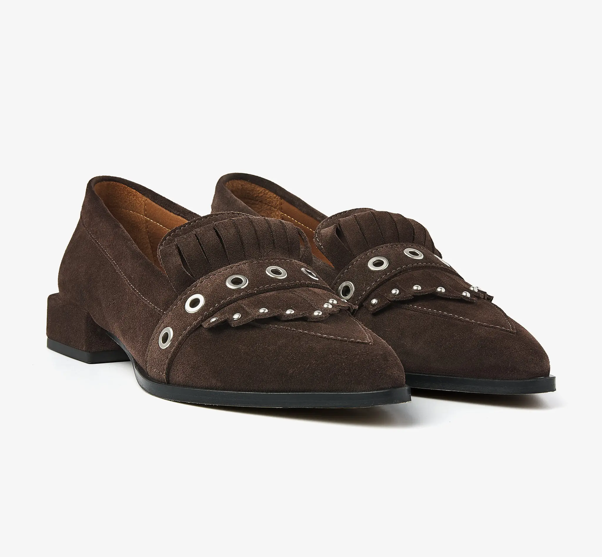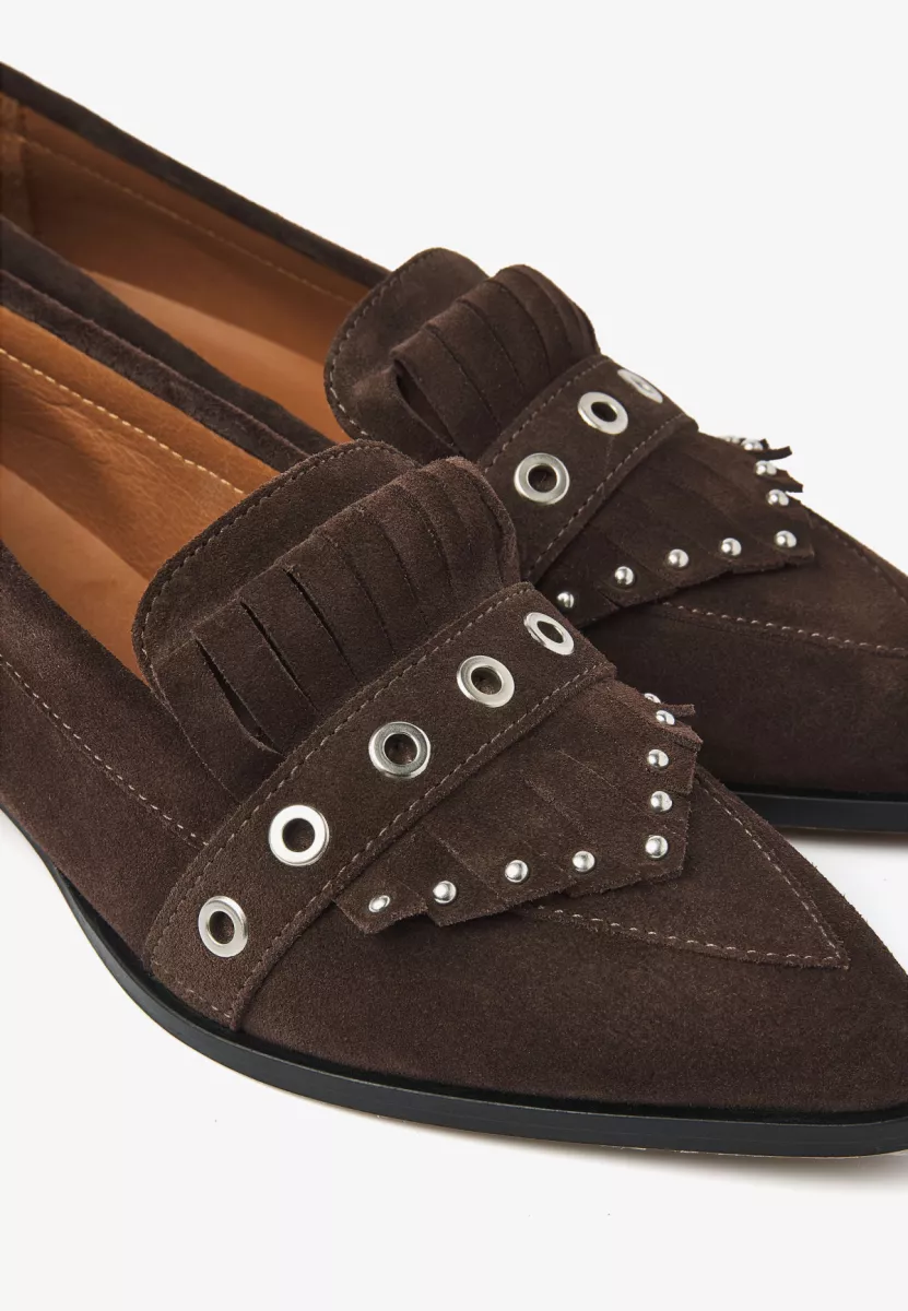 Western meets classy! Maak kennis met Jazz Emily, de statement loafer die jouw outfit nét dat beetje extra pit geeft. Deze donkerbruine allrounder is uitgevoerd in hoogwaardig suède en valt op door de eyecatching details. De spitse neus en het subtiele blokhakje zorgen voor een elegante, vrouwelijke look, terwijl de zilverkleurige studs en eyelets juist een stoere twist geven. Its pretty obvious Jazz Emily has it all!