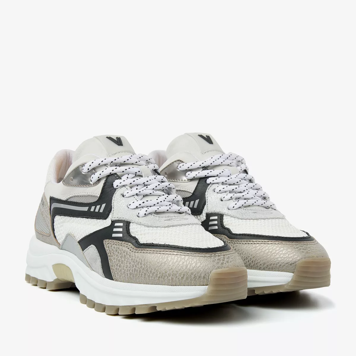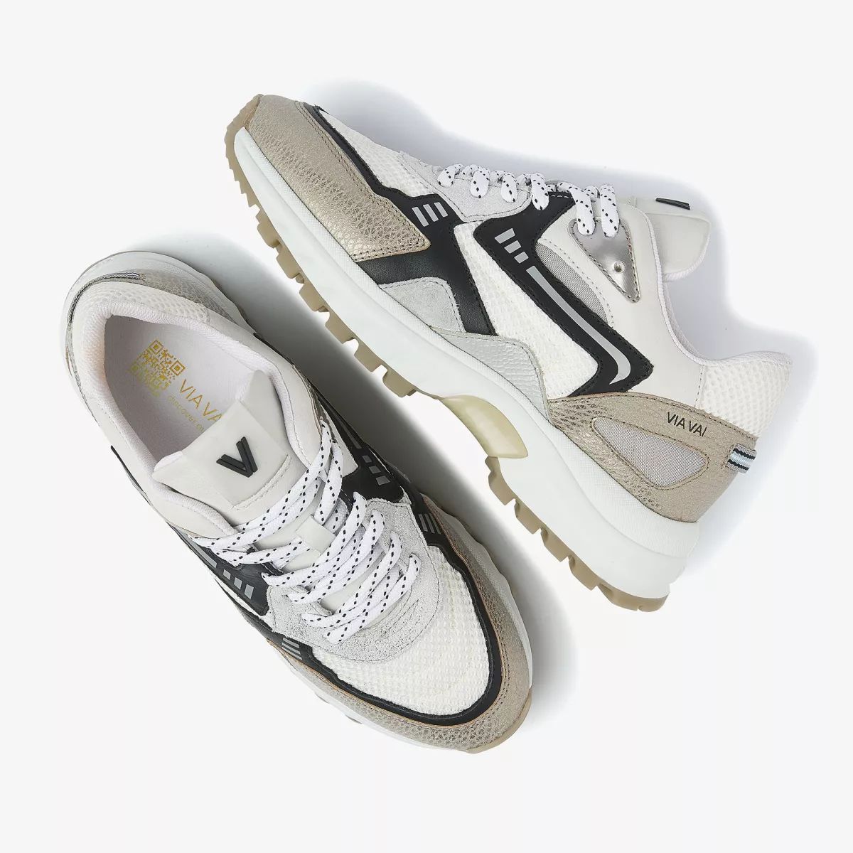 6222-02-1218 Danae Noah beige/grijs/zwart Chunky noppenzool Metallic details Uitneembaar voetbed Mesh binnenvoering Combinatie van hoogwaardig leer, suède en mesh Handgemaakt in Portugal