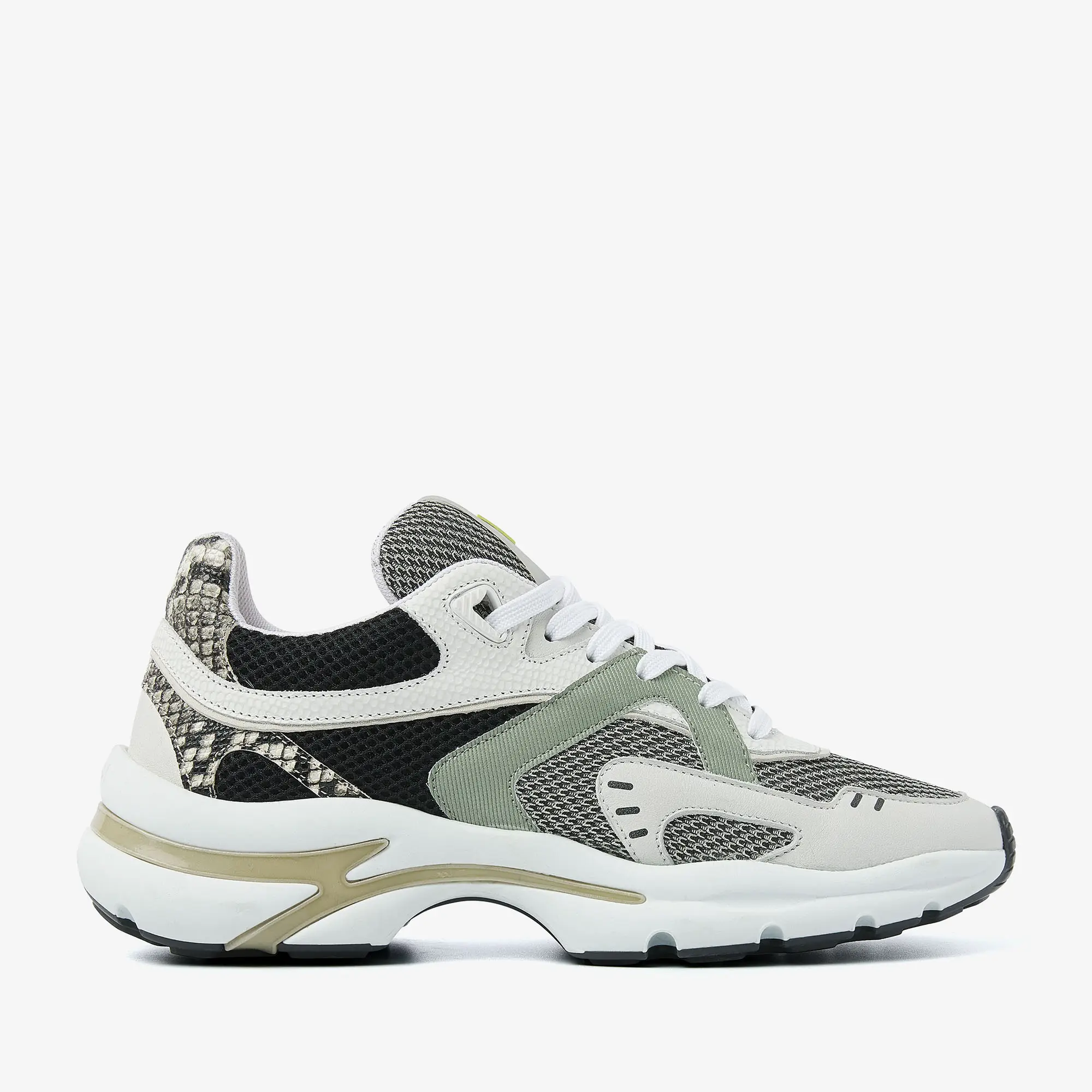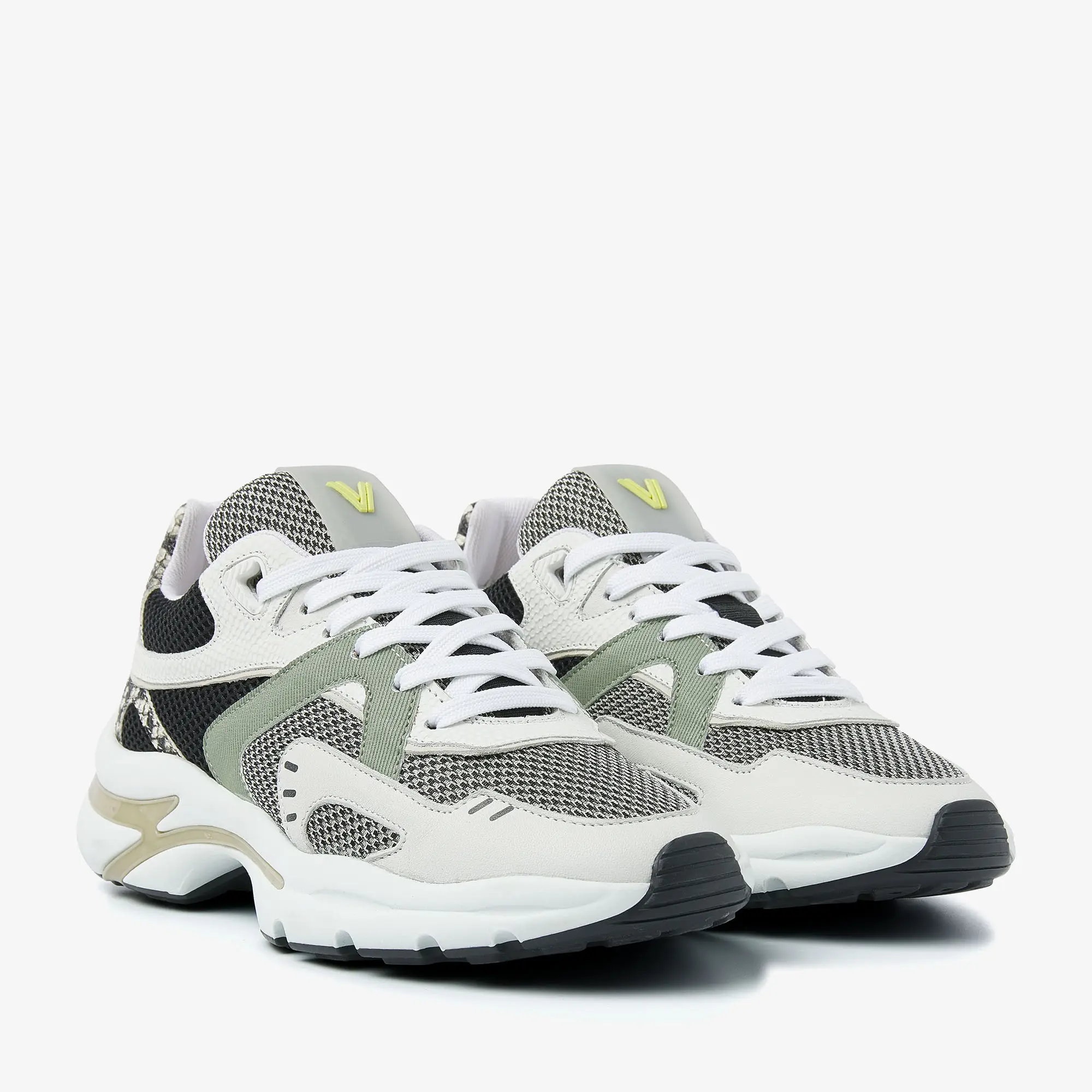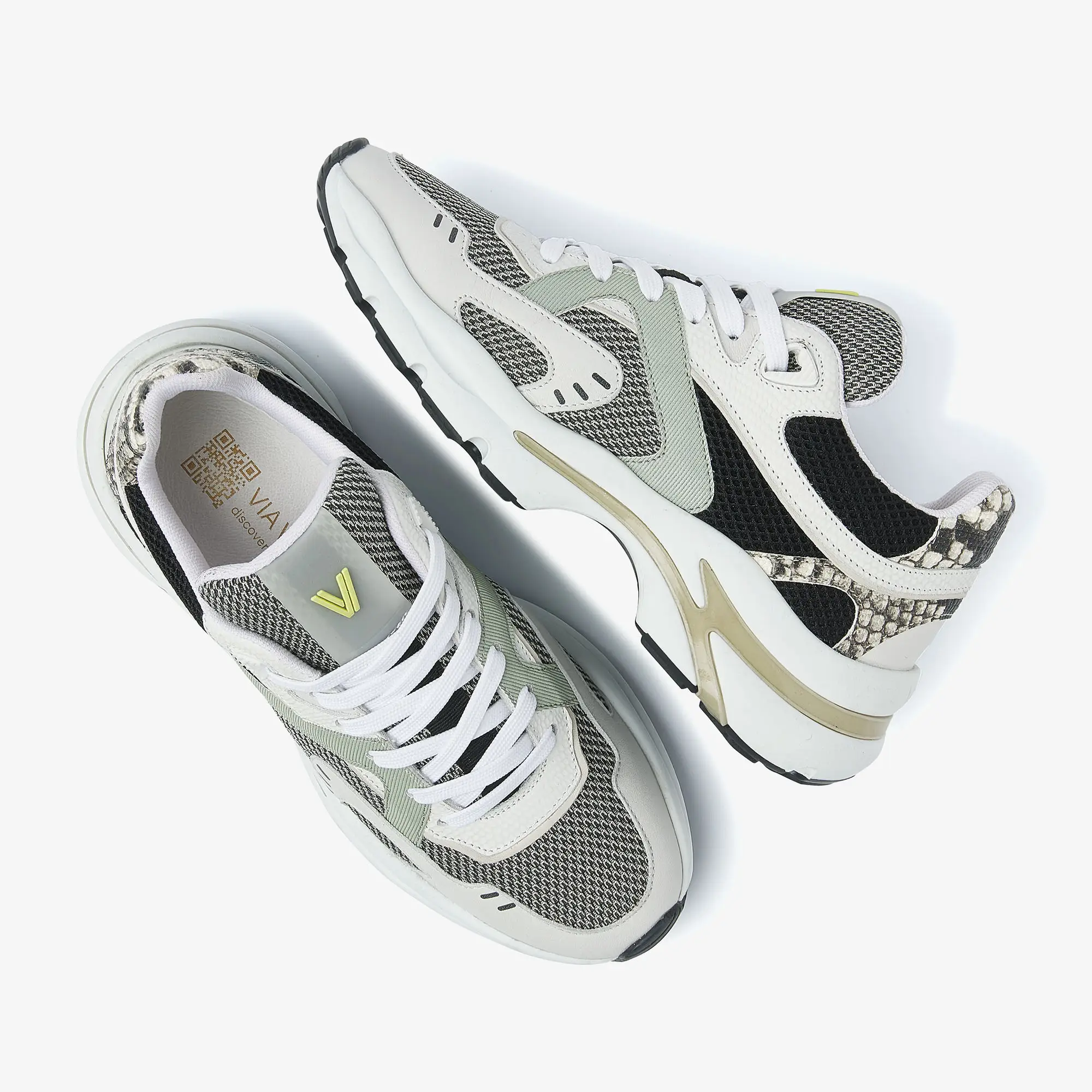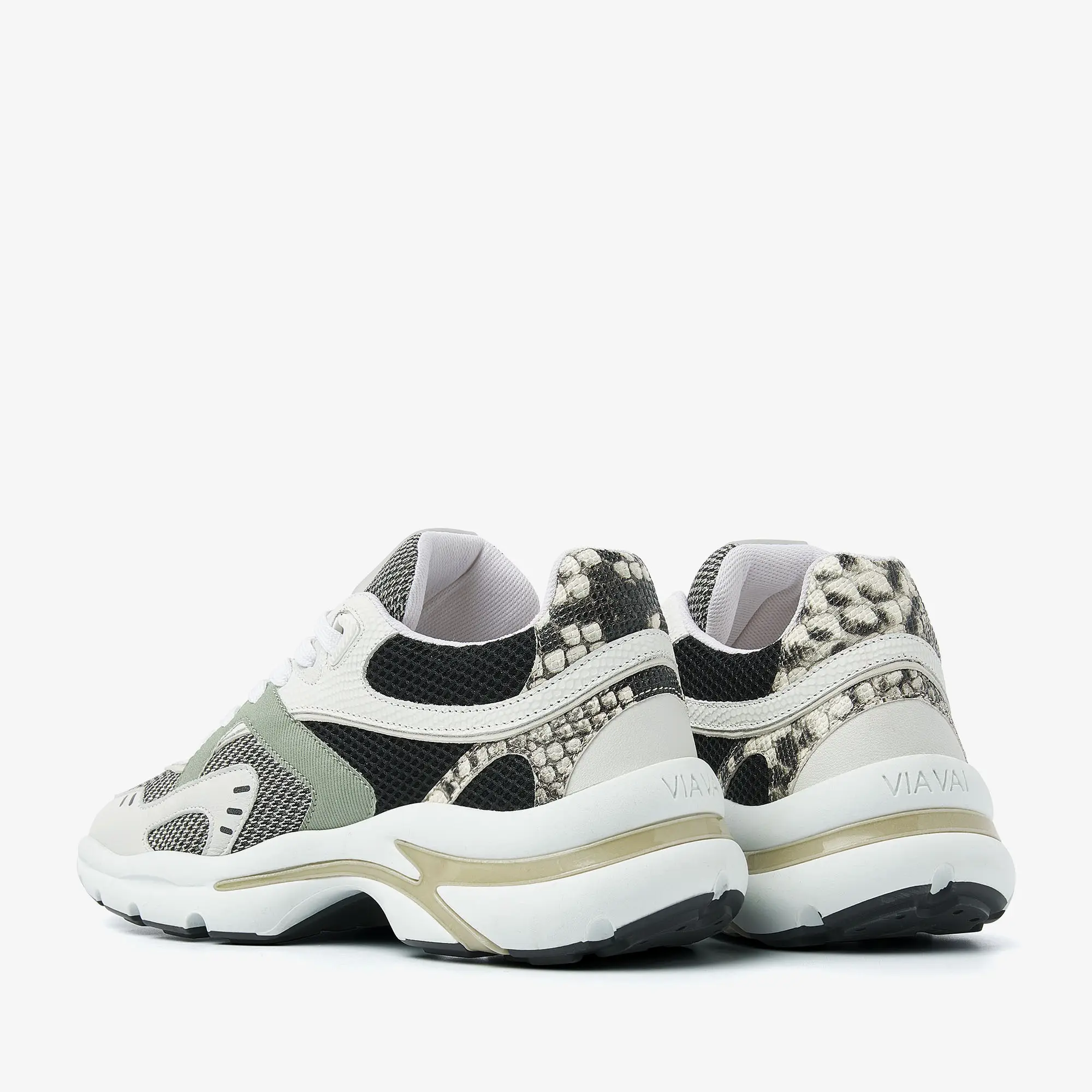 Slangenprint details Mesh tong met VIA VAI logo Sportieve perforaties Chunky zool met beige detail Uitneembaar voetbed Mesh binnenvoering Combinatie van hoogwaardig leer, mesh en textiel