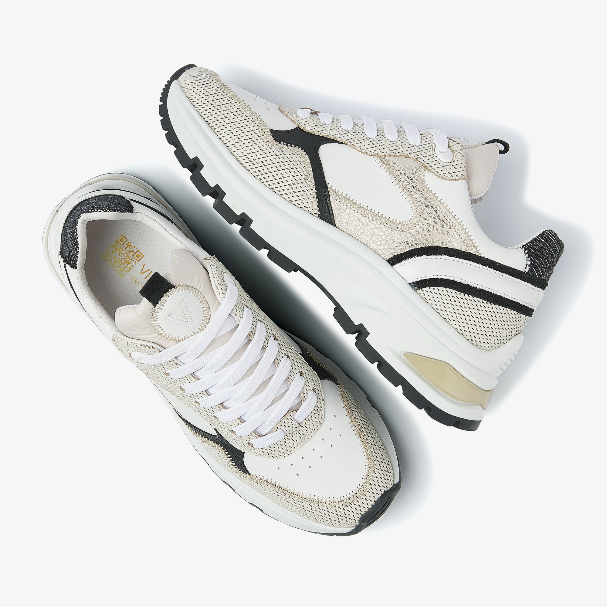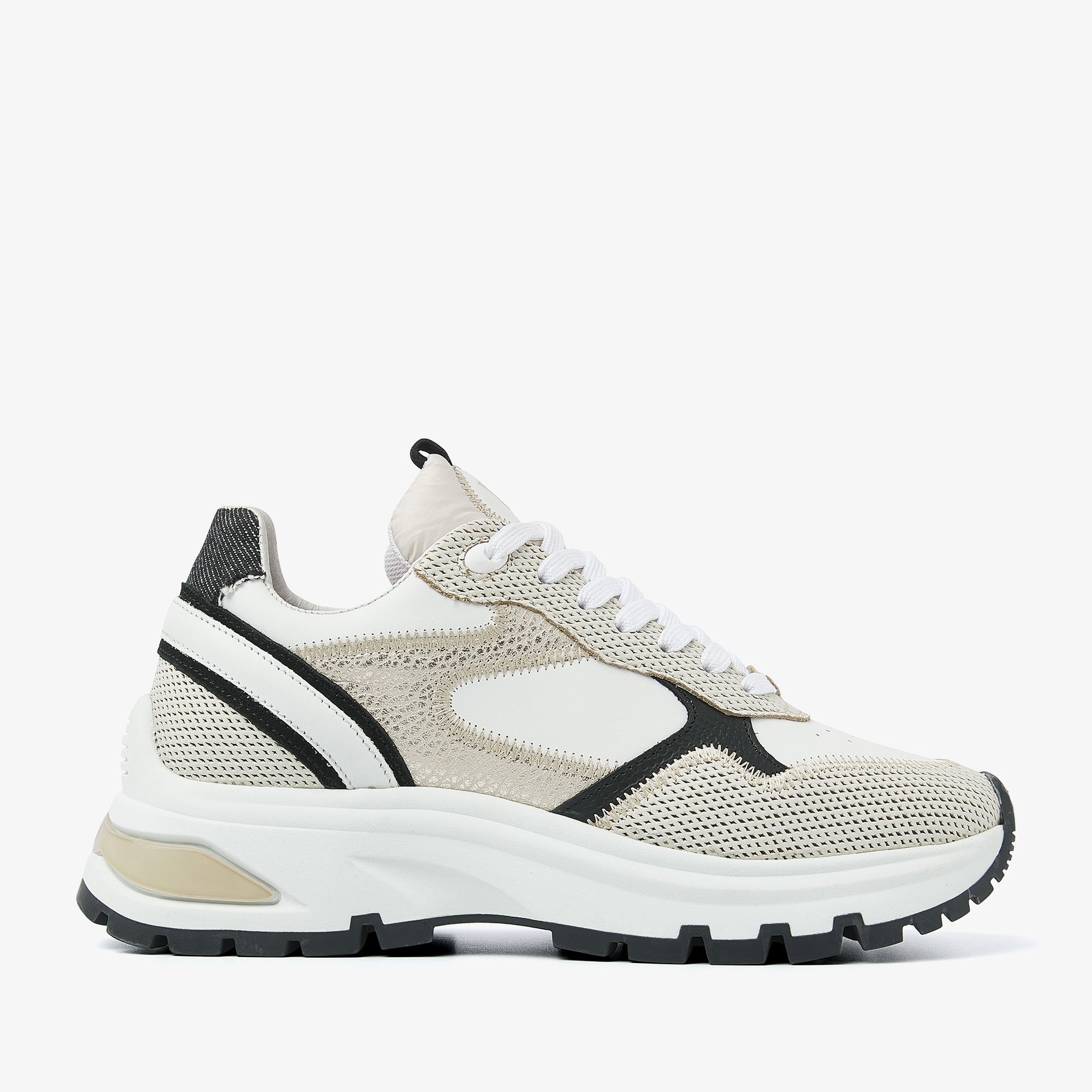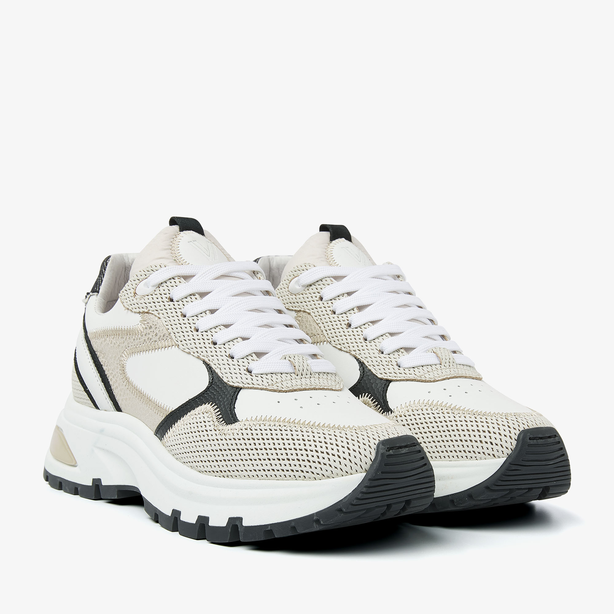 Chunky zool Speelse stiksels Sportieve perforaties in de neus Textuurdetail op de hiel Uitneembaar voetbed Leren binnenvoering Combinatie van hoogwaardig leer, suède en textiel Handgemaakt in Portugal