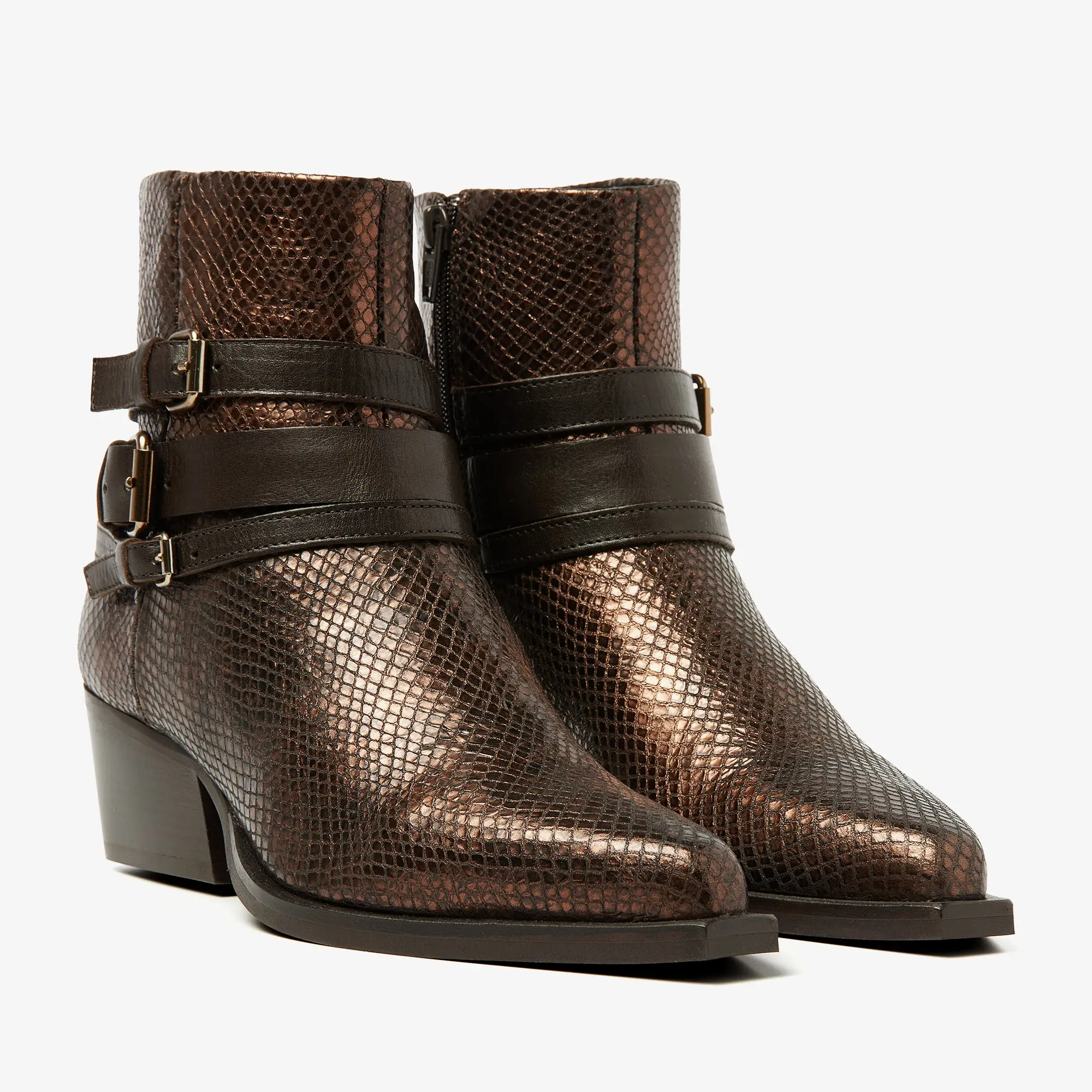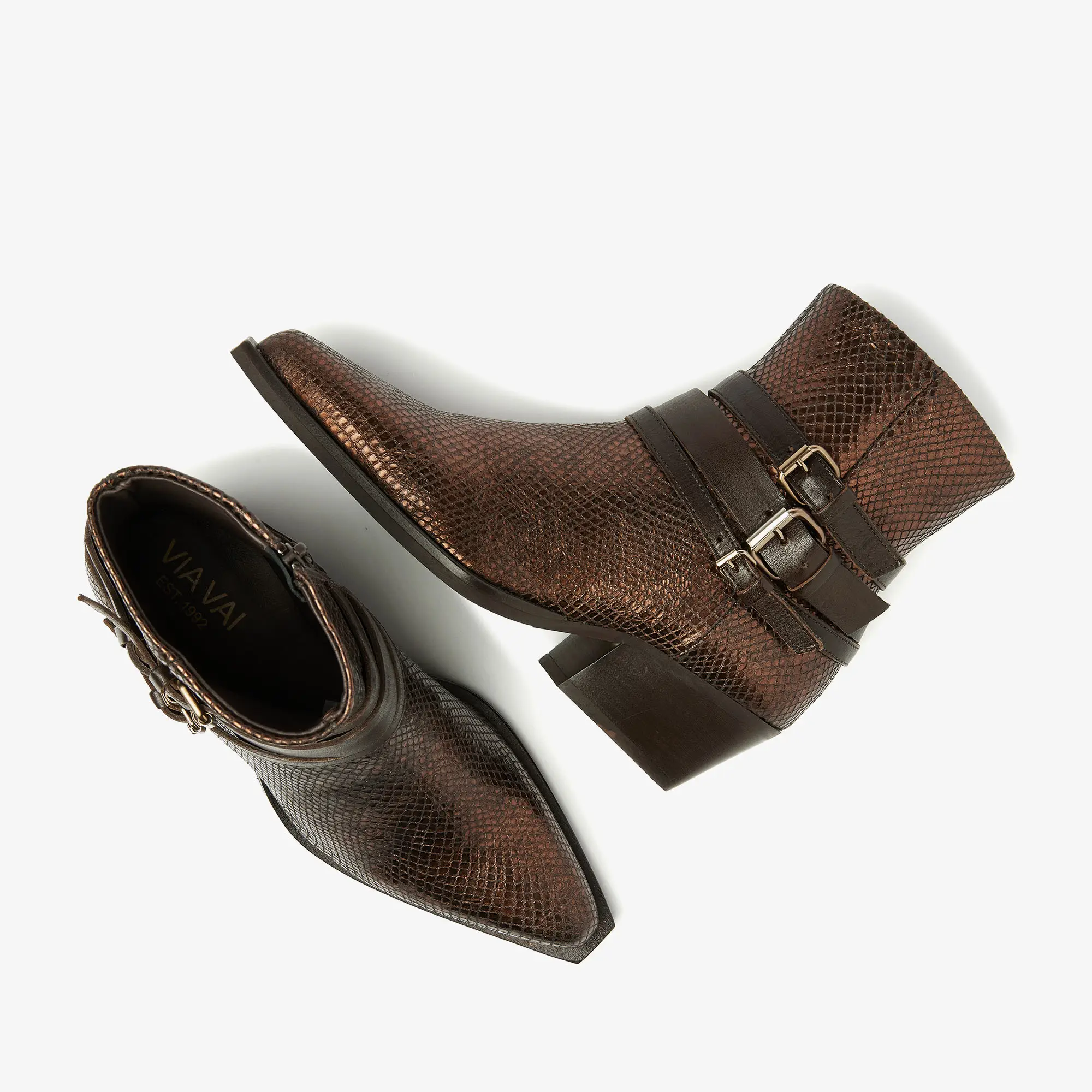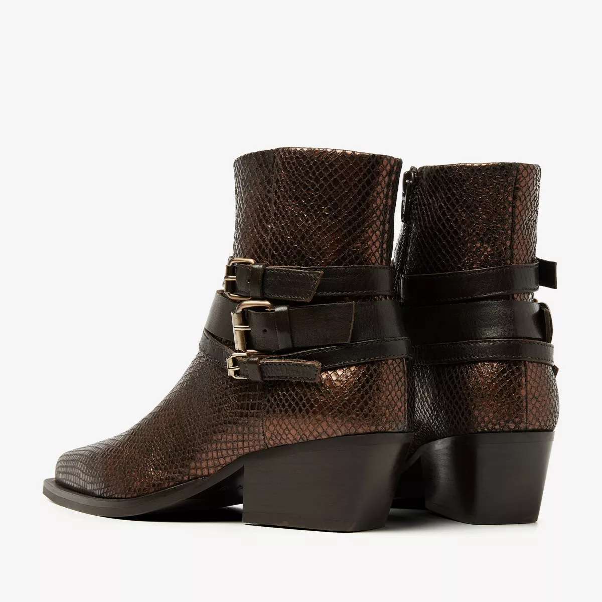 Do Livia bruine enkellaarsjes Well, hello there. Do Livia is een stijlvol en tijdloos laarsje met eyecatching elements. Wat direct opvalt, zijn de decoratieve straps met gouden gespjes in verschillende formaten. In combinatie met de subtiele slangenprint-finish geeft dat de bruine enkellaarsjes een trendy look. Voeg daar een vleugje western aan toe en je hebt echt alles in één!