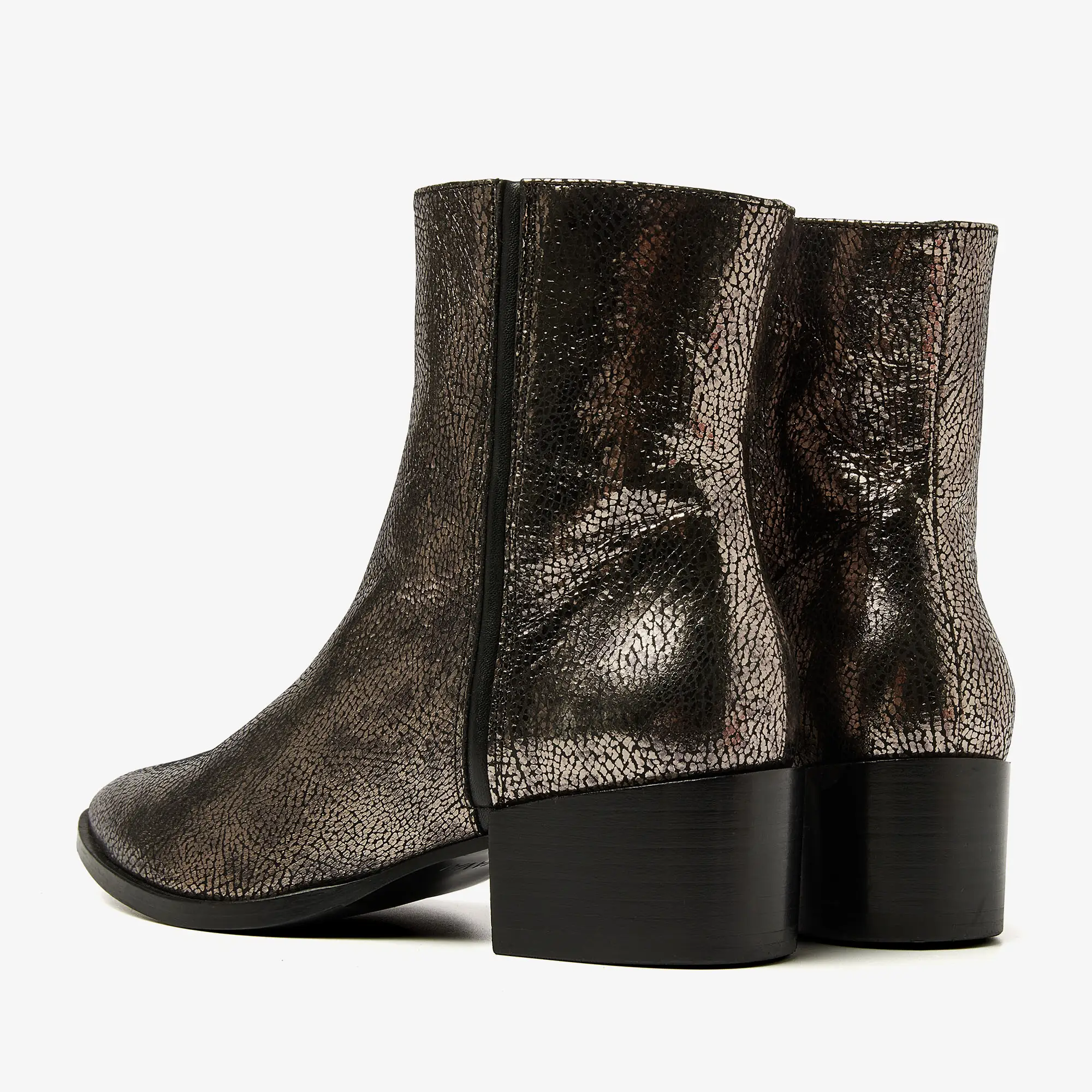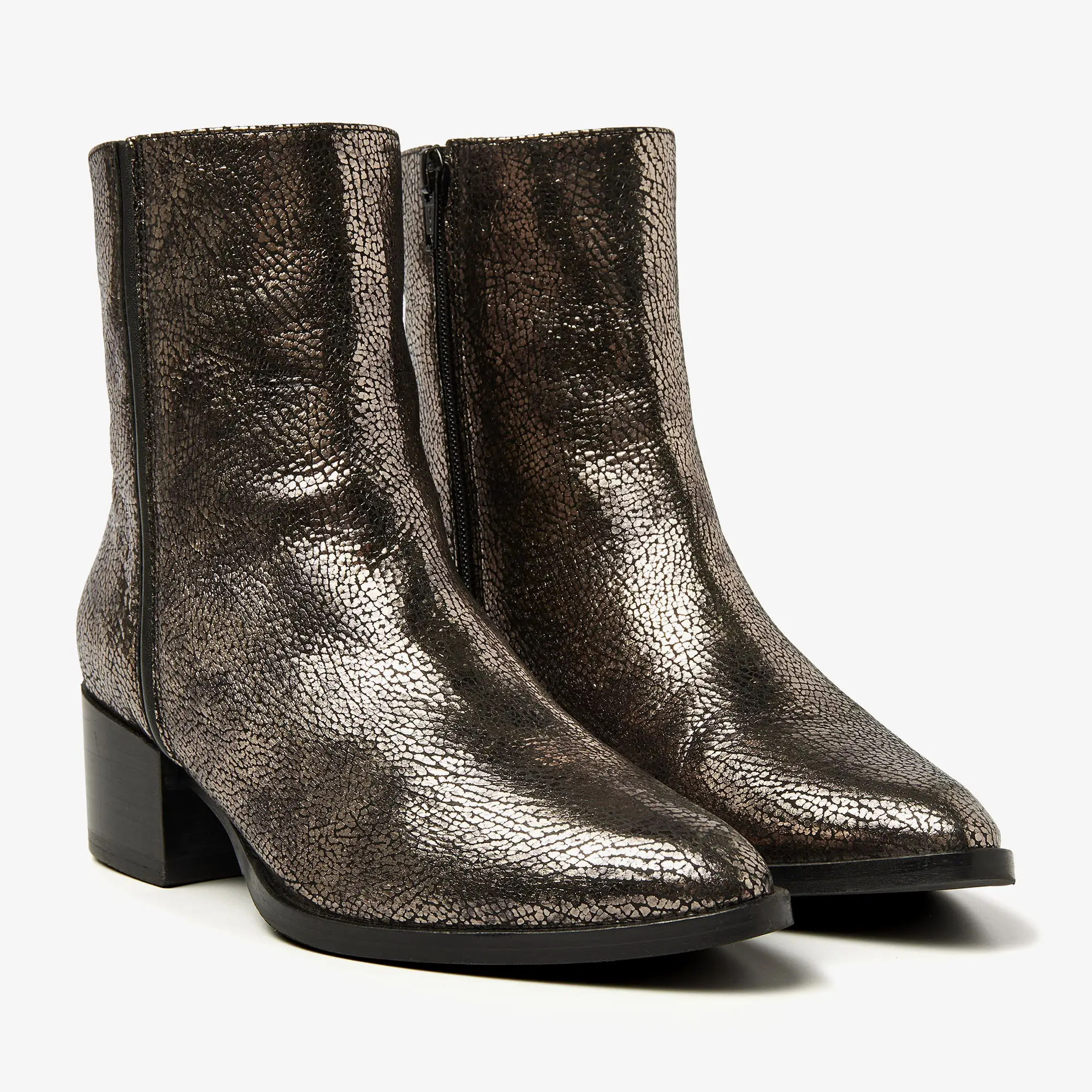 metallic enkellaarsjes zijn gemaakt van hoogwaardig leer voor een trendy look. Het subtiele blokhakje geeft je net wat extra lengte voor een vrouwelijke touch. Extra leuk: de overgang van het hakje naar de zool voegt een speels effect toe