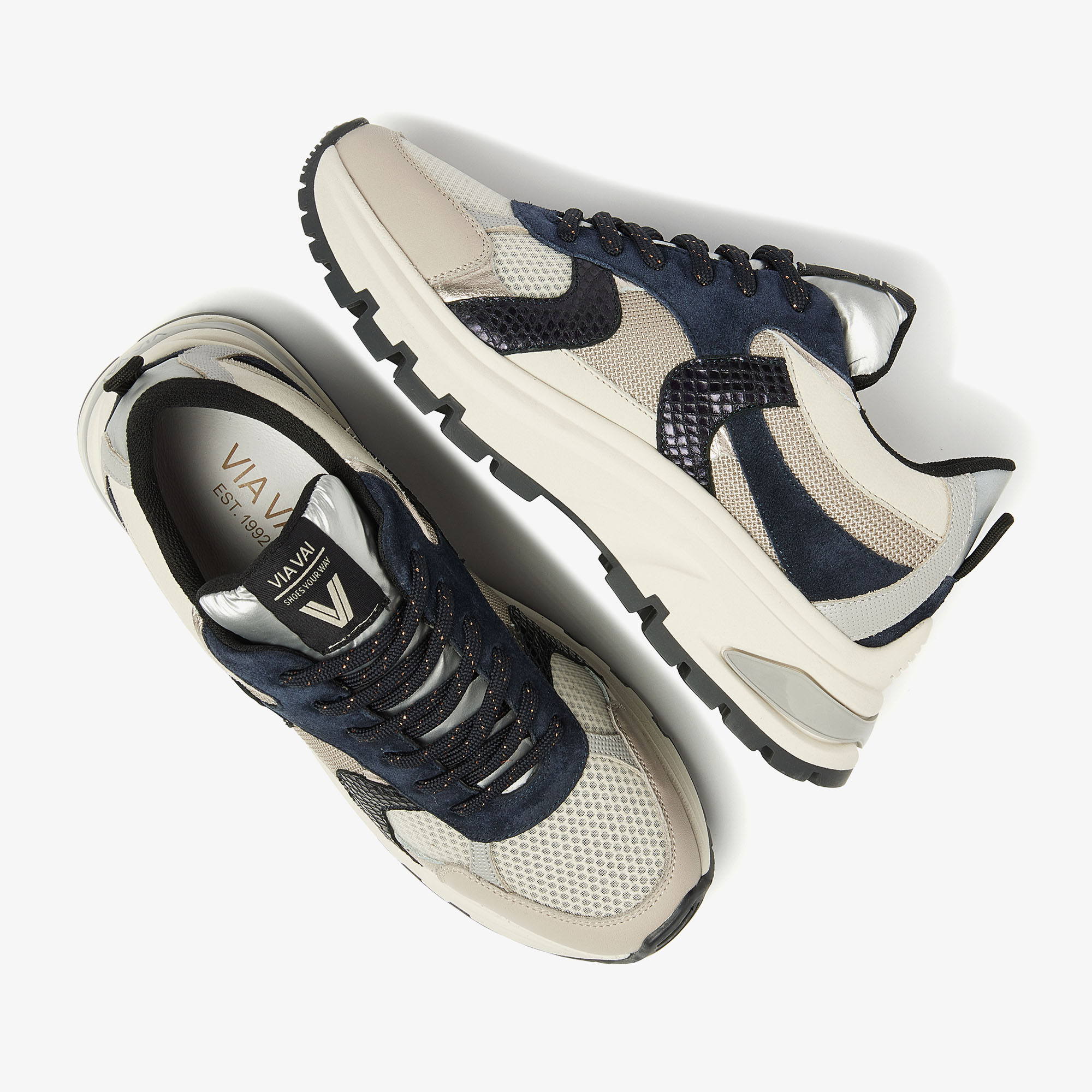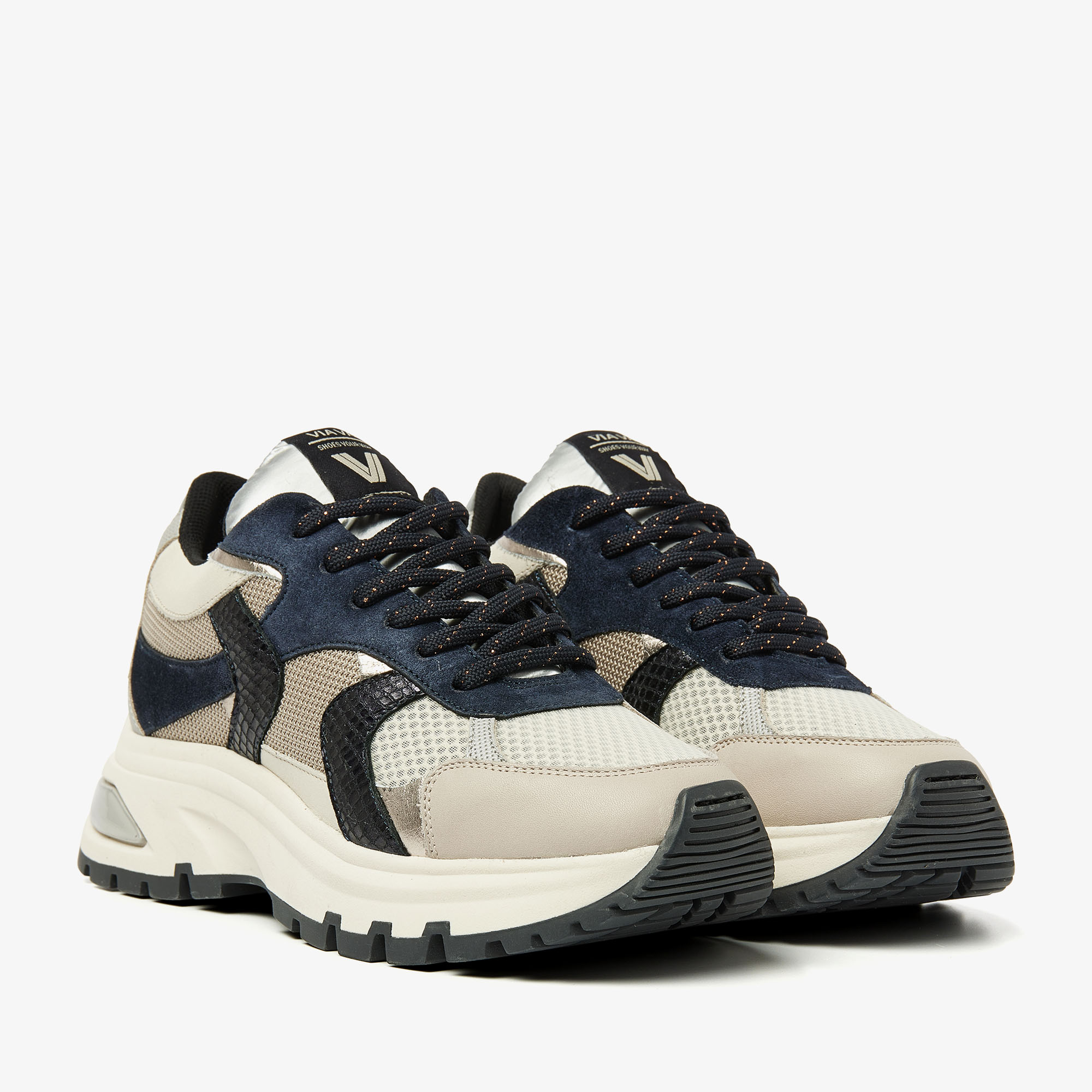 Bestseller sneaker Liz is voor dit seizoen in een fabulous jasje gestoken. Ontdek Liz Ivy, onze favoriet! Dankzij de sportieve belijningen en metallic details is deze meerkleurige sneaker to die for. Liz Ivy is gemaakt van verschillende materialen zoals leer, suède en mesh voor een verrassend dynamische look. De slangenprint details maken de chunky sneakers tot ware eyecatchers.