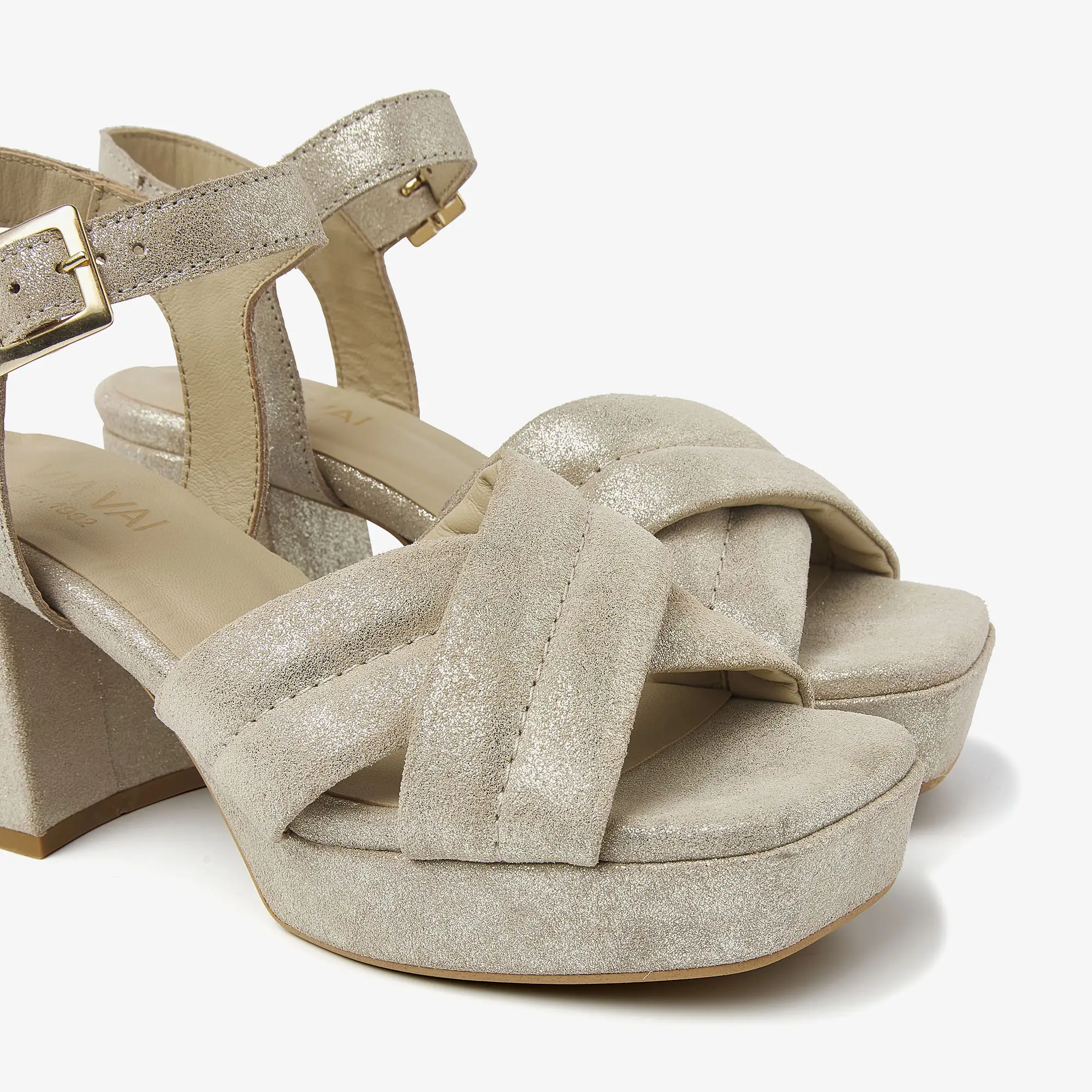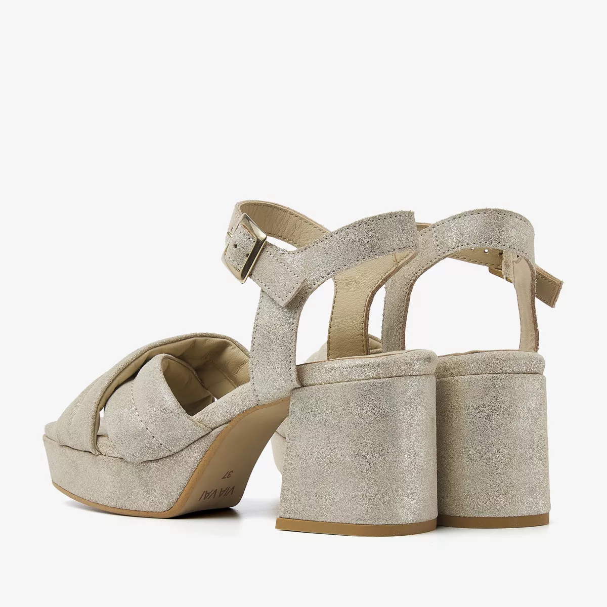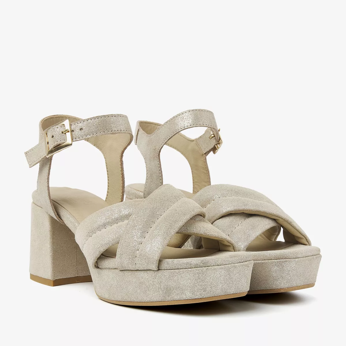 zomerse, gouden sandalen geven iedere outfit een sophisticated touch. Dankzij de padded, gekruiste banden en het met leer beklede voetbed zitten de sandalen heerlijk. De retro plateauzool en stevige blokhak geven je net wat extra lengte. Vrouwelijk én comfortabel! Cassia Gabriell is gemaakt van hoogwaardig suède met glitters, wat zorgt voor een feminine look. Of je nu een speciale gelegenheid of gewoon een kantoordag hebt: met Cassia Gabriell ben jij ready to shine.