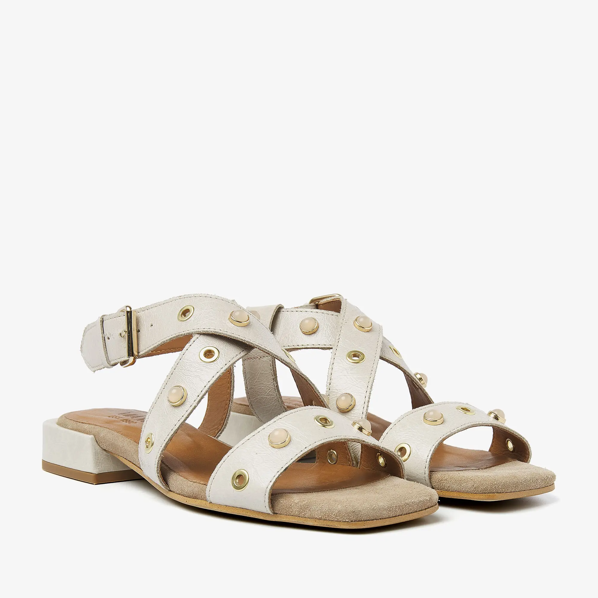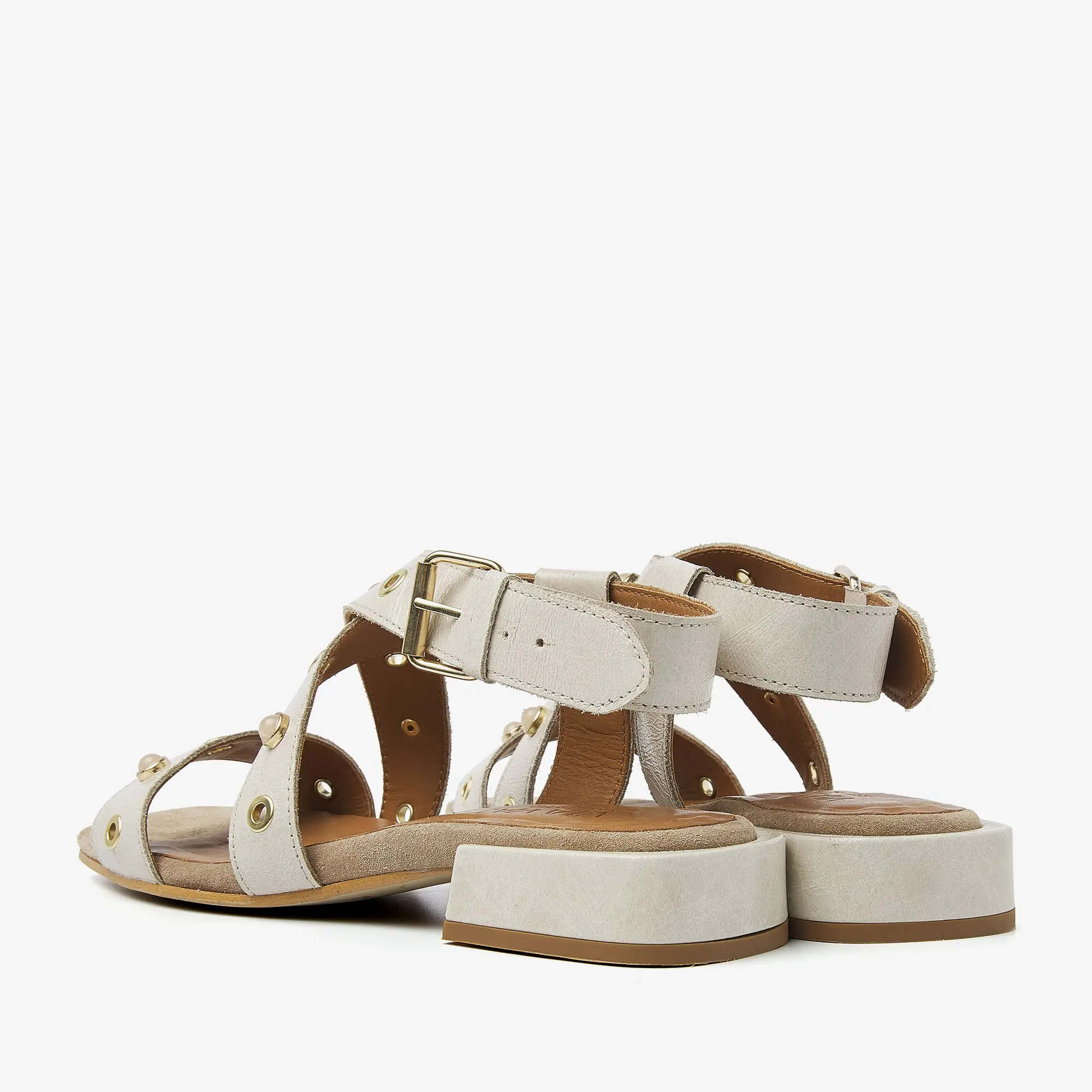 Op zoek naar sandalen die zowel stoer als vrouwelijk zijn? Dan is Gigi Polly your new best friend. Deze beige sandalen zijn gemaakt van hoogwaardig lakleer, wat het materiaal een edgy touch geeft. De speelse banden zijn afgewerkt met goudkleurige studs, waardoor Gigi Polly direct de spotlight steelt. Het subtiele blokhakje is bekleed met leer voor een luxueuze uitstraling. Dankzij het zachte, padded voetbed lopen de sandalen ook nog eens heerlijk. Need we say more?