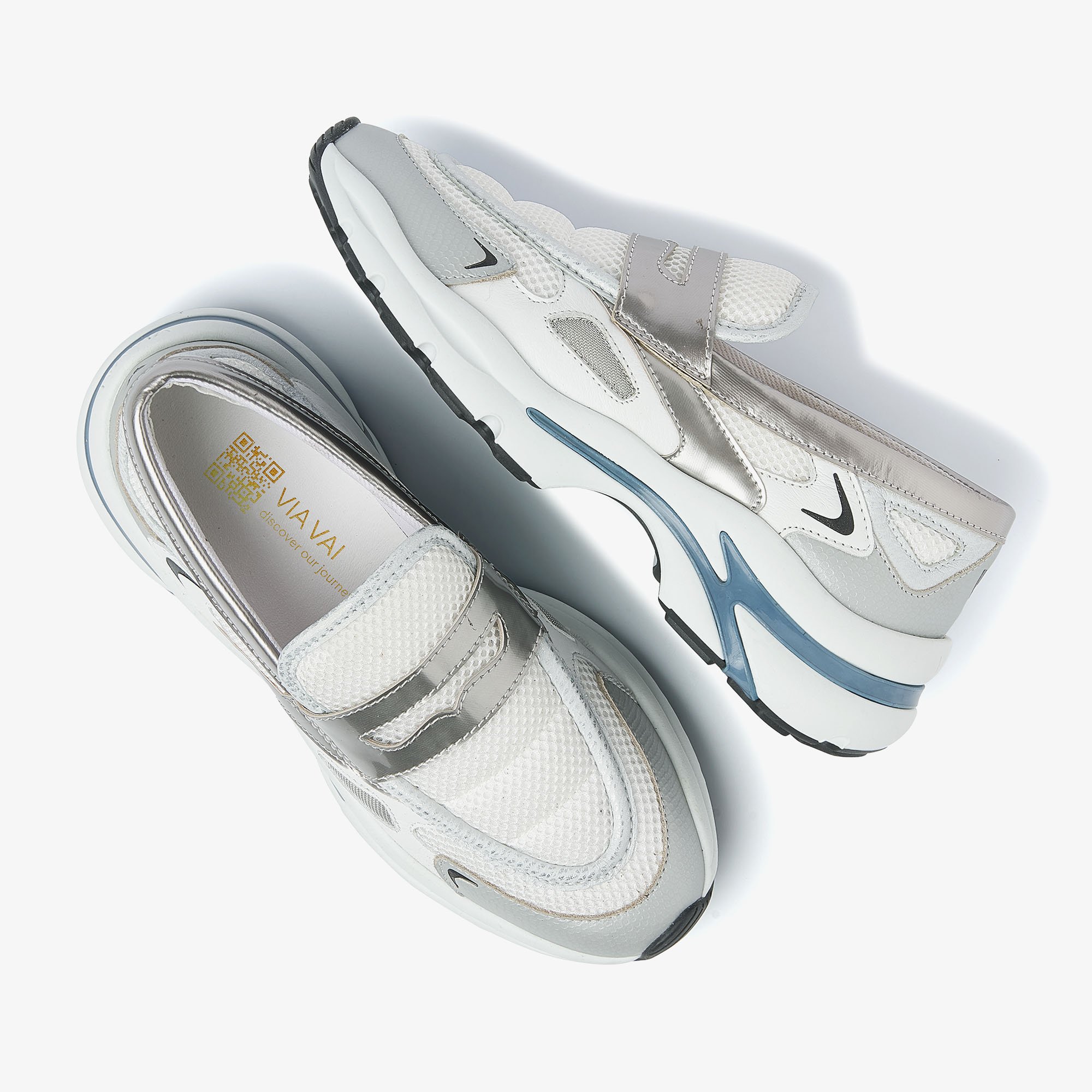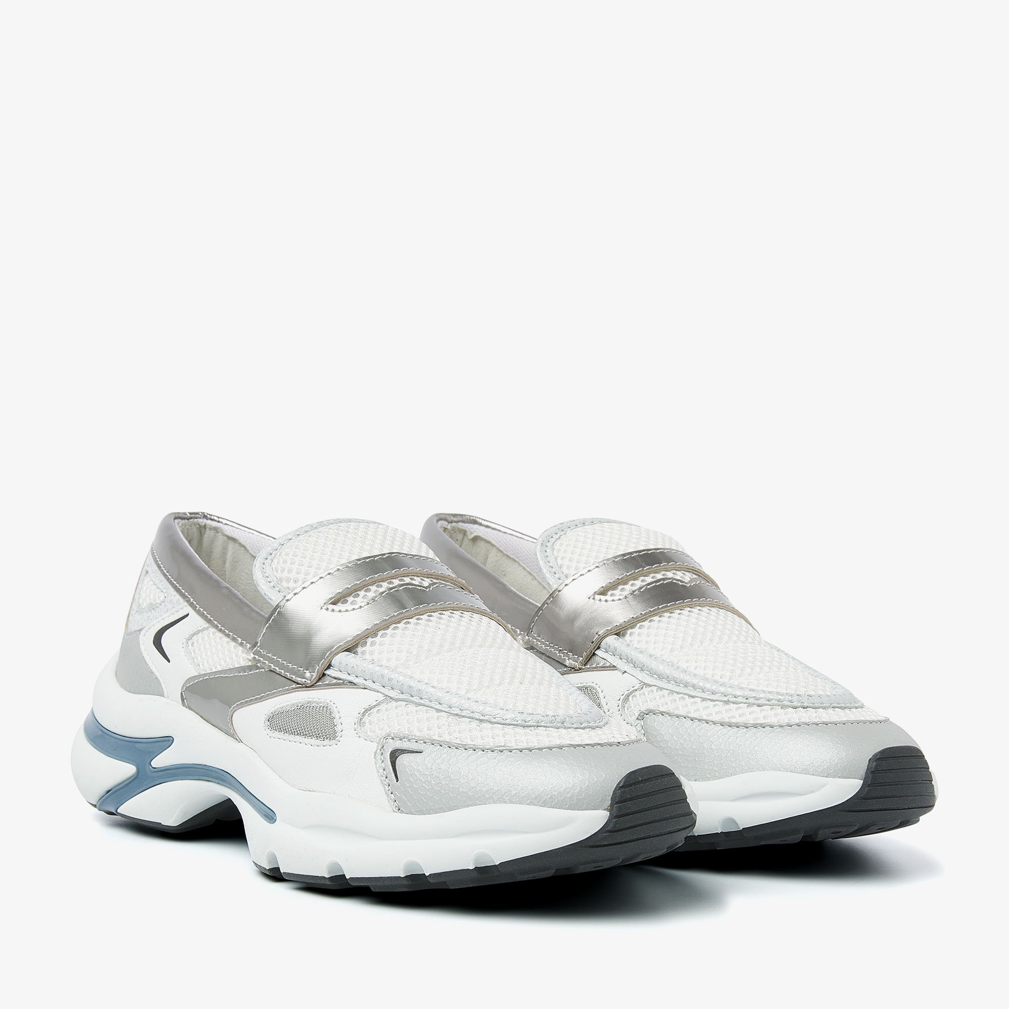Chunky zool met blauwe detail Metallic accenten Mesh binnenvoering Combinatie van hoogwaardig leer en mesh Handgemaakt in Portugal
