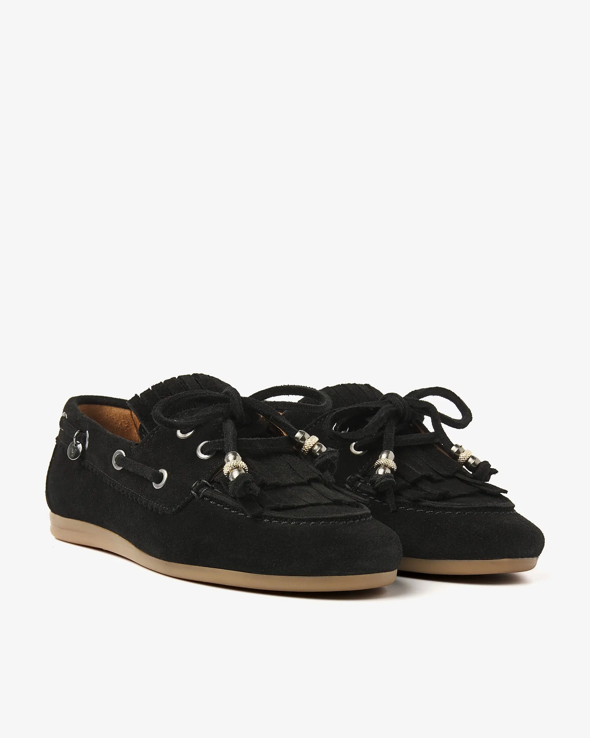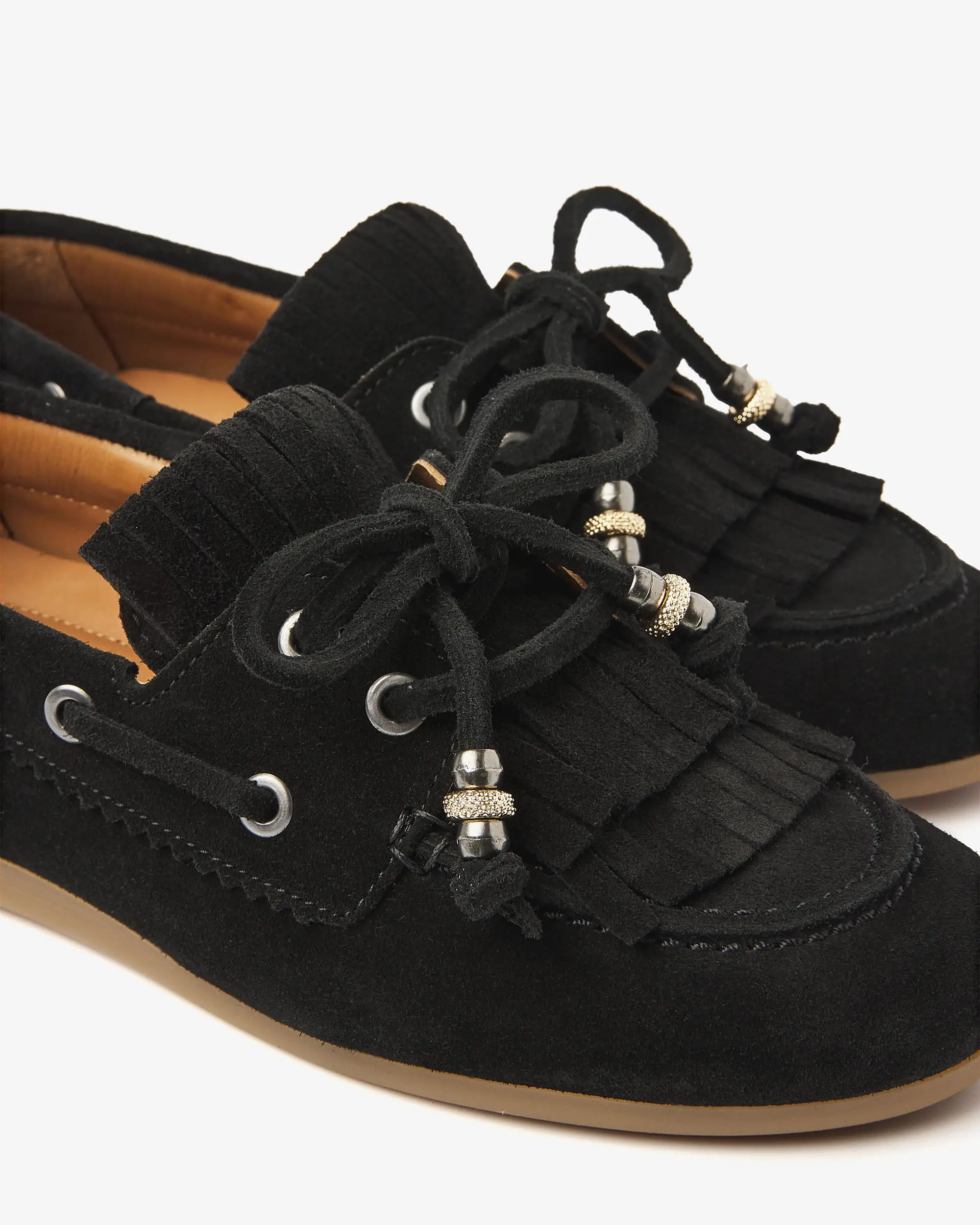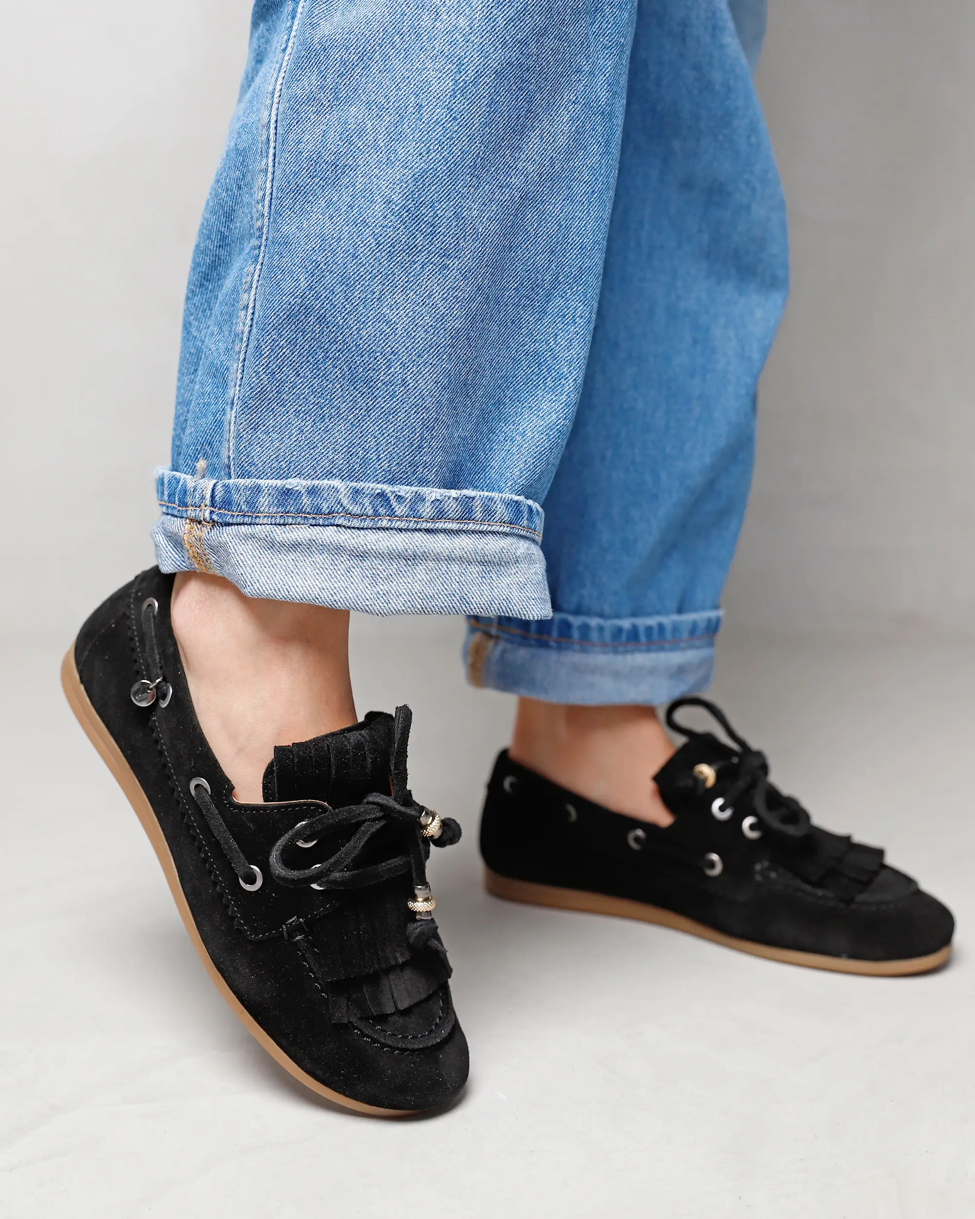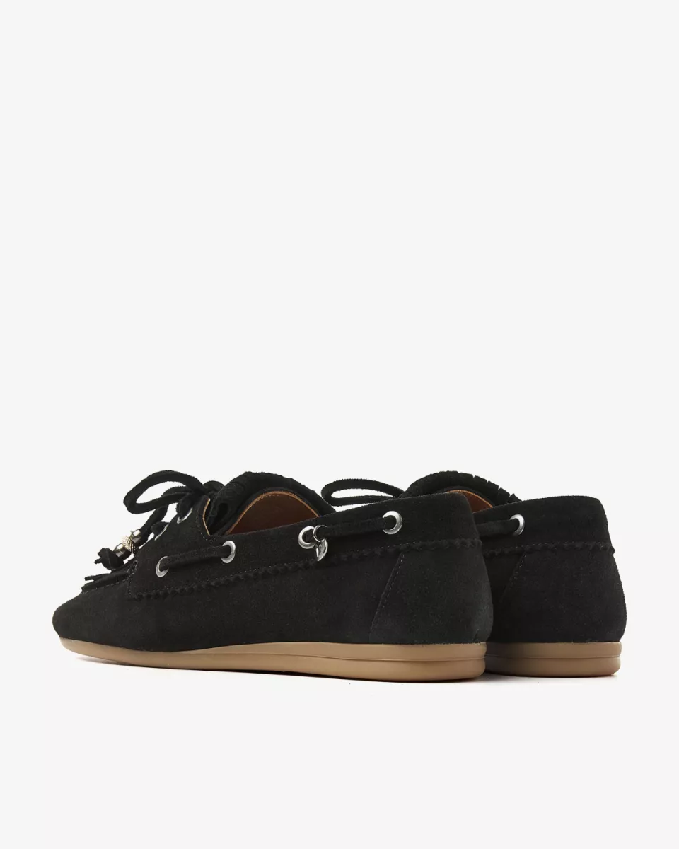 Soms wil je gewoon een schoen die je overal bij kunt aantrekken, maar die wel nét dat beetje extra heeft. Deze zwarte mocassins zijn precies dat. June Loua heeft een klassieke mocassin-vorm met een afgeronde neus en een flexibele, lichtbruine zool gemaakt van comfortabel rubber. De opvallende veterdetails rondom de zijkant geven dat authentieke bootschoen accent, terwijl de franjes op de wreef zorgen voor een speels en nonchalant effect. En die sierlijke strik met decoratieve kraaltjes? Die maken June Loua helemaal af!