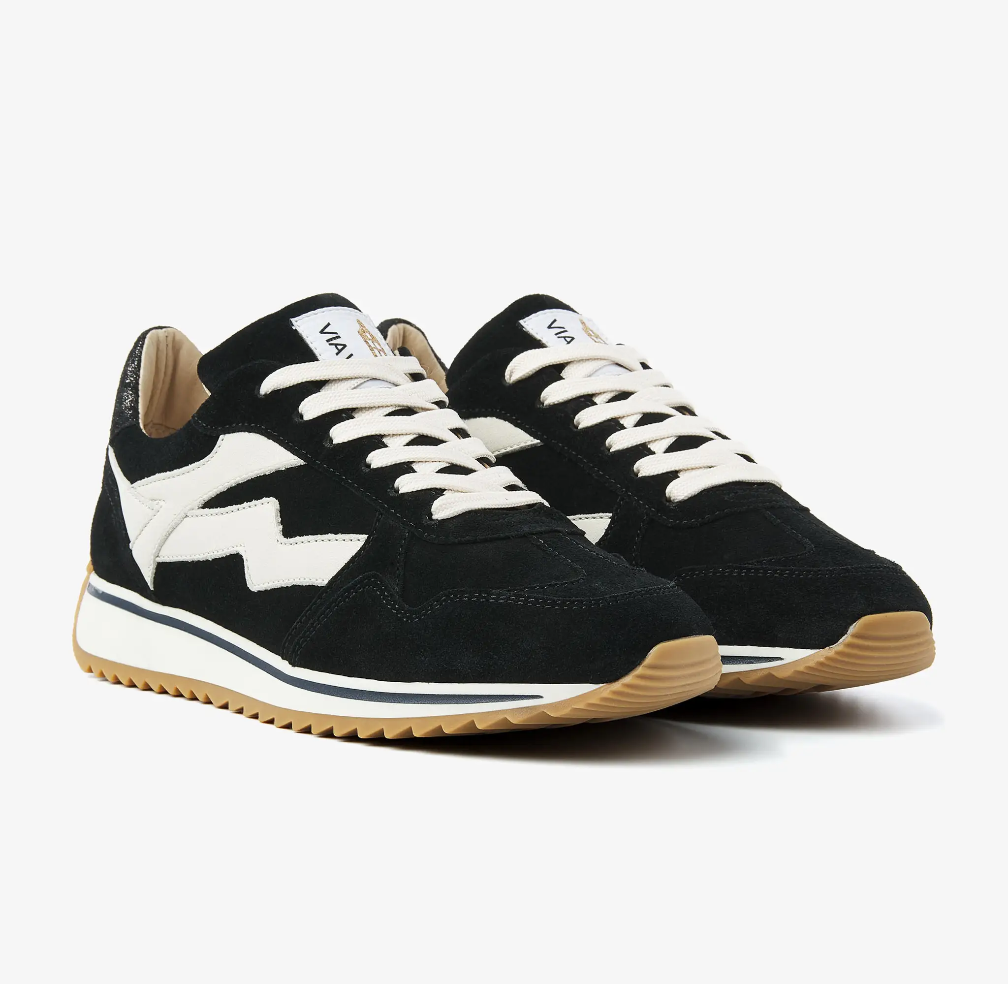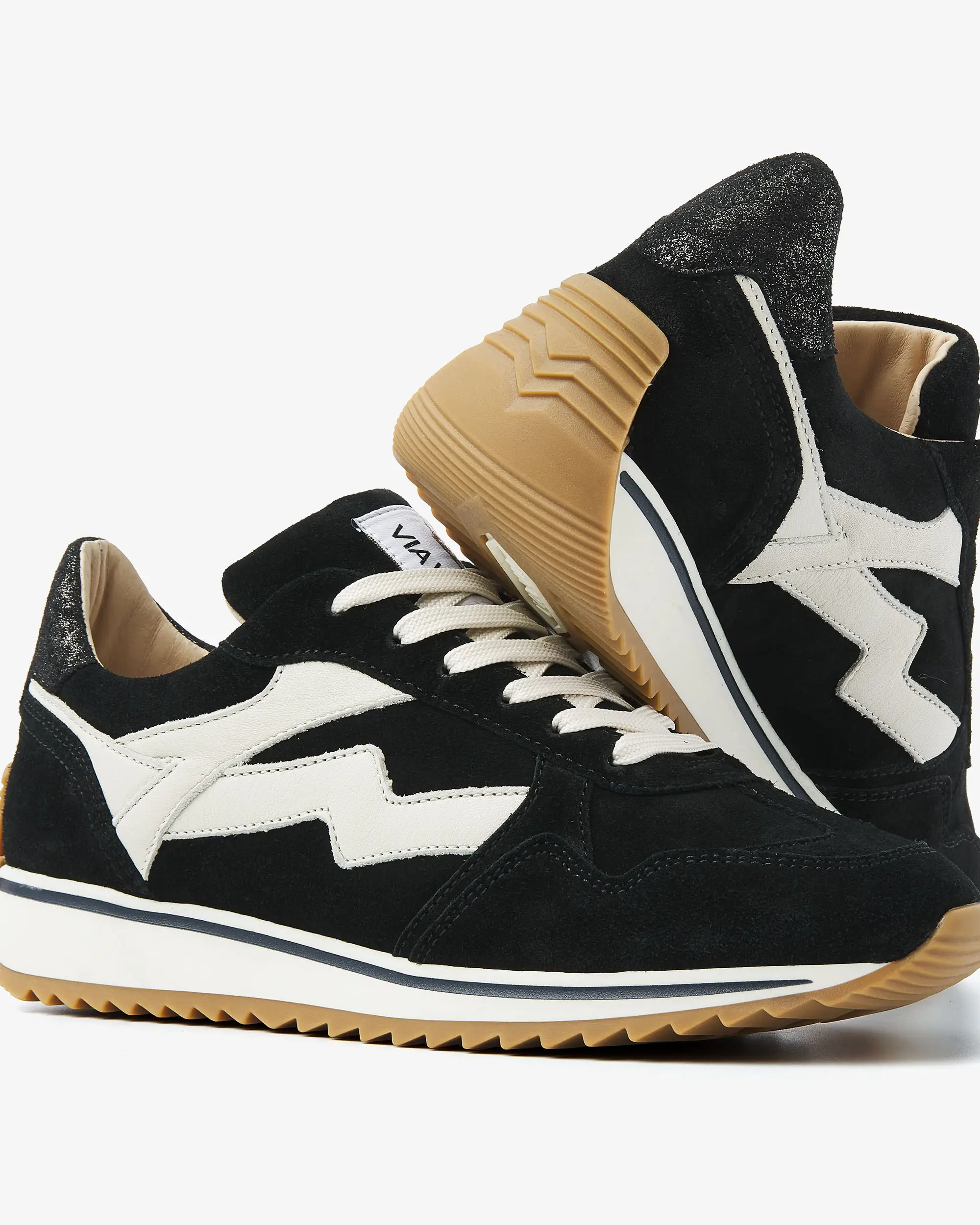 Retro vibes all over! Met deze trendy meerkleurige sneakers heb jij de ultieme retrolook te pakken. Deze eyecatcher straalt in een combinatie van zwart en wit, met zilveren accenten die zorgen voor een frisse touch. De sneaker is gemaakt van hoogwaardig suède en leer, waardoor deze niet alleen stijlvol, maar ook super comfortabel is. De rubberen zigzagzool geeft je een stevige grip én een sportieve look: Mikki Alex has it all!