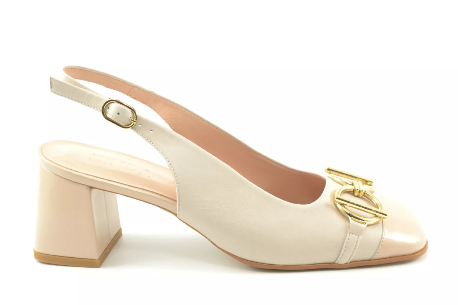 details: luxe pump van het Italiaanse merk Zinda met slingback, carre neus, lak neus en goudkleurig bitje op de voorvoet