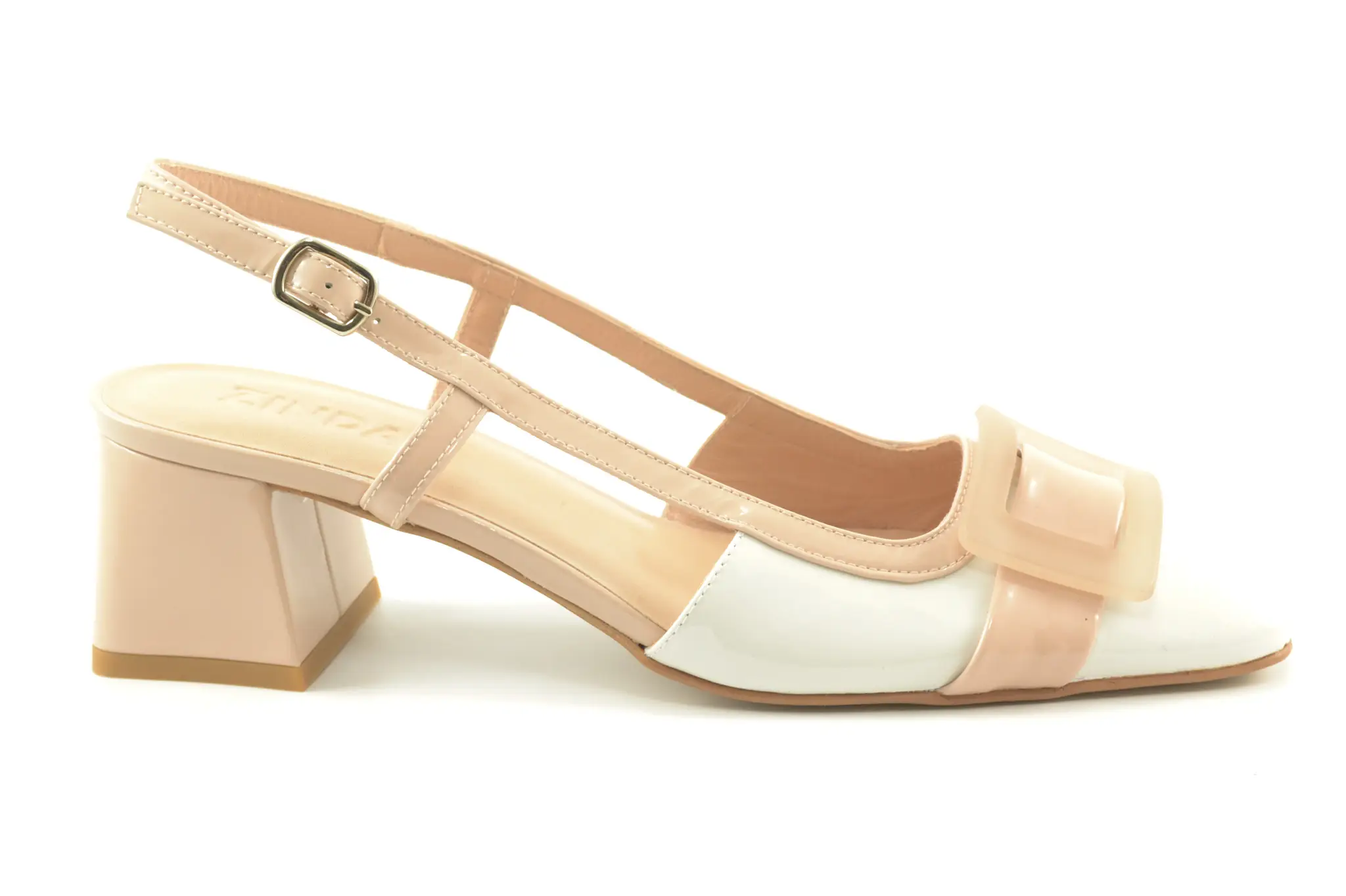 details: luxe pump van het Italiaanse merk Zinda met een slingback, blokhak, carré neus en gesp op de voorvoet